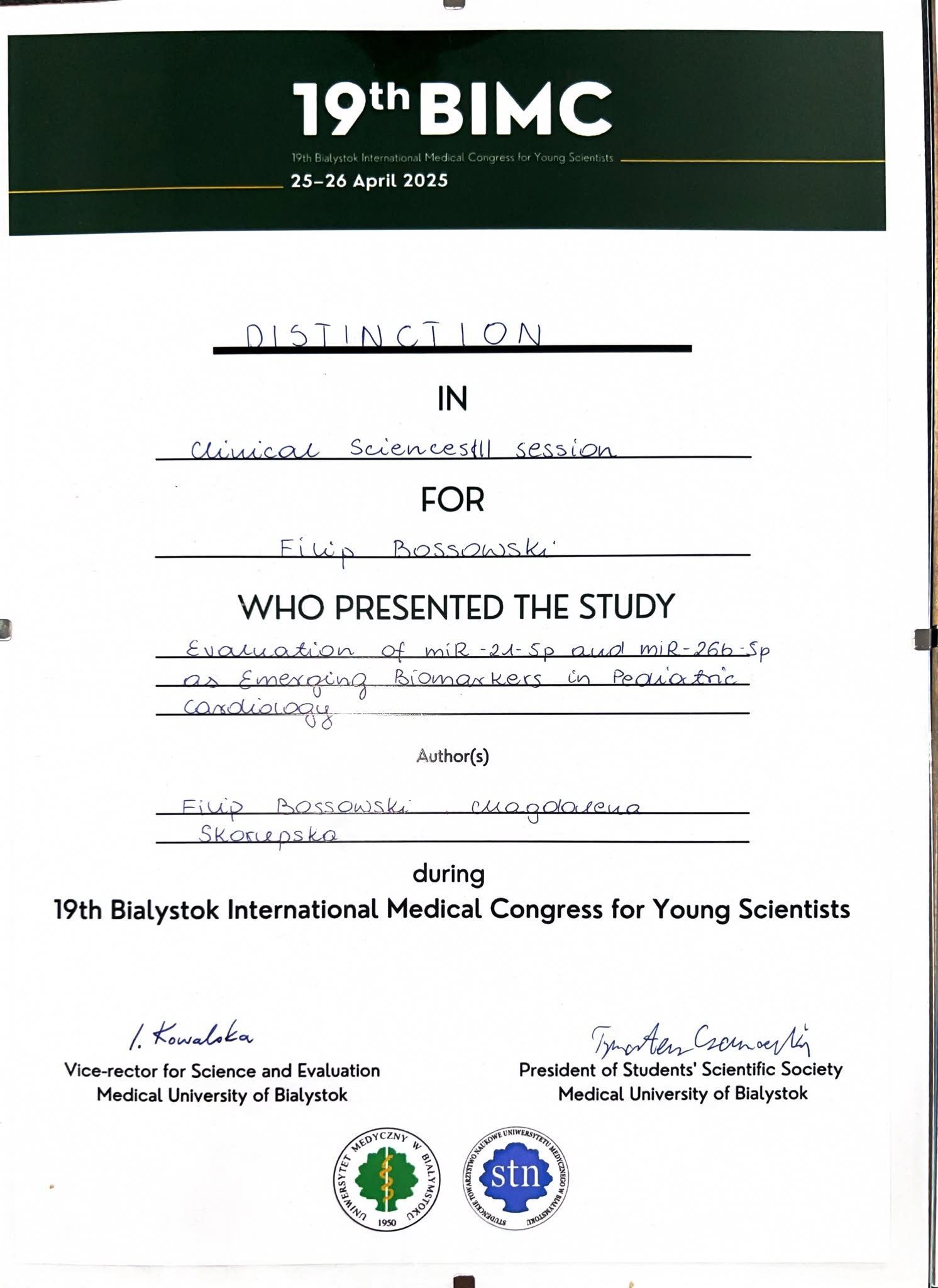 - Clinical Sciences III — Special Distinction - Filip Bossowski "Evaluation of miR-21-5p and miR-26b-5p as Emerging Biomarkers in Pediatric Cardiology "