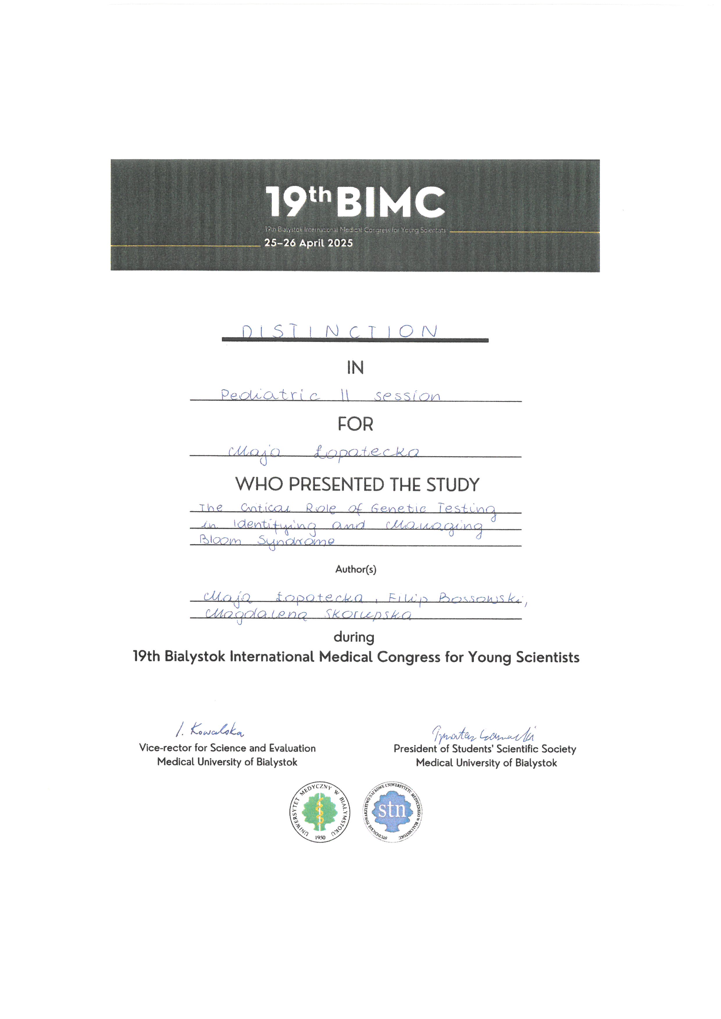 - Pediatric II — Special Distinction - Maja Łopatecka "The Critical Role of Genetic Testing in Identifying and Managing Bloom Syndrome"
