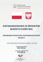 Działanie jest realizowane w ramach projektu pt.: XXI Podlaski Festiwal Nauki i Sztuki, przyjętego do finansowania w drodze konkursu ogłoszonego w dniu 29 kwietnia 2024 r. przez Ministra Nauki w ramach programu „Społeczna odpowiedzialność nauki II”, ustanowionego na podstawie art. 376 ust. 1 i ust. 2 pkt 1 ustawy z dnia 20 lipca 2018 r. Prawo o szkolnictwie wyższym i nauce (Dz. U. z 2023 r. poz. 742, z późn. zm.).