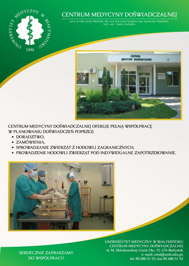 Centrum Medycyny Doświadczalnej funkcjonuje od 2006 roku i jest jedną z najnowocześniejszych w Polsce jednostek eksperymentalno-hodowlanych pozwalających na pracę ze zwierzęcymi modelami doświadczalnymi według najwyższych światowych standardów. Standardy te są potwierdzone między innymi certyfikatami Dobrej Praktyki Laboratoryjnej (DPL) w zakresie badań toksykologicznych (nr rejestracyjny certyfikatu: 30/2025/DPL