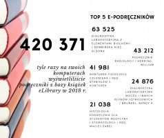 Najpopularniejsze w niej e-książki to: „Diagnostyka laboratoryjna z elementami biochemii”, autor: Aldona Dembińska-Kieć (63 tys. wejść); „Podręcznik radiologii” / William Herring (43,2 tys.) oraz „Konturek fizjologia człowieka” / red. Stanisław J. Konturek (42 tys.)