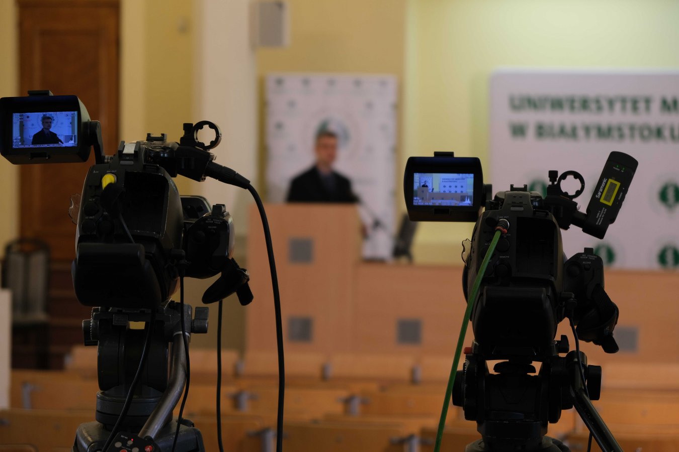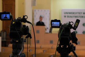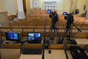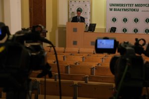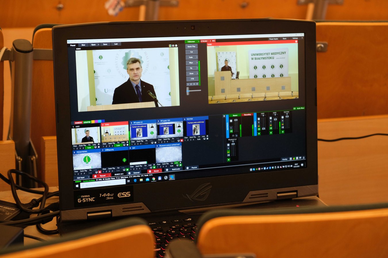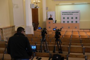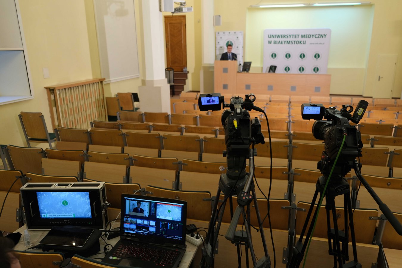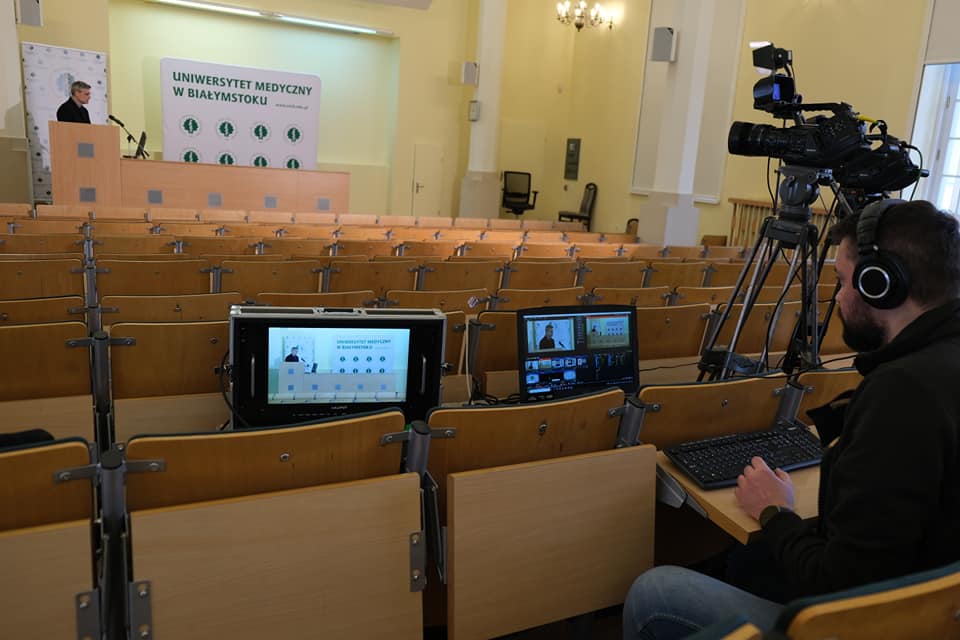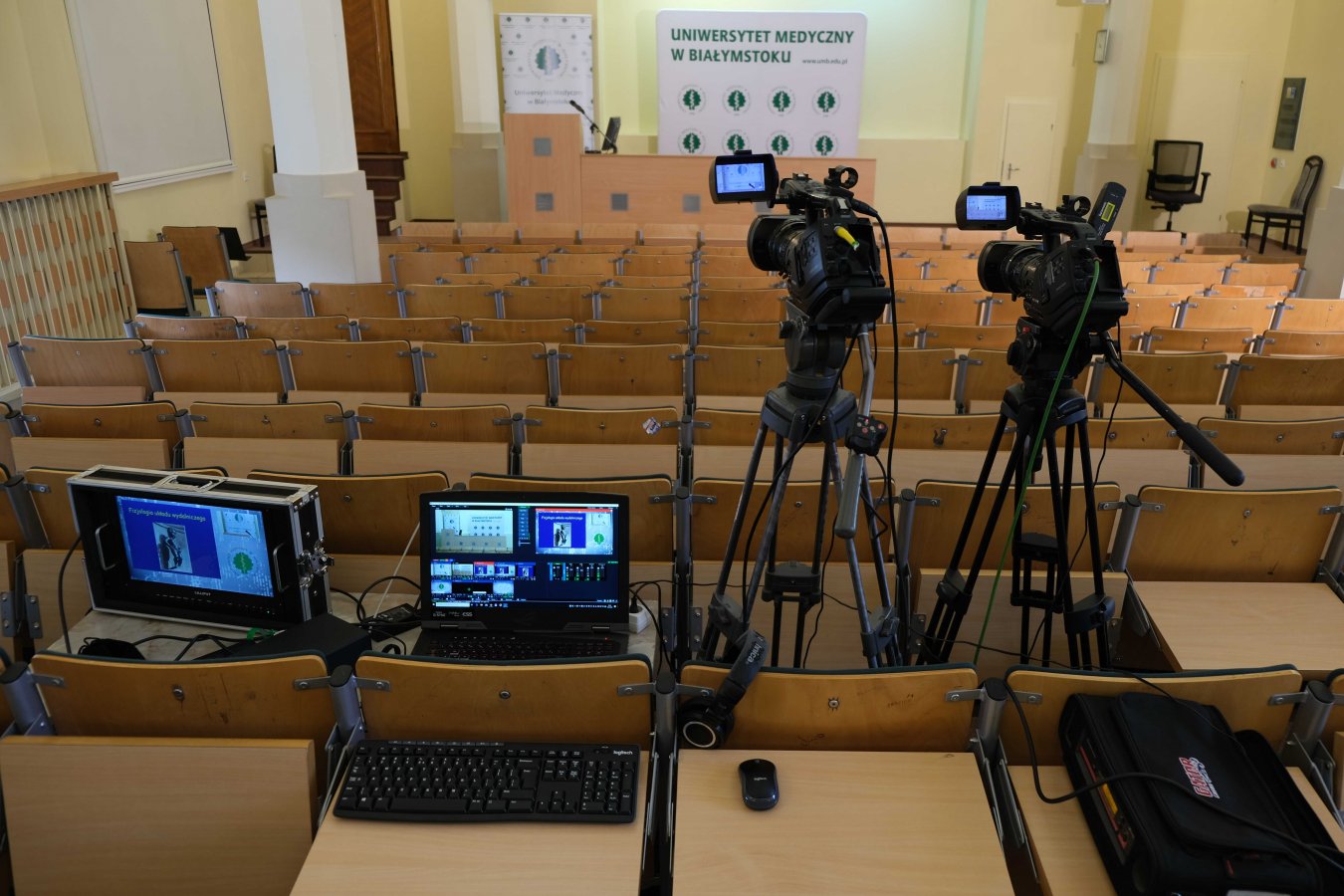 Dwie kamery, kilka monitorów, wykładowca, operator multimediów i pusta sala na ok. 200 osób - tak mniej więcej wyglądają okoliczności, w których nagrywa się wykłady na UMB. Technicznie można je od razu transmitować w internecie. Jednak poza kilkoma wyjątkami, będą one publikowane w zamkniętych grupach na uczelnianym kanale na Youtube. Jako pierwszy swoje zajęcia z fizjologii dla II roku „lekarskiego” poprowadził tak prof. Adrian Chabowski. Wykład później został udostępniony na uczelnianym kanale na Youtube. Po dwóch tygodniach od publikacji obejrzało go przeszło 5 tys. osób!