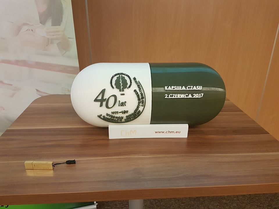 Zwieńczeniem części oficjalnej jubileuszu był tort. Jednak pamiątką ze spotkania będzie kapsuła czasu. Biało-zielony pojemnik w kształcie kapsułki z lekiem, wydrukowany w technologii 3D (dzieło firmy ChM). Zostaną w nim umieszczone wszystkie pamiątki związane z obchodami 40-lecia Wydziału Farmaceutycznego z Oddziałem Medycyny Laboratoryjnej.