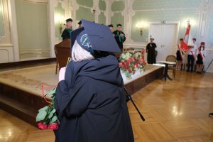 Absolwencji farmacji uhonorowali kwiatami i prezentem swoją starościnę, Justynę Jasiorowską, która z zaangażowaniem pracowała przez wiele lat na rzecz dobrej organizacji studiów i integracji kolegów i koleżanek z roku. Następnie Dziekan Wydziału Farmaceutycznego z Oddziałem Medycyny Laboratoryjnej UMB, prof. dr hab. Wojciech Miltyk odczytał tekst przysięgi, który powtórzyli absolwenci i tym samym stali się pełnoprawnymi farmaceutami.
