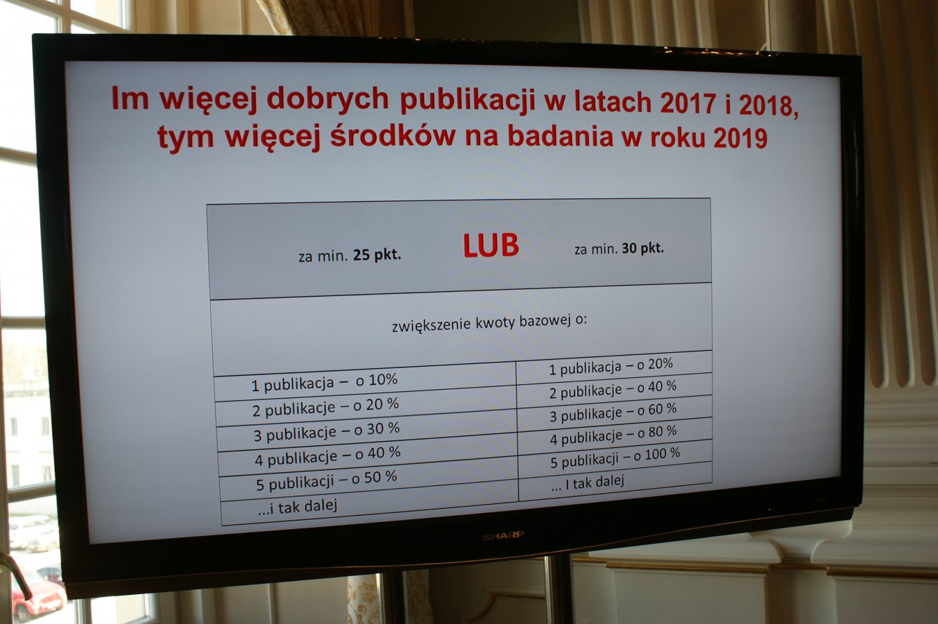 - Najkorzystniej jest, kiedy będziemy publikować prace od 100 pkt. w wzwyż. Wówczas nawet w pracach z wieloma autorami nie będzie dzielenia punktów pomiędzy nimi. Preferowane są też prace wielośrodkowe, międzynarodowe – radził prorektor Moniuszko.