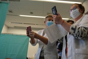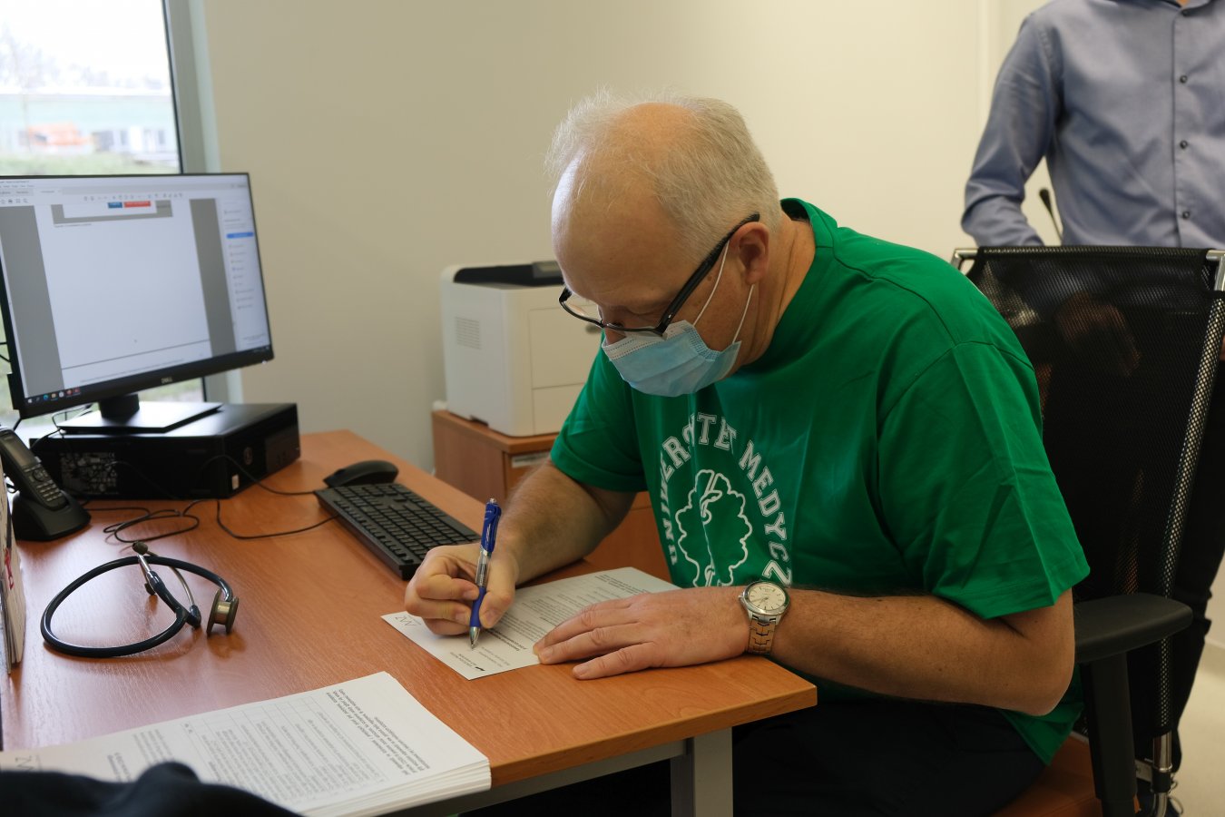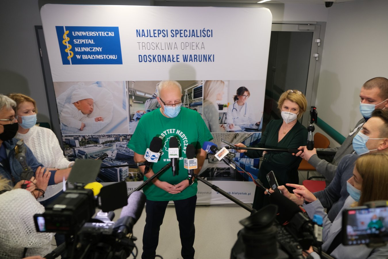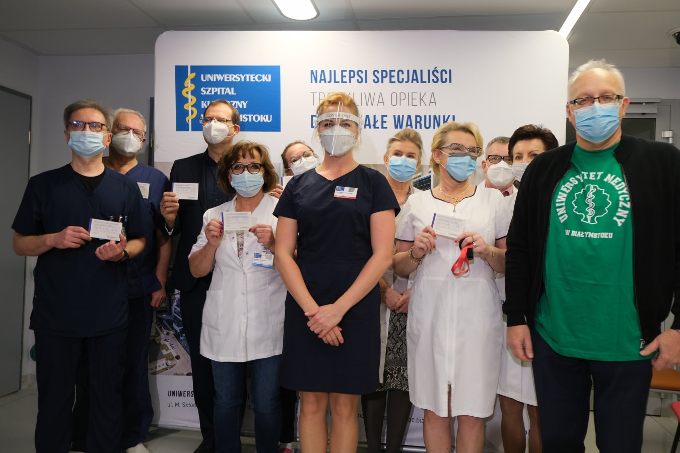 Dzień wcześniej szpital odebrał pierwszą partię szczepionek przeciw Covid19 - 225 szt. - firmy Pfizer. To niewielki kartonik. Do pierwszych szczepień wytypowano dziesięć osób. Miały dać one przykład, że szczepionki są bezpieczne. Pierwszym zaszczepionym był prof. Robert Flisiak, kierownik Kliniki Chorób Zakaźnych i Hepatologii UMB oraz prezes Polskiego Towarzystwa Epidemiologów i Lekarzy Chorób Zakaźnych. Jako drugi na fotelu usiadł rektor UMB prof. Adam Krętowski. Po nich zaszczepieni zostali kierownicy i zastępcy kierowników różnych szpitalnych klinik.
