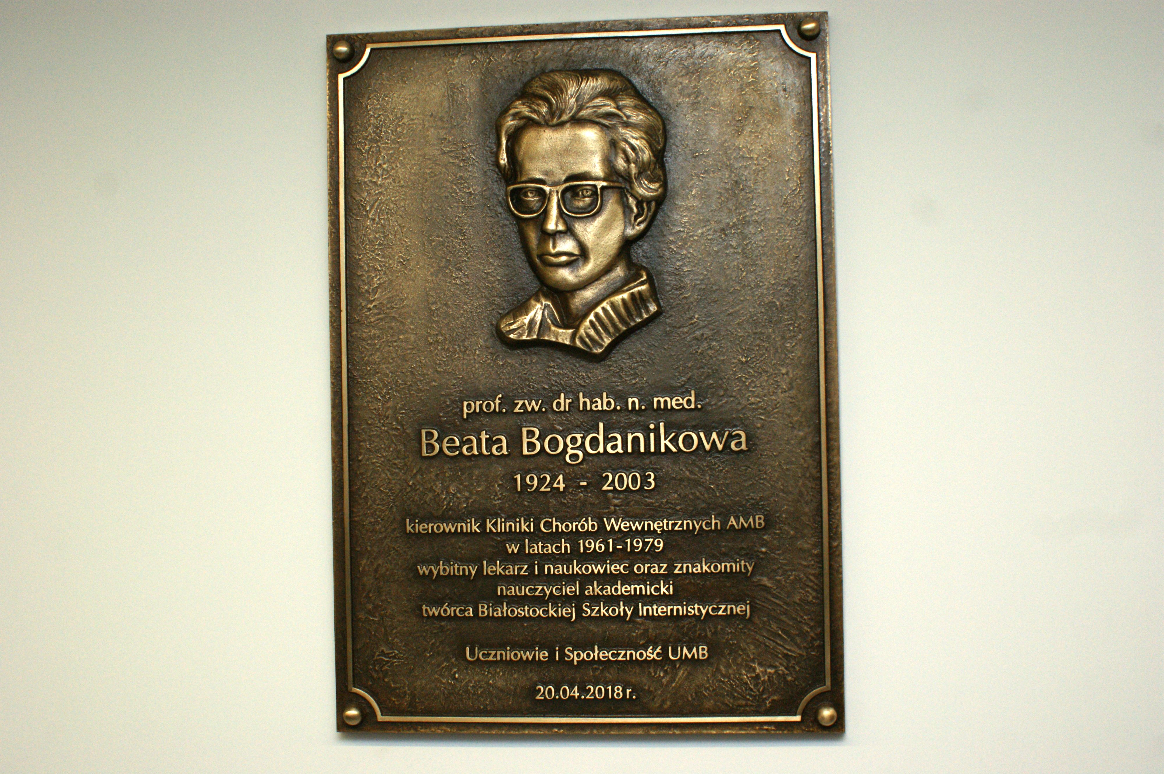 Prof. Beata Bogdanikowa absolwentka Uniwersytetu Jagiellońskiego, wybitny lekarz i naukowiec, pracowała kolejno w Krakowie, Wrocławiu, Białymstoku i Łodzi. W Białymstoku, kierując przez 18 lat Kliniką Chorób Wewnętrznych AMB, stworzyła prężny ośrodek kliniczno-dydaktyczny o wielkich osiągnięciach naukowych, często pionierskich, zwłaszcza w zakresie badań nad białkami krwi. Stanowiła przykład osoby pracowitej i energicznej, a równocześnie niezwykle skromnej, reprezentującej najwyższe wartości etyczne .Urodziła się 11 marca 1924 roku we Lwowie. W okresie II wojny światowej przeniosła się do Krakowa, gdzie skończyła studia i rozpoczęła pracę najpierw Zakładzie Chemii, a następnie Farmakologii UJ. Później była asystentką w zakładzie Patologii Ogólnej i Doświadczalnej UJ. Od 1950 roku zamieszkała we Wrocławiu, gdzie została zatrudniona jako starszy asystent w III Klinice Chorób Wewnętrznych AM. Pracując przez 11 lat pod kierunkiem wybitnego internisty Profesora Edwarda Szczeklika, zdobyła wielkie doświadczenie kliniczne, jak też wszechstronnie opanowała warsztat pracy naukowej.