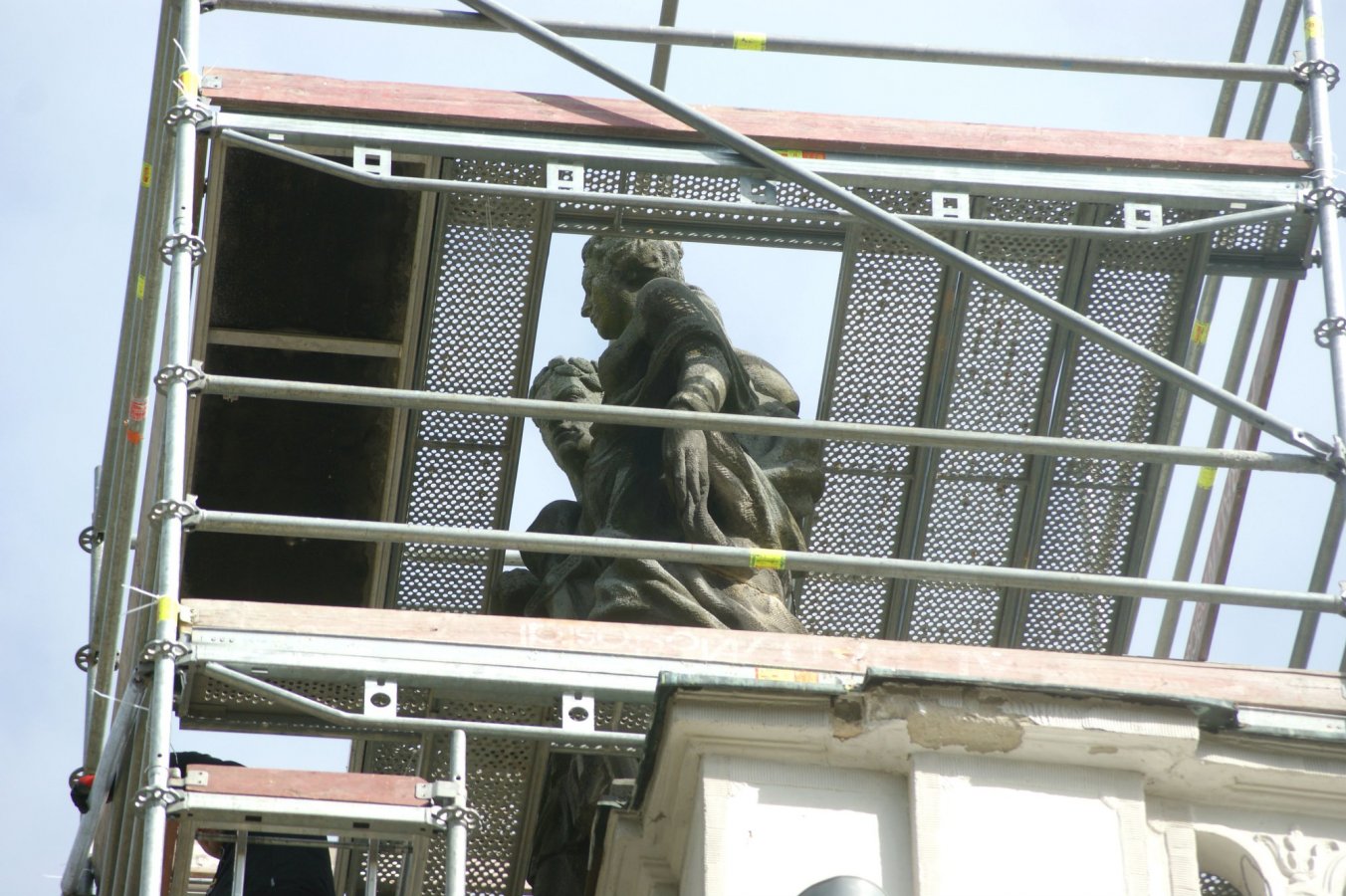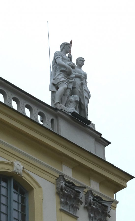 Obie rzeźby zostały wykonane przez zespół pod kierunkiem Stanisława Kiliszka w ramach rekonstrukcji pałacu po zniszczeniach II wojny światowej. Pierwowzorem były prawdopodobnie barokowe, drewniane rzeźby projektu J. Zygmunta Deybla z pierwszej połowy XVIII w.