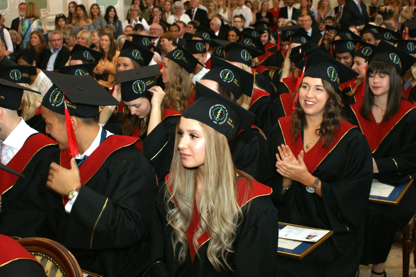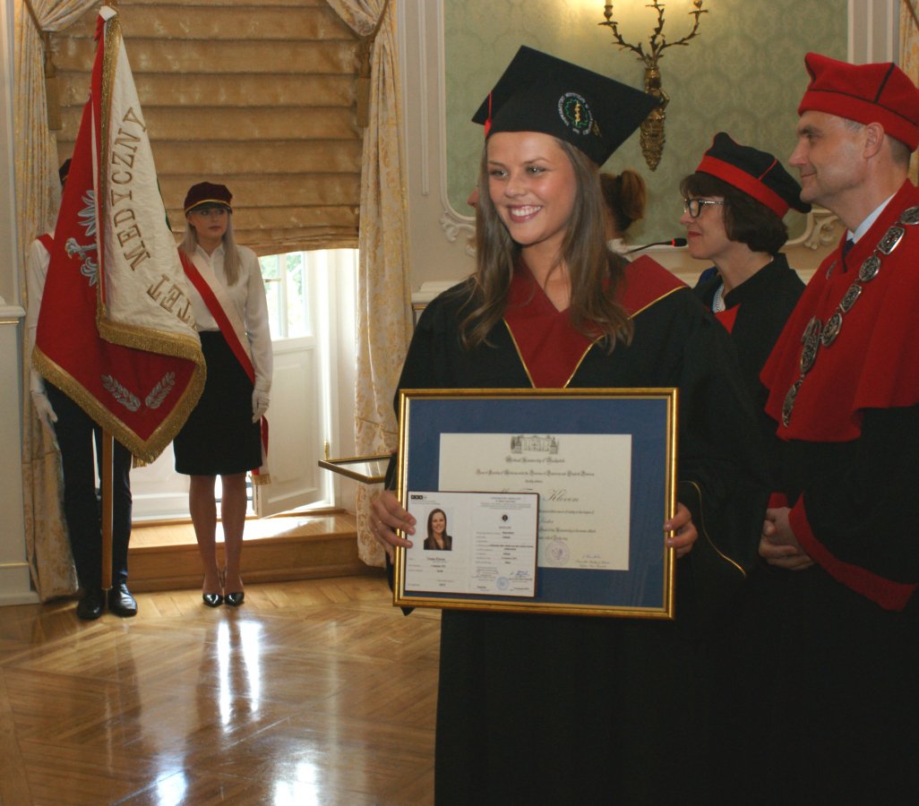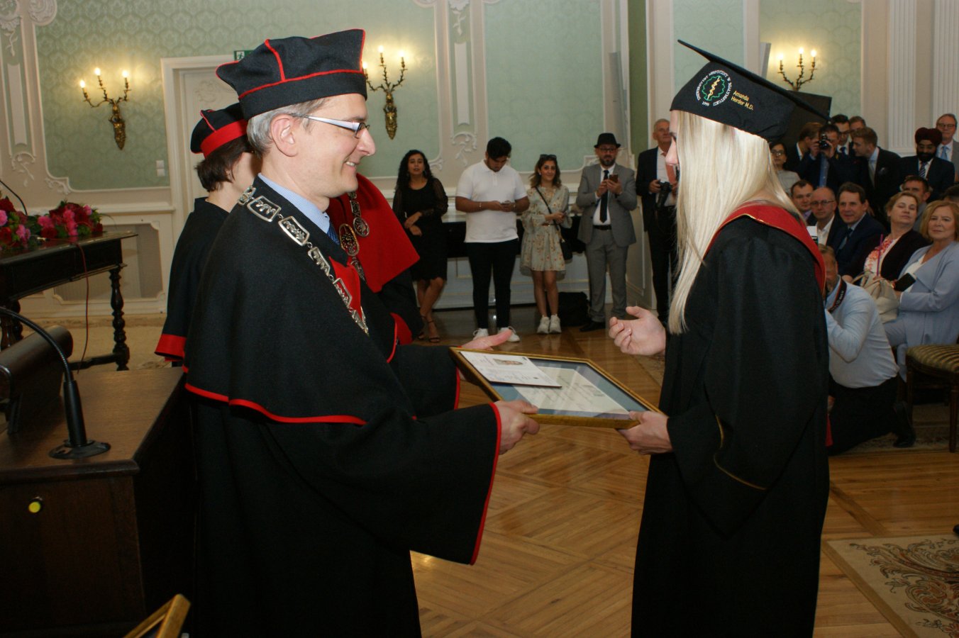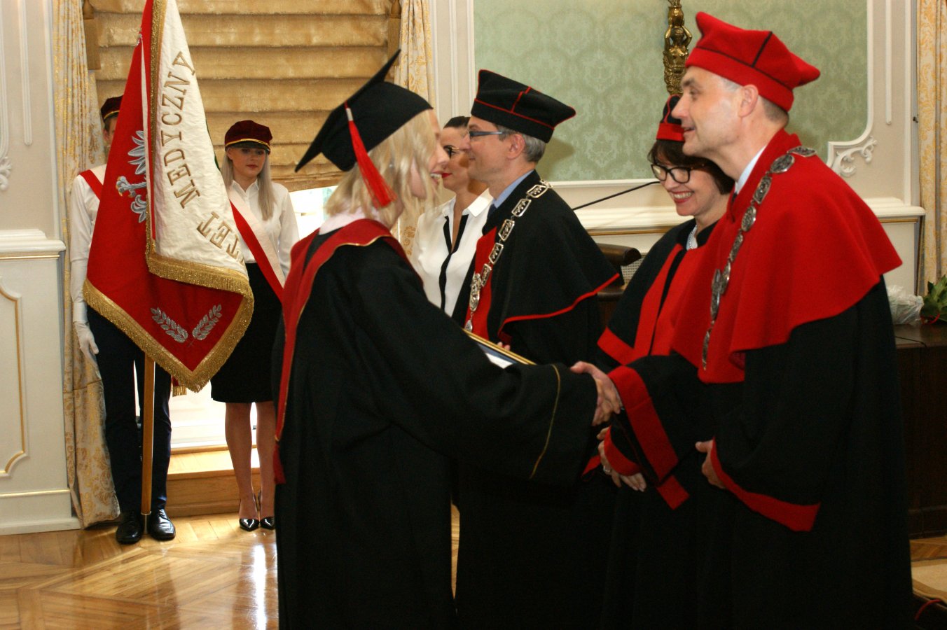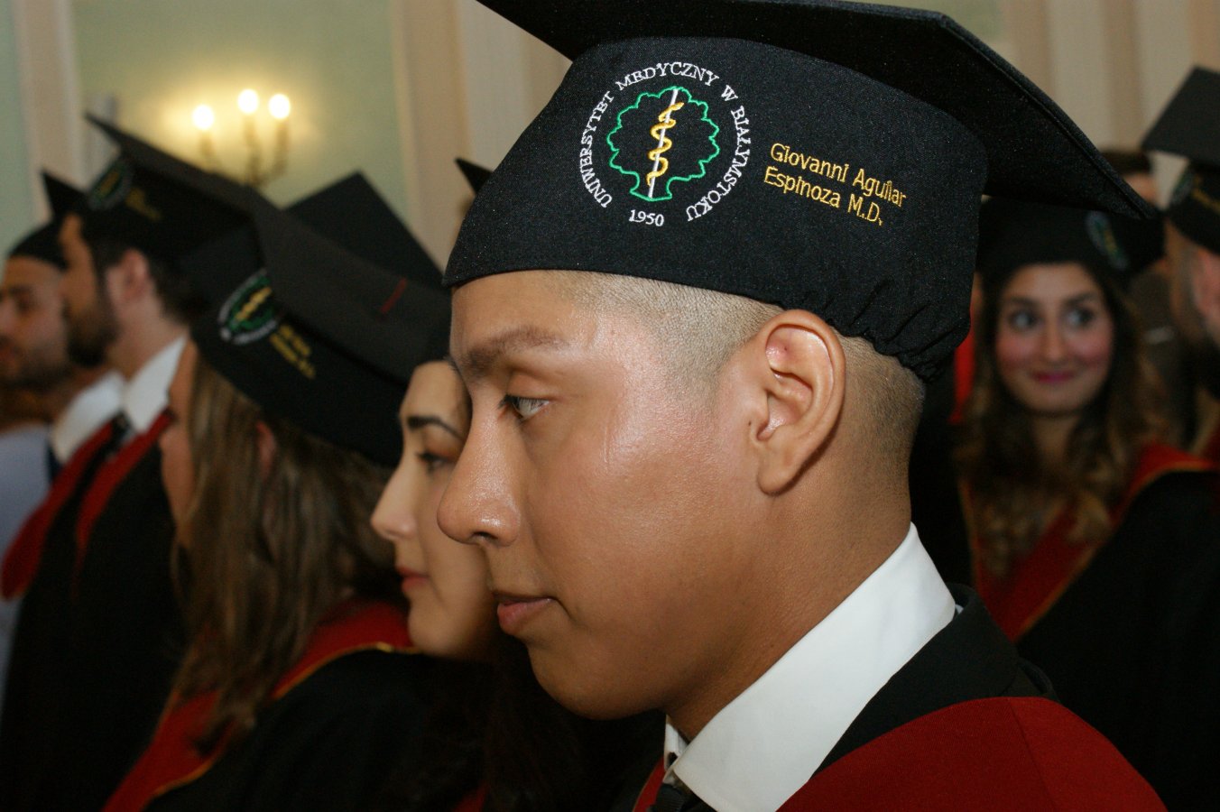 Uroczystość rozdania dyplomów miała bardzo okazałą oprawę. Odbywała się w reprezentacyjnej Aula Magna, którą szczelnie wypełnili przybyli z całego świata bliscy studentów. Absolwenci ubrani byli w czarne togi z czerwonymi elementami, a na głowach - birety z haftowanym logo uczelni, ale też własnym imieniem oraz skrótem „MD” potwierdzającym, że są już lekarzami.