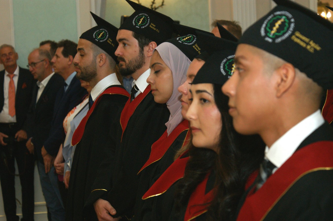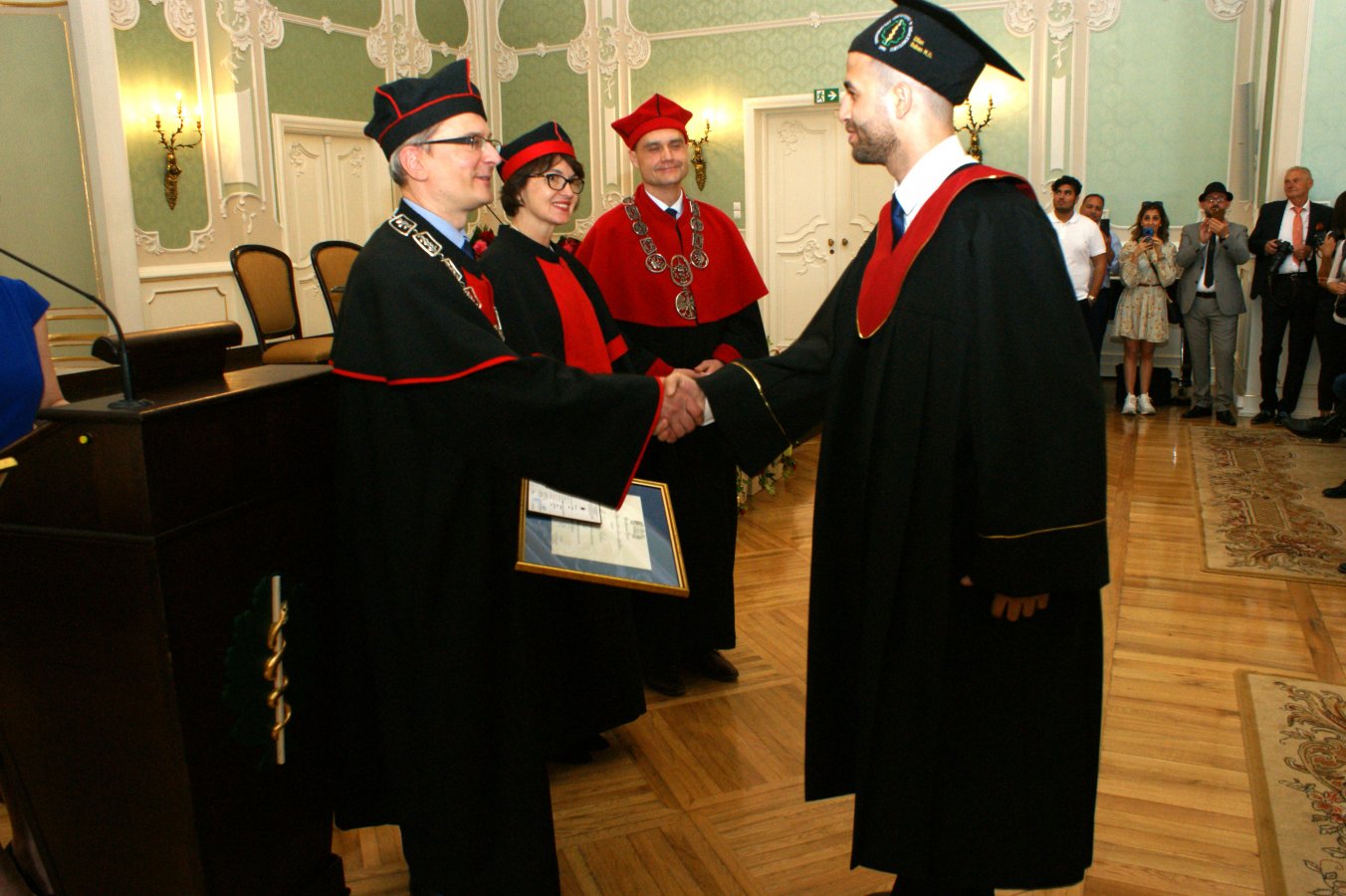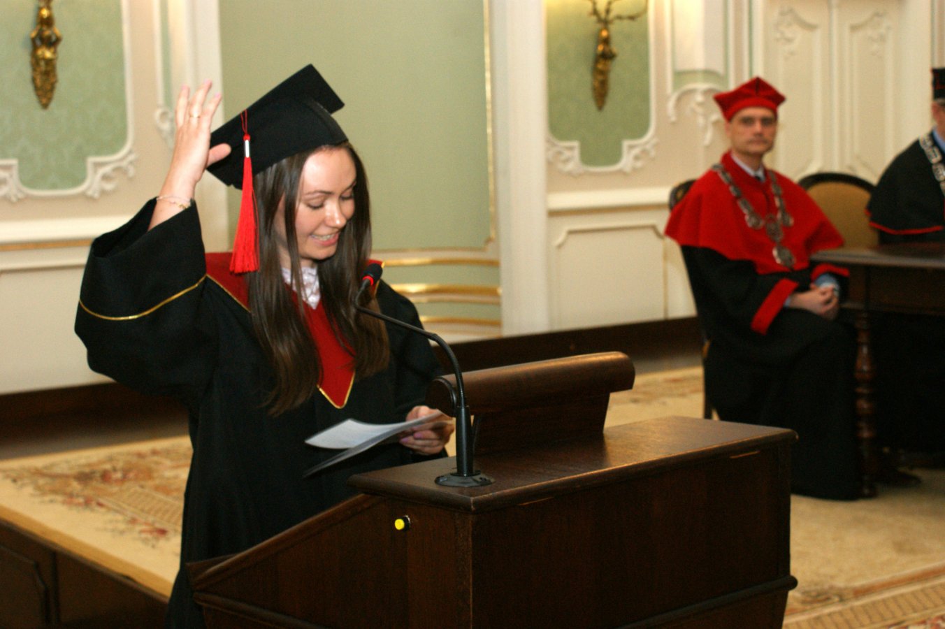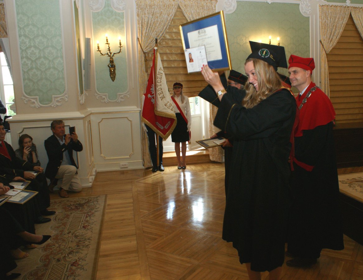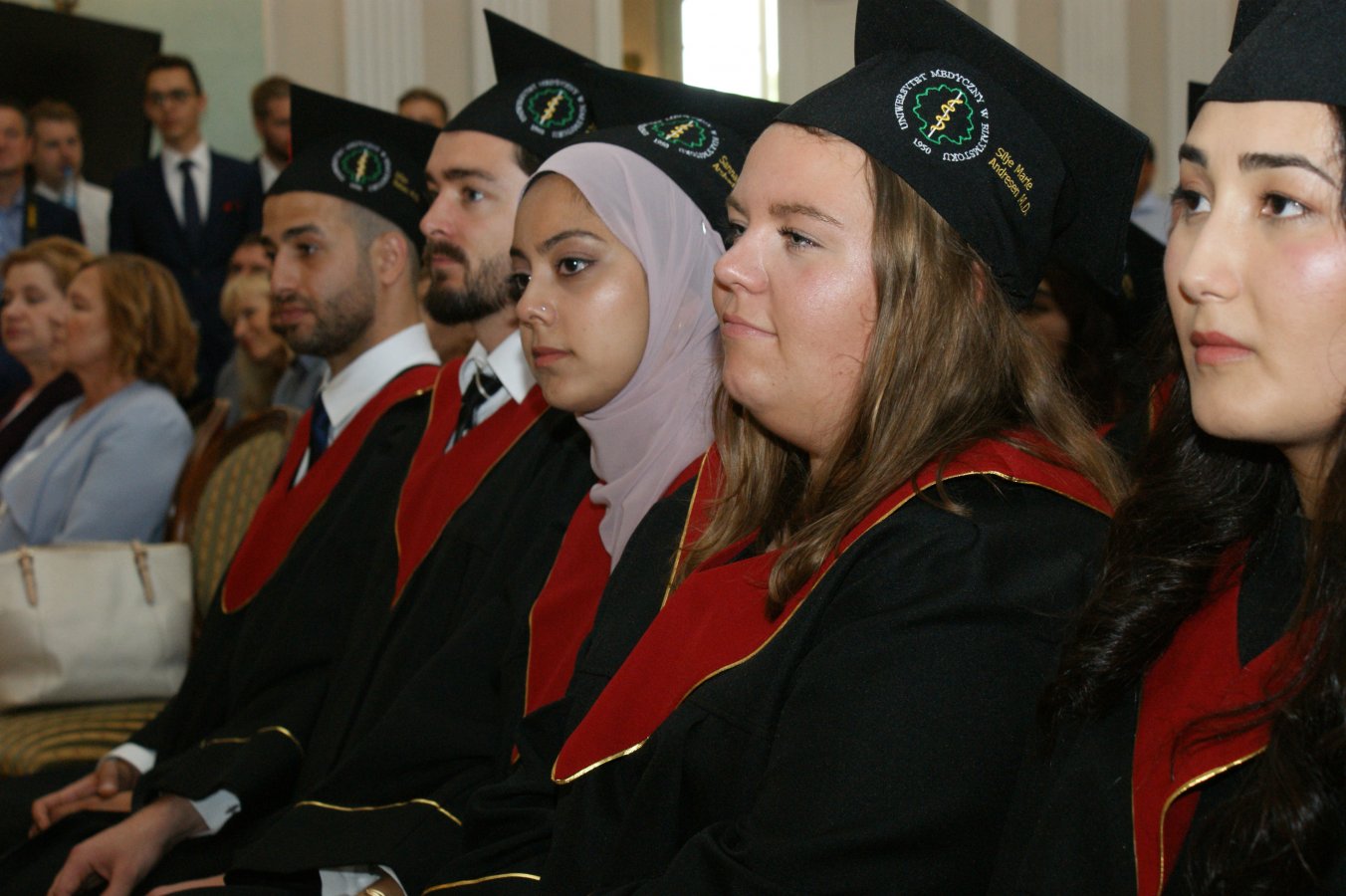Uroczystość rozdania dyplomów miała bardzo okazałą oprawę. Odbywała się w reprezentacyjnej Aula Magna, którą szczelnie wypełnili przybyli z całego świata bliscy studentów. Absolwenci ubrani byli w czarne togi z czerwonymi elementami, a na głowach - birety z haftowanym logo uczelni, ale też własnym imieniem oraz skrótem „MD” potwierdzającym, że są już lekarzami.