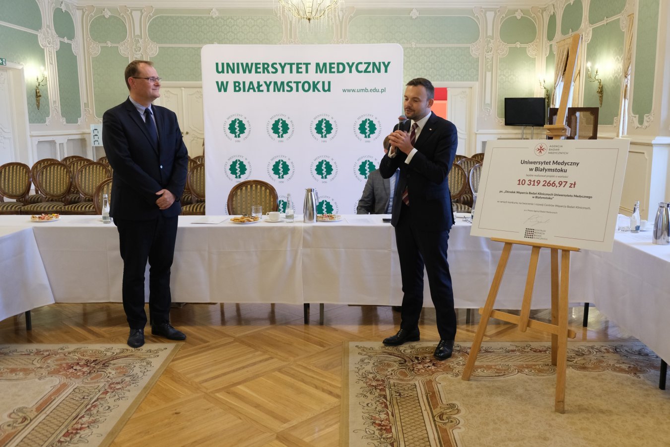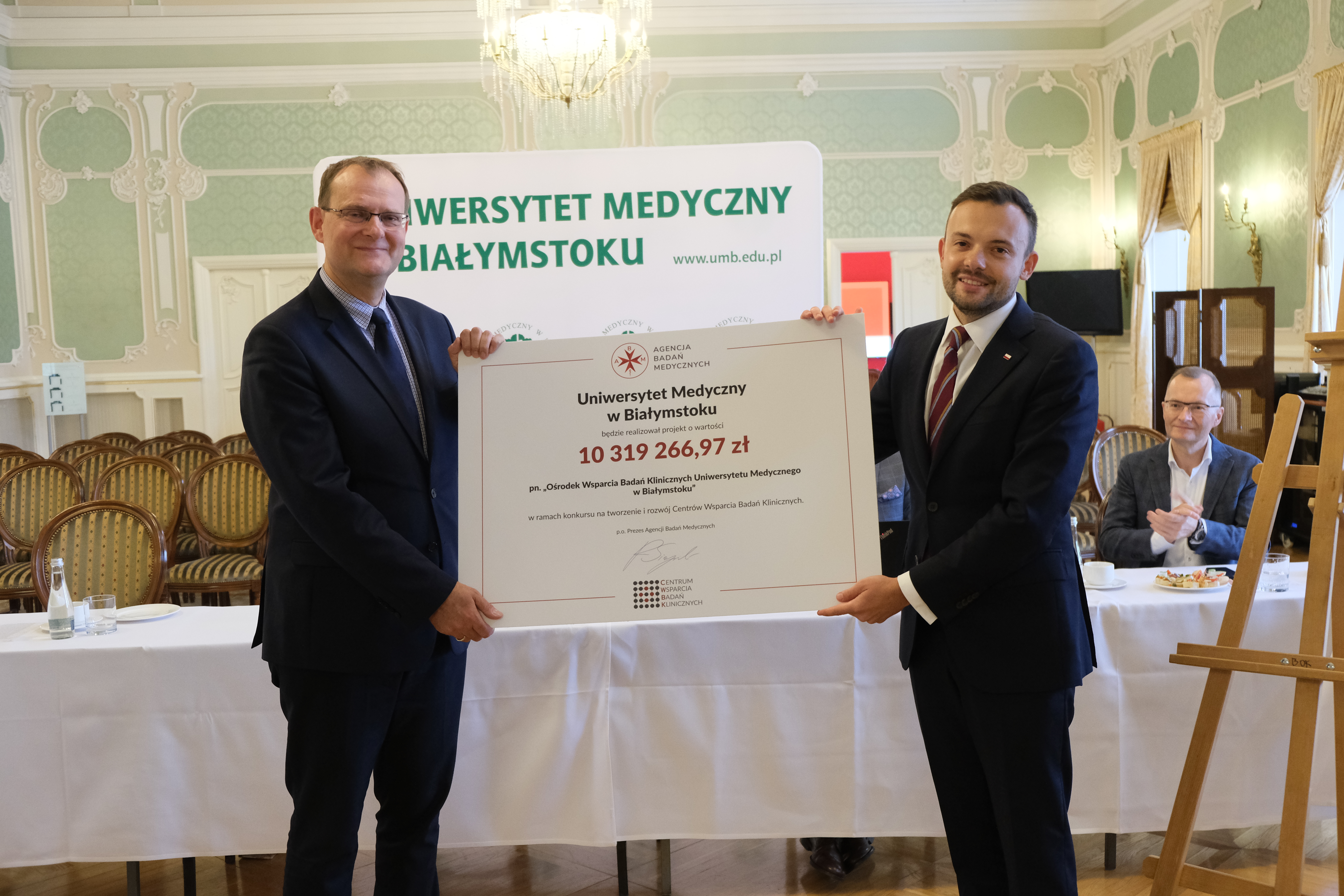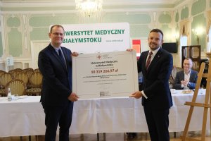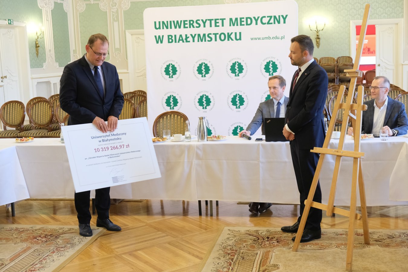 Spotkanie było okazją do wręczenia symbolicznego czeku na stworzenie Ośrodka Wsparcia Badań Klinicznych UMB (to wydarzenie z powodu pandemii też odbyło się z opóźnieniem). 10,3 mln zł już są wydatkowane na stworzenie ośrodka.