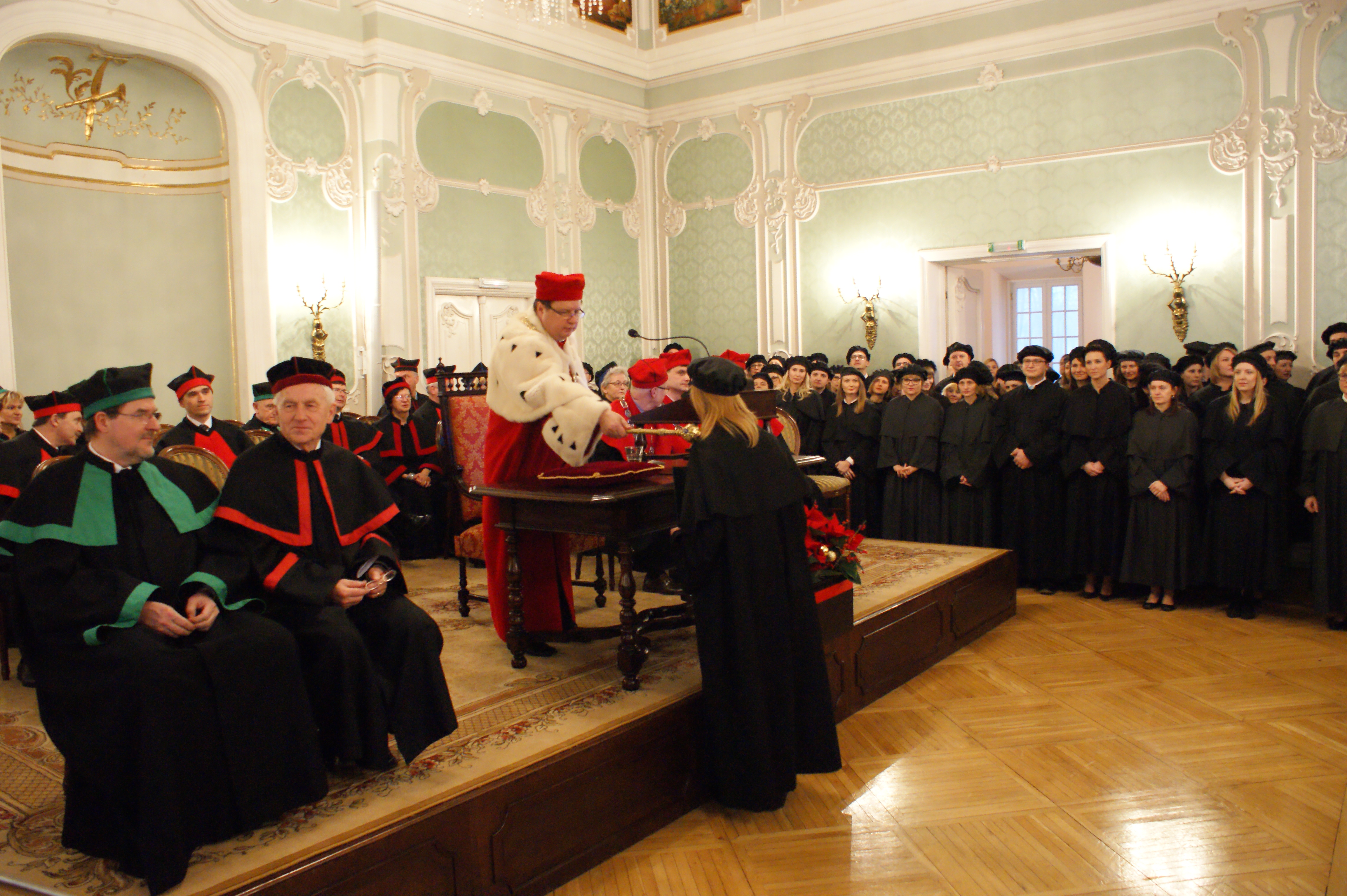 Po jego lewej stronie zgromadzili się nowi doktoranci. Po prawej - doktorzy habilitowani. Wszyscy ubrani w stosowne togi.