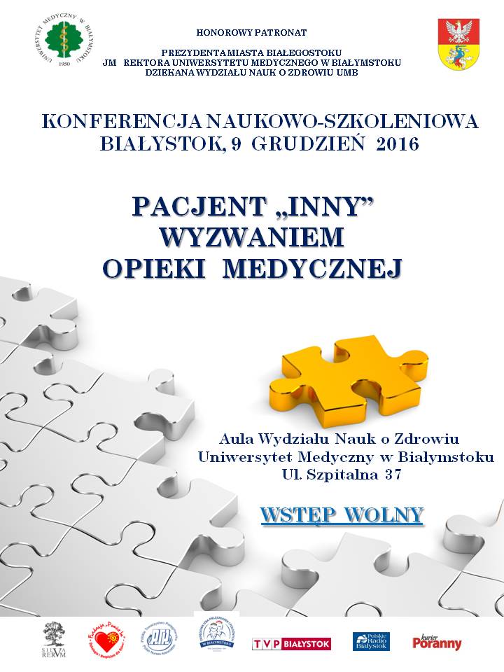 9 grudnia 2016 roku na Wydziale Nauk o Zdrowiu odbyła się Konferencja Naukowo-Szkoleniowa Pacjent „Inny” Wyzwaniem Opieki Medycznej, zorganizowana przez: Wydział Nauk o Zdrowiu UMB, Zakład Zintegrowanej Opieki Medycznej UMB, Wydawnictwo Silva Rerum, Fundację "Pomóż Im" na rzecz Dzieci z Chorobami Nowotworowymi i Hospicjum dla Dzieci w Białymstoku, Polskie Towarzystwo Pielęgniarskie Koło UMB, Okręgową Izbę Pielęgniarek i Położnych w Białymstoku.