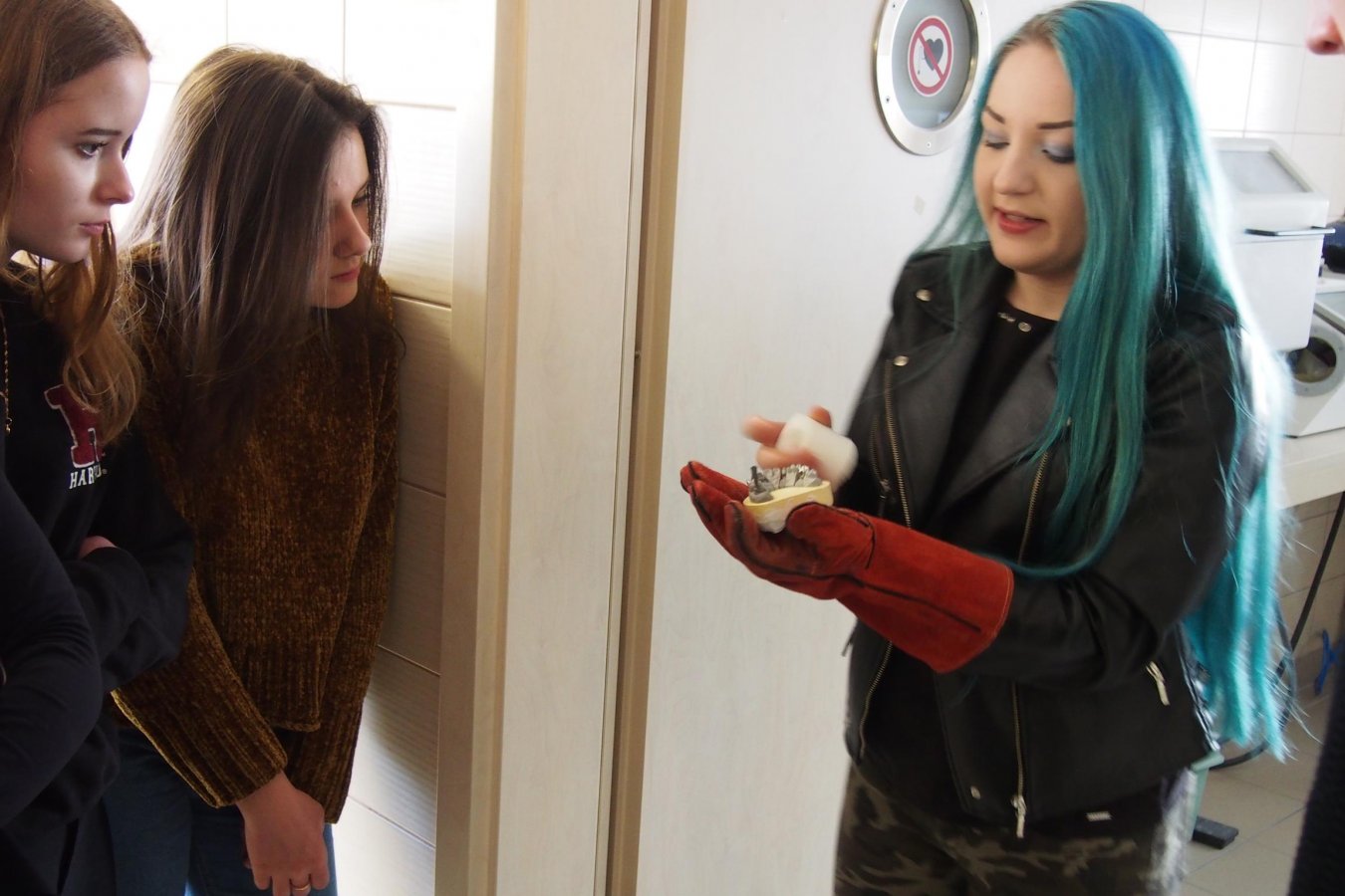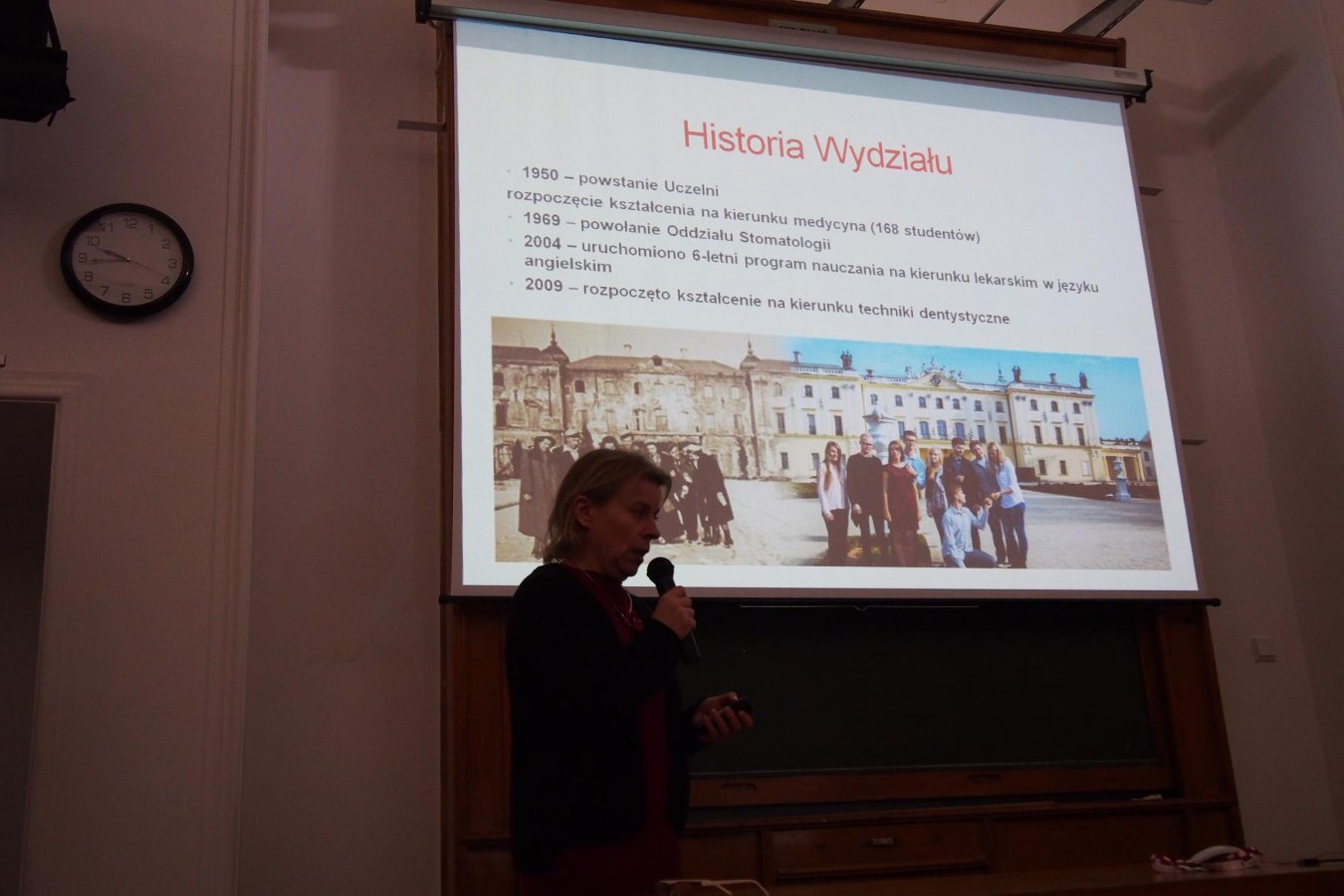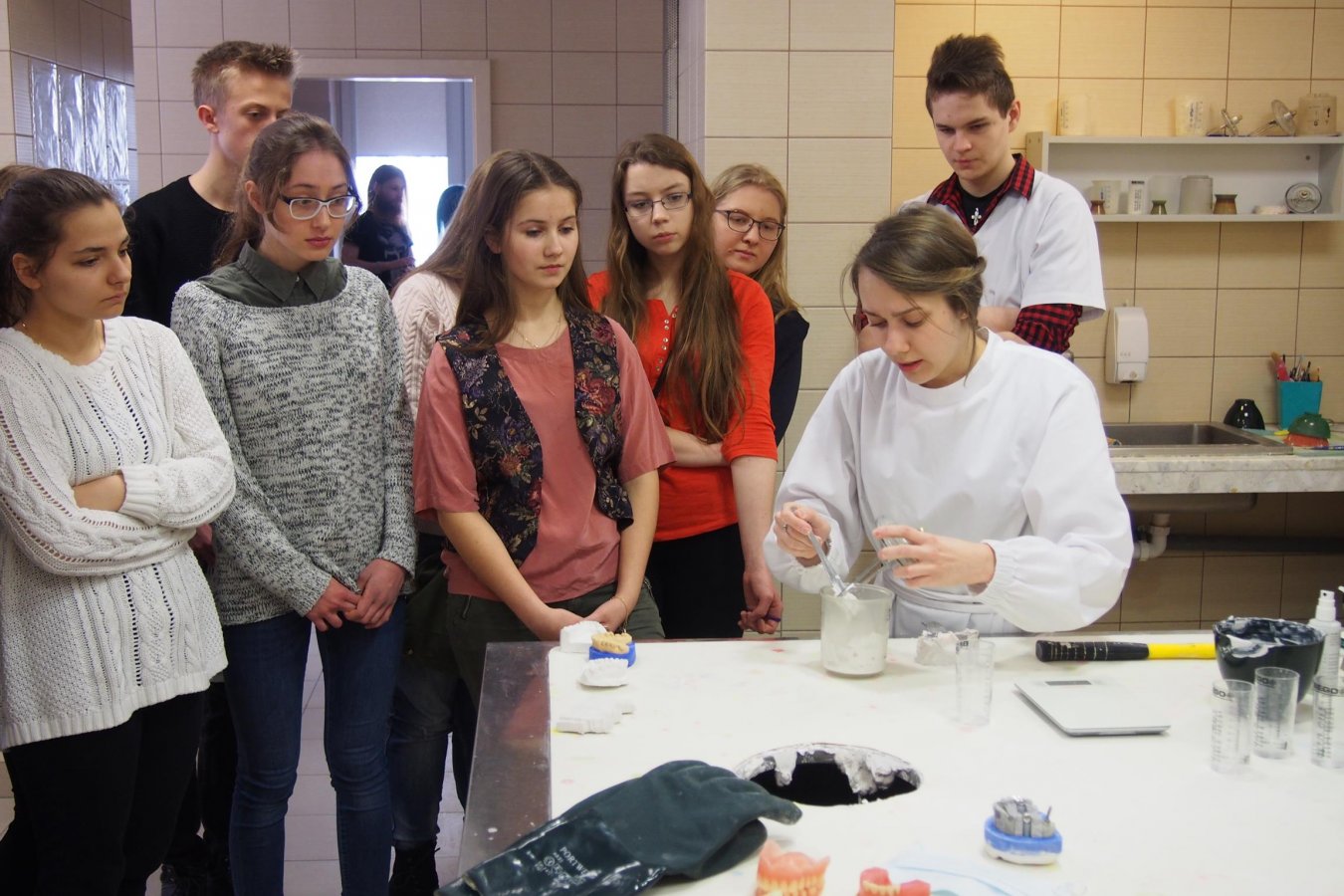 Uczniowie uczestniczyli w prezentacji prowadzonej przez dr hab. Teresę Sierpińską, Prodziekan ds. Jakości Kształcenia, Programów Studiów i Oddziału Stomatologii, Kierownika Zakładu Technik Dentystycznych, a także w wykładzie dr Doroty Namiot, Adiunkta Katedry Protetyki Stomatologicznej.
