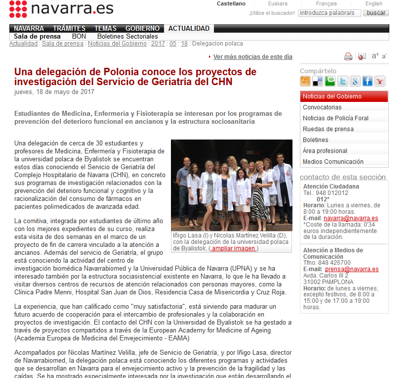 Na zakończenie odbyły się dwie wizyty studyjne: krajowa (Podlaskie Centrum Psychogeriatrii w Białymstoku i zagraniczna. O drugiej wizycie (23 osoby w II turach), w Sociedad Navarra Geriatría y Gerontología - Servicio de Geriatría del Complejo Hospitalario de Navarra (CHN) w Pampelunie (Hiszpania), pisała lokalna, hiszpańska prasa: