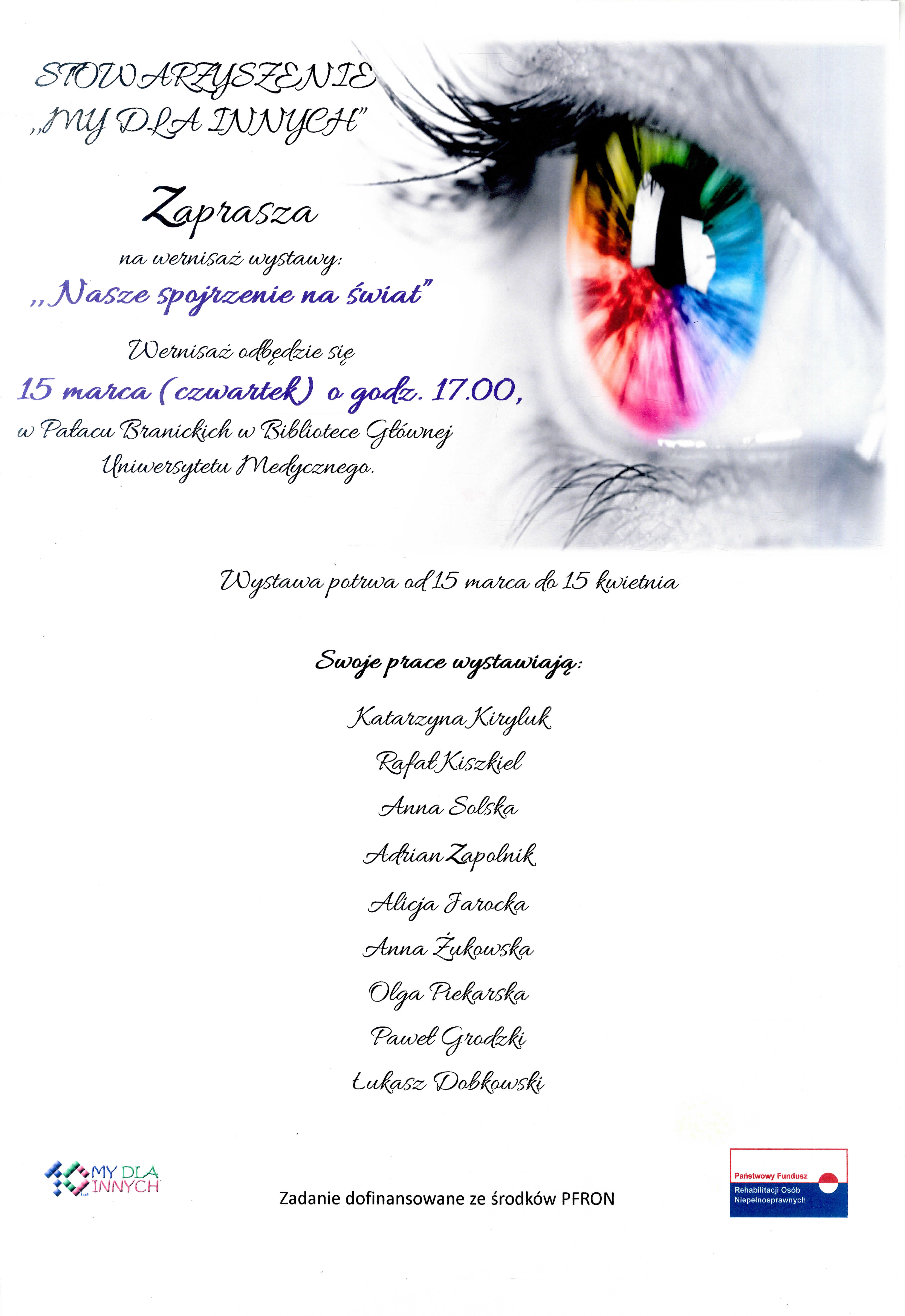 Stowarzyszenie "My Dla Innych" zaprasza na wernisaż wystawy "Nasze spojrzenie na świat", który odbędzie się 15 marca 2018 roku (czwartek) o godz. 17.00 w Bibliotece Głównej Uniwersytetu Medycznego w Białymstoku (Pałac Branickich).