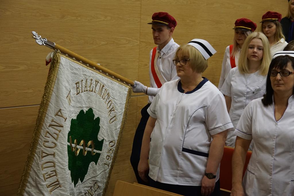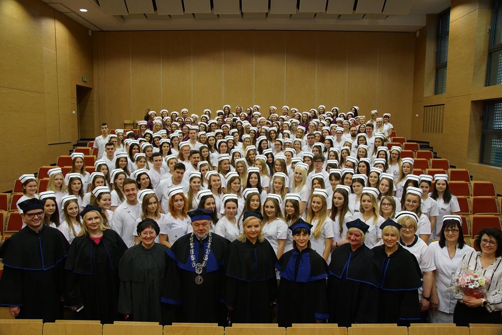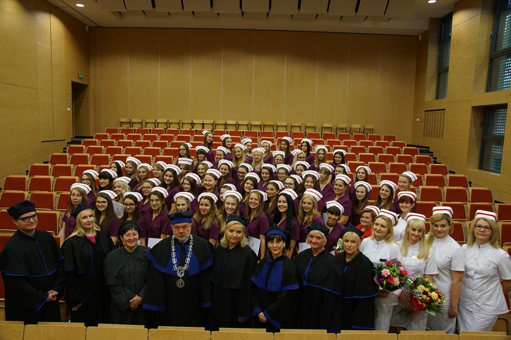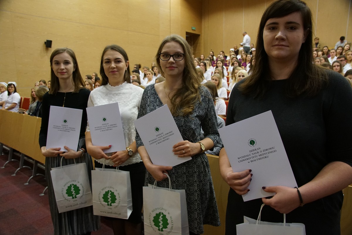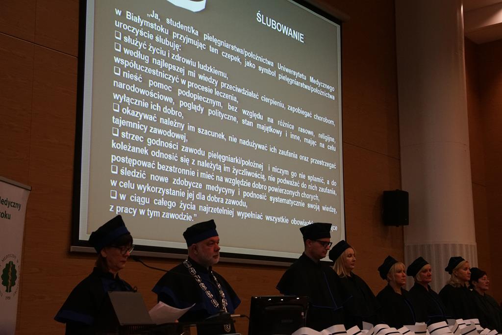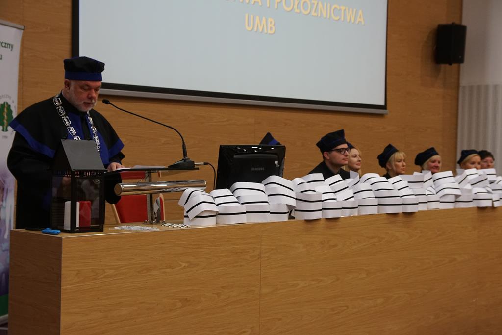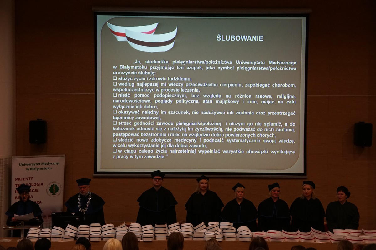 Uroczyste posiedzenie Rady Wydziału Nauk o Zdrowiu Uniwersytetu Medycznego w Białymstoku odbyło się dzisiaj w Auli Centrum Dydaktyczno – Naukowego WNOZ. Podczas wydarzenia blisko 130 studentek i studentów Pielęgniarstwa, oraz blisko 60 Położnictwa na studiach I stopnia złożyło ślubowanie i zostało udekorowanych czepkami. Ponadto z rąk Dziekana Wydziału, prof. dr hab. Sławomira Terlikowskiego kilkoro absolwentów z najwyższą średnią odebrało Honorowe Dyplomy Rektora: