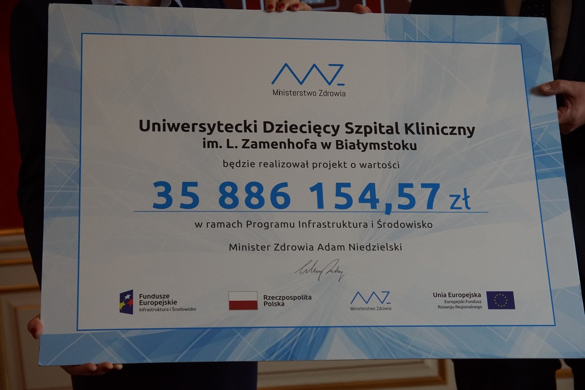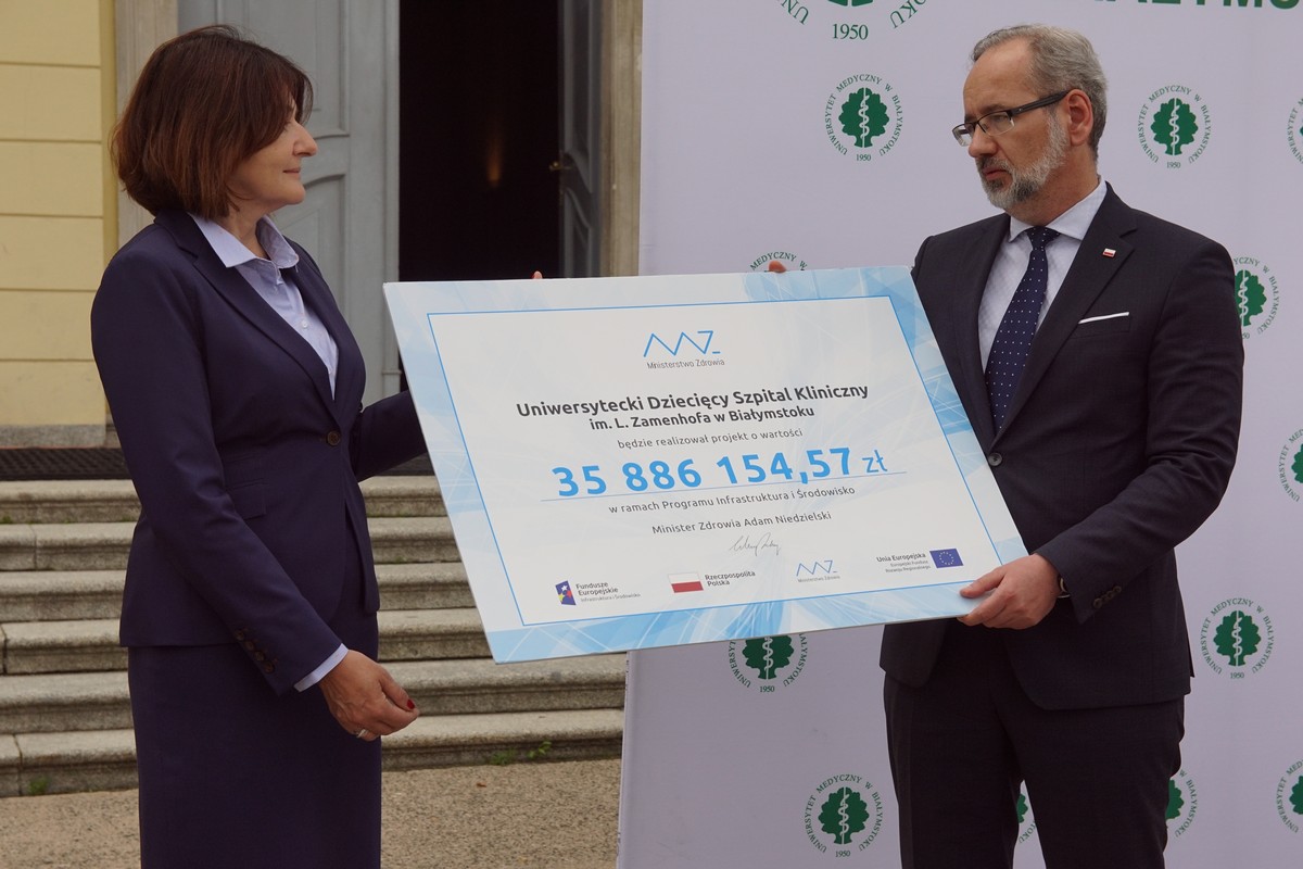 Wcześniej Minister A. Niedzielski podczas konferencji prasowej przed pałacem wręczył dyrektor UDSK, prof. dr hab. Annie Wasilewskiej symboliczny czek na kwotę 35,8 mln. złotych. Dzięki tym pieniądzom możliwa będzie największa inwestycja od momentu powstania Uniwersyteckiego Dziecięcego Szpitala Klinicznego. Projekt pn. „Rozbudowa i przebudowa istniejącego budynku Uniwersyteckiego Dziecięcego Szpitala Klinicznego w Białymstoku” finansowany jest z funduszy Unii Europejskiej (POiŚ) oraz Budżetu Państwa ( MZ). Jego celem jest przeprowadzenie prac budowlanych oraz zakup wyposażenia medycznego i sanitarnego, które umożliwią dostosowanie infrastruktury 8 Klinik szpitala do wymagań rozporządzenia Ministra Zdrowia z 26 marca 2019 r., w sprawie szczegółowych wymagań, jakim powinny odpowiadać pomieszczenia i urządzenia podmiotu wykonującego działalność leczniczą. Modernizacją objęte będą kliniki: