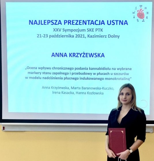 w eksperymentalnym modelu nadciśnienia płucnego. Nadciśnienie płucne jest złożoną, przewlekłą i wieloczynnikową chorobą, która może prowadzić do niewydolności prawej komory serca i przedwczesnego zgonu. Kannabidiol, związek wyizolowany z Cannabis sativa, cechuje się brakiem właściwości odurzających, niską toksycznością oraz właściwościami przeciwzapalnymi. Celem badań Doktorantki była ocena wpływu kannabidiolu na stężenia wybranych markerów stanu zapalnego i przebudowy w płucach u szczurów z nadciśnieniem płucnym indukowanym monokrotaliną. W eksperymentach Doktorantka wykorzystała szereg metod i technik badawczych: oznaczenia immunohistochemiczne, immunoenzymatyczne oraz Western Blot. Wykazała, że kannabidiol, zmniejszał stan zapalny i przebudowę w płucach szczurów z nadciśnieniem płucnym. Wyniki te dają nadzieję, że kannabidiol znajdzie zastosowanie w terapii wspomagającej leczenie nadciśnienia płucnego, które w dalszym ciągu pozostaje chorobą wyniszczającą i nieuleczalną.