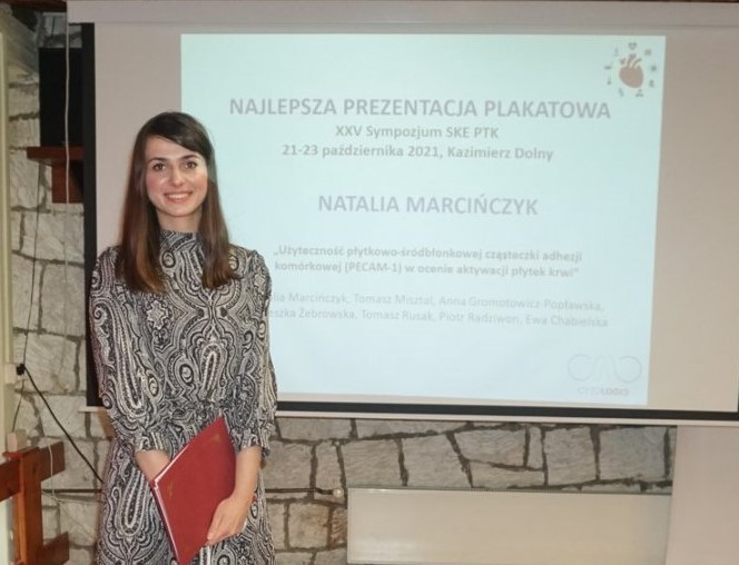 Tytuł prezentacji: "Użyteczność płytkowo-śródbłonkowej cząsteczki adhezji komórkowej 1 (PECAM-1) w ocenie aktywacji płytek krwi". Dr Natalia Marcińczyk przedstawiła na Sympozjum wyniki badań przeprowadzonych w eksperymentalnym modelach zakrzepicy, w których zaproponowała nowy marker, współczynnik PECAM/zakrzep, służący do oceny aktywacji płytek krwi. Płytkowo-śródbłonkowa cząsteczka adhezji komórkowej (PECAM-1) jest glikoproteiną obecną na powierzchni m.in. płytek krwi. Wykorzystując zarówno krew mysią (ex vivo), jak i ludzką (in vitro) Doktor Marcińczyk wykazała użyteczność parametru PECAM-1/zakrzep w ocenie aktywności płytek krwi tworzących zakrzep. Wyniki te wskazują na uniwersalne zastosowanie parametru i translacyjny charakter badań, które wykonała. Współczynnik ten może w przyszłości zostać wykorzystany do diagnostyki zaburzeń hemostazy, jak również monitorowania skuteczności terapii przeciwzakrzepowej.