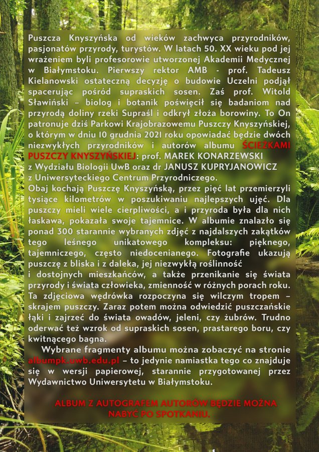 Puszcza Knyszyńska od wieków zachwyca przyrodników, pasjonatów przyrody, turystów. W latach 50. XX wieku pod jej wrażeniem byli profesorowie utworzonej Akademii Medycznej w Białymstoku. Pierwszy rektor AMB - prof. Tadeusz Kielanowski ostateczną decyzję o budowie Uczelni podjął spacerując pośród supraskich sosen. Zaś prof. Witold Sławiński – biolog i botanik poświęcił się badaniom nad przyrodą doliny rzeki Supraśl i odkrył złoża borowiny. To On patronuje dziś Parkowi Krajobrazowemu Puszczy Knyszyńskiej, o którym w dniu 10 grudnia 2021 roku opowiadać będzie dwóch niezwykłych przyrodników i autorów albumu Ścieżkami Puszczy Knyszyńskiej: prof. Marek Konarzewski z Wydziału Biologii UwB oraz dr Janusz Kupryjanowicz z Uniwersyteckiego Centrum Przyrodniczego.