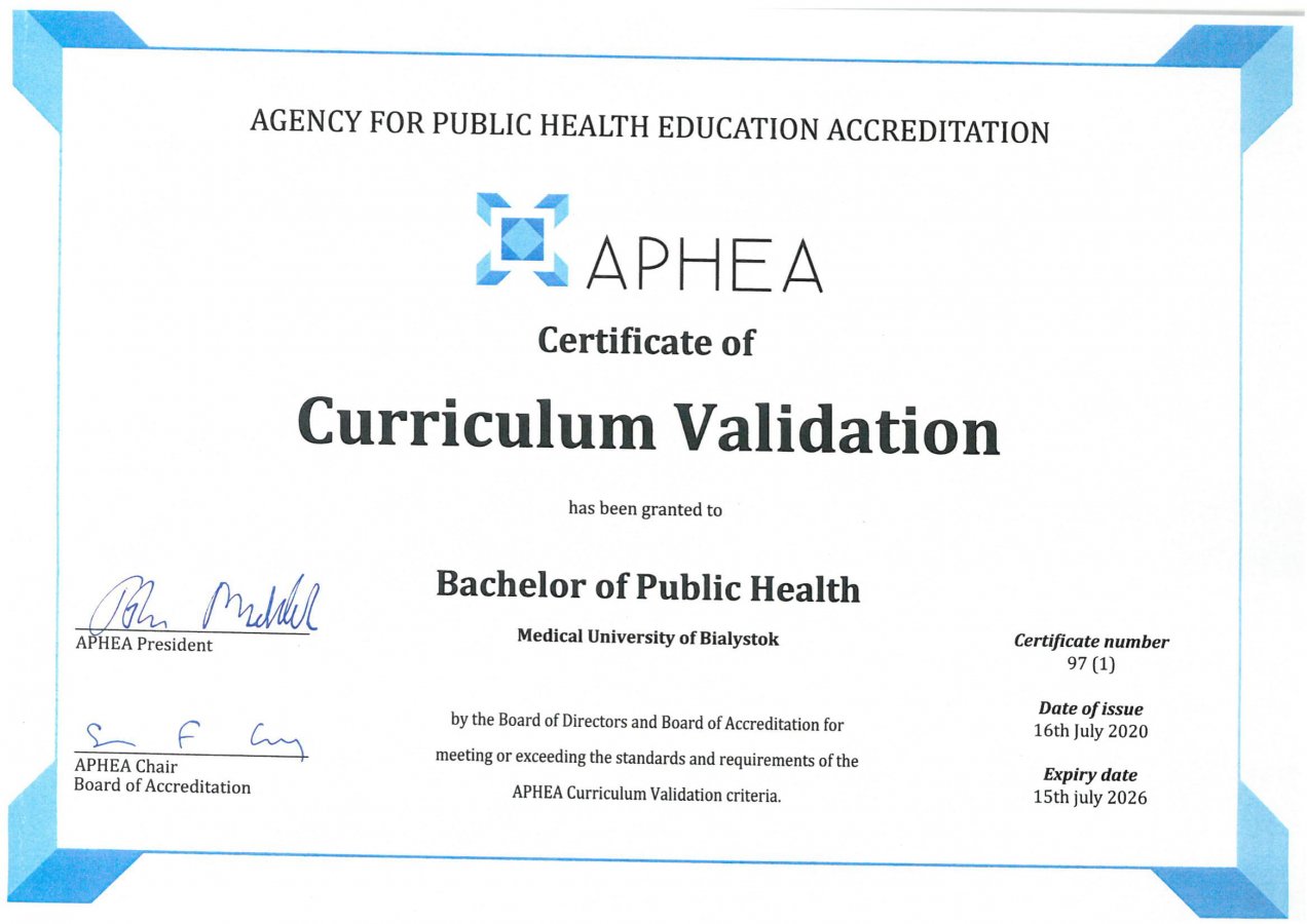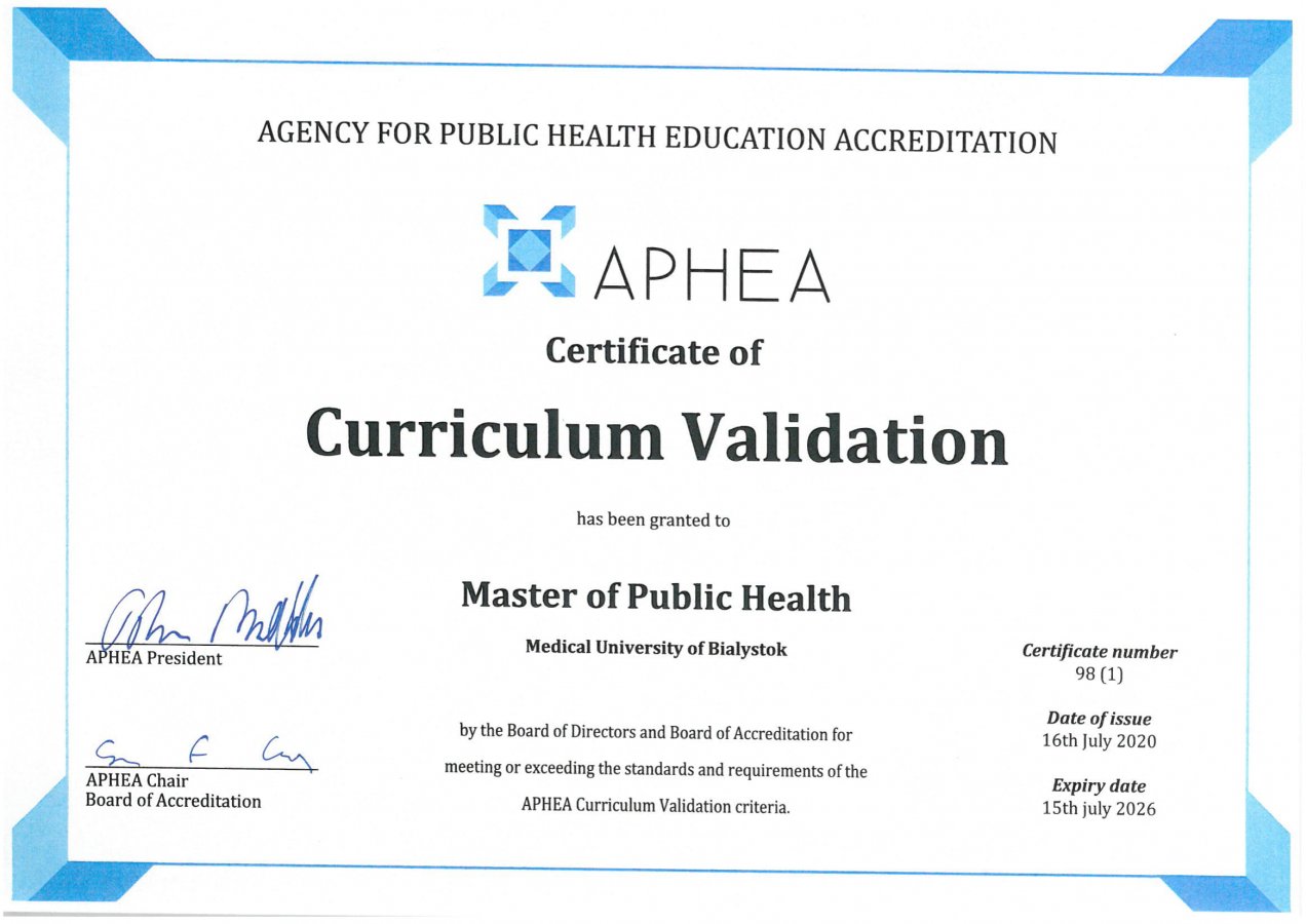 UMB otrzymał akredytację APHEA dla kierunku Zdrowie Publiczne zarówno na poziomie licencjackim, jak i magisterskim. Proces akredytacyjny składał się z 3 etapów: ocena programu nauczania, raport samooceny uczelni oraz 3-dniowa wizyta międzynarodowego zespołu recenzującego, która odbyła się we wrześniu ubiegłego roku.