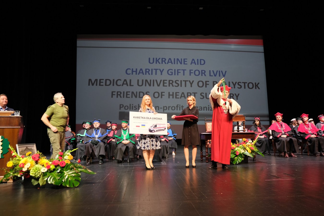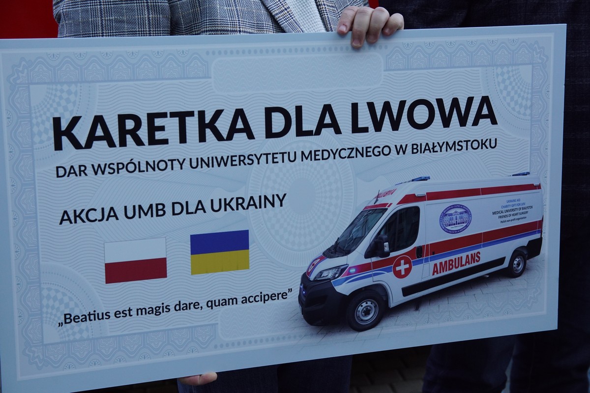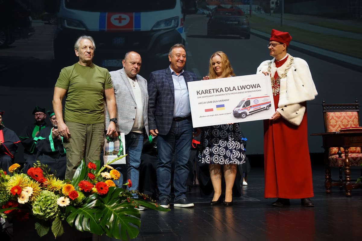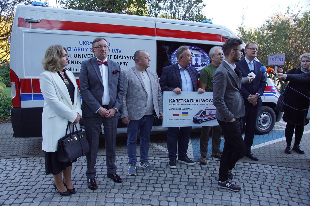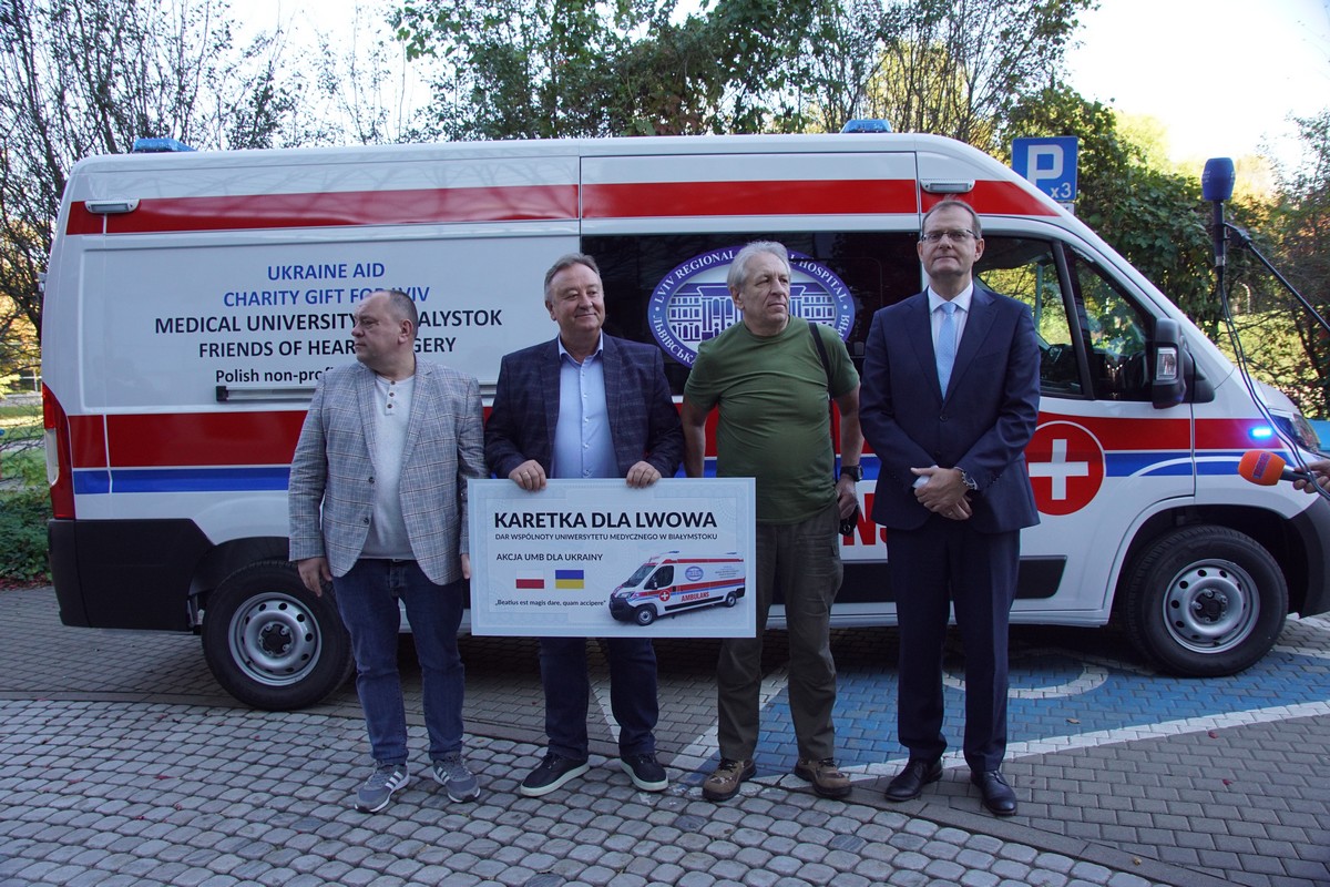 Rektor Uniwersytetu Medycznego w Białymstoku, prof. dr hab. Adam Krętowski w imieniu Wspólnoty Akademickiej przekazał nową karetkę wraz z wyposażeniem szpitalowi ze Lwowa. Ten radosny moment był częścią Uroczystej Inauguracji Nowego Roku Akademickiego 2022/2023 na UMB, która odbyła się w Operze i Filharmonii Podlaskiej w Białymstoku 7 października 2022 roku. Ambulans odebrał zaproszony na uroczystość prof. dr hab. Lubomir Kułyk, Kierownik Kliniki Kardiochirurgii z Lwowskiego Narodowego Uniwersytetu Medycznego im. Daniela Halickiego. Towarzyszyli mu także Roman Bakai - Zastępca Dyrektora Generalnego Lwowskiego Obwodowego Szpitala Klinicznego i dr Andrzej Ratych z Klinki Kardiochirurgii.