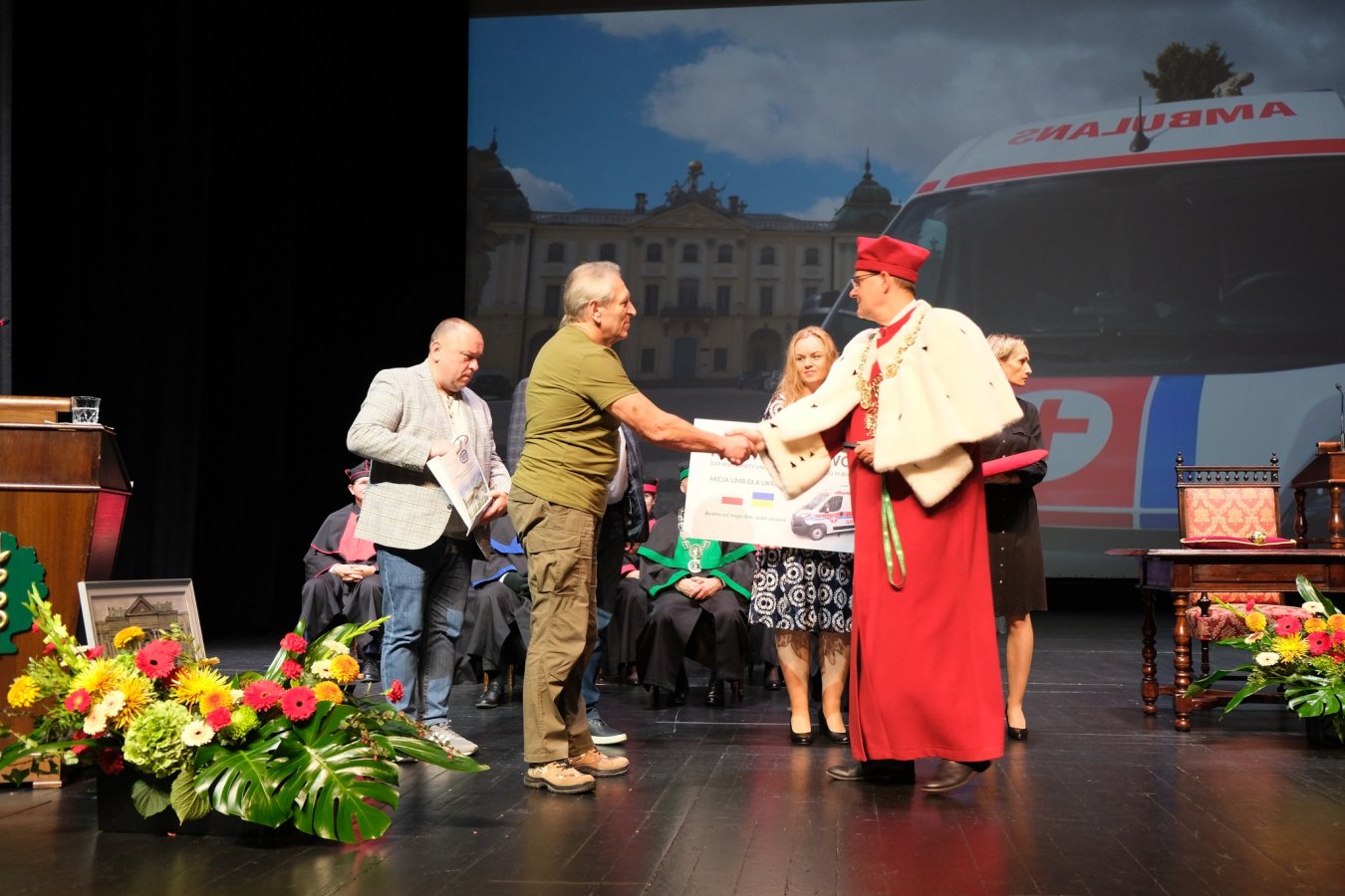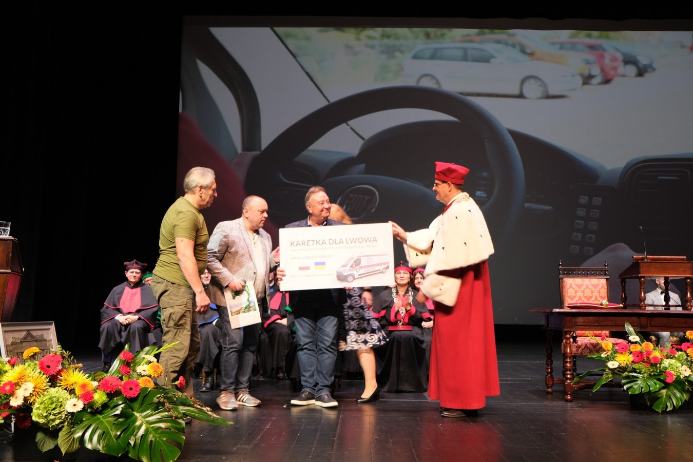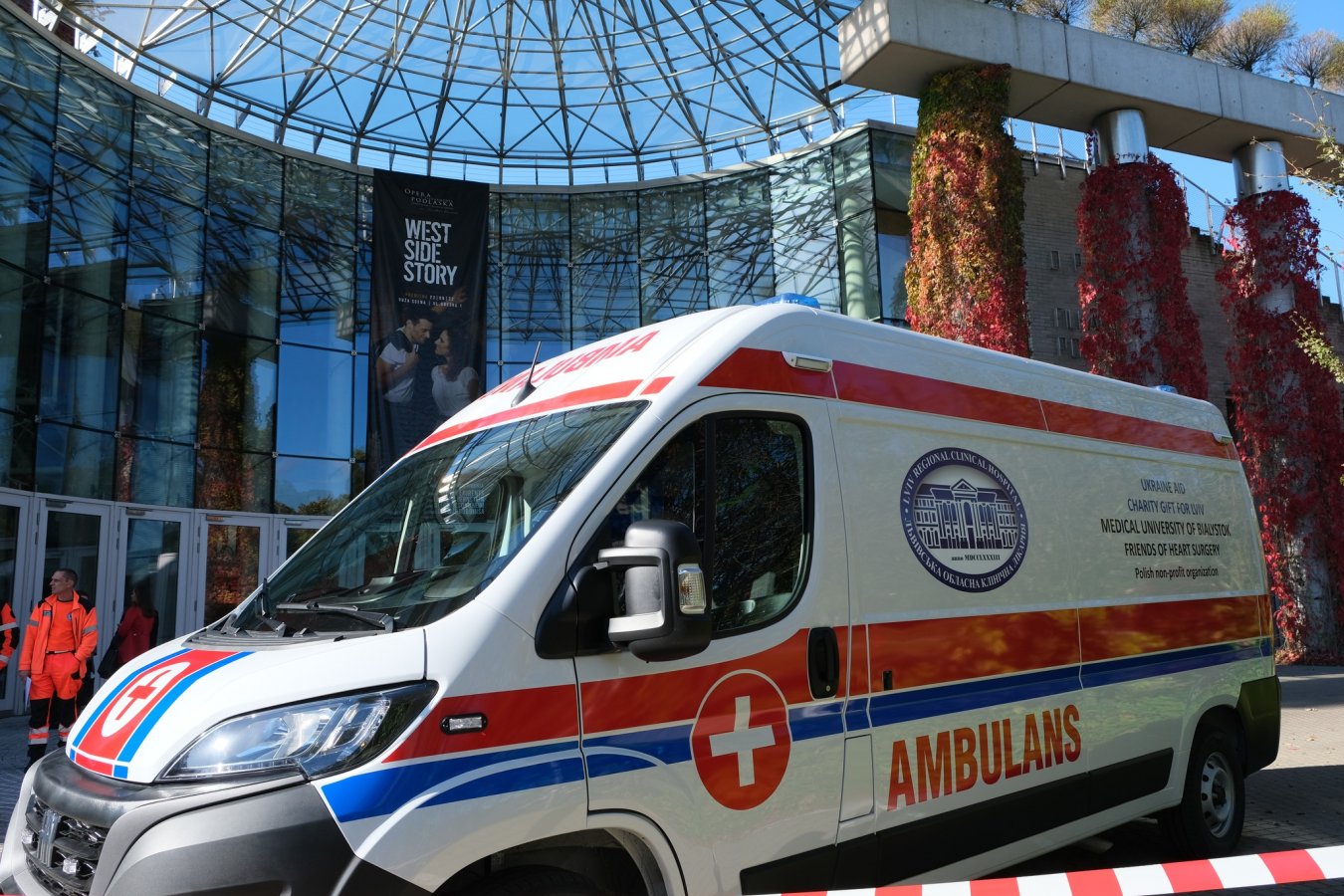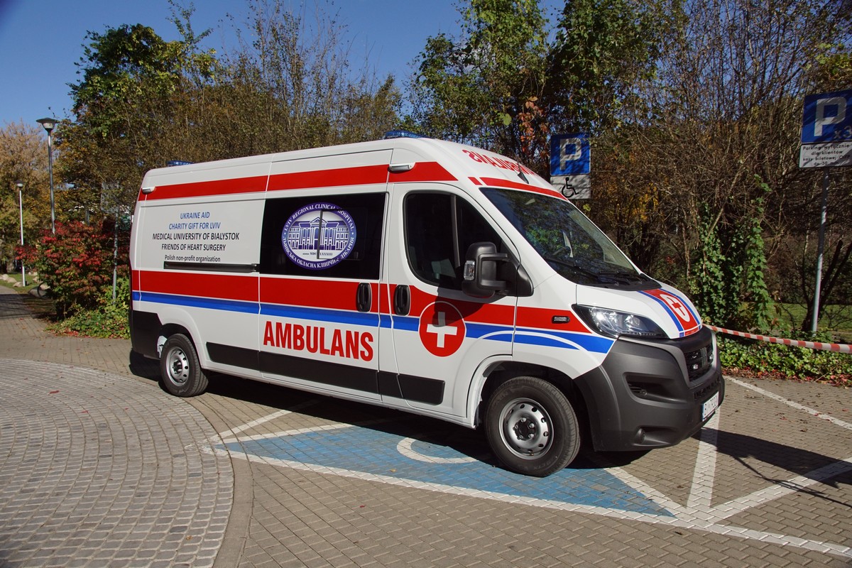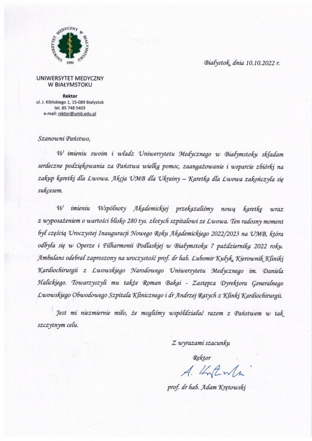 Rektor Uniwersytetu Medycznego w Białymstoku, prof. dr hab. Adam Krętowski w imieniu Wspólnoty Akademickiej przekazał nową karetkę wraz z wyposażeniem szpitalowi ze Lwowa. Ten radosny moment był częścią Uroczystej Inauguracji Nowego Roku Akademickiego 2022/2023 na UMB, która odbyła się w Operze i Filharmonii Podlaskiej w Białymstoku 7 października 2022 roku. Ambulans odebrał zaproszony na uroczystość prof. dr hab. Lubomir Kułyk, Kierownik Kliniki Kardiochirurgii z Lwowskiego Narodowego Uniwersytetu Medycznego im. Daniela Halickiego. Towarzyszyli mu także Roman Bakai - Zastępca Dyrektora Generalnego Lwowskiego Obwodowego Szpitala Klinicznego i dr Andrzej Ratych z Klinki Kardiochirurgii.