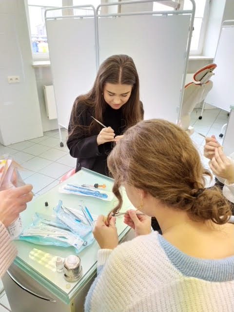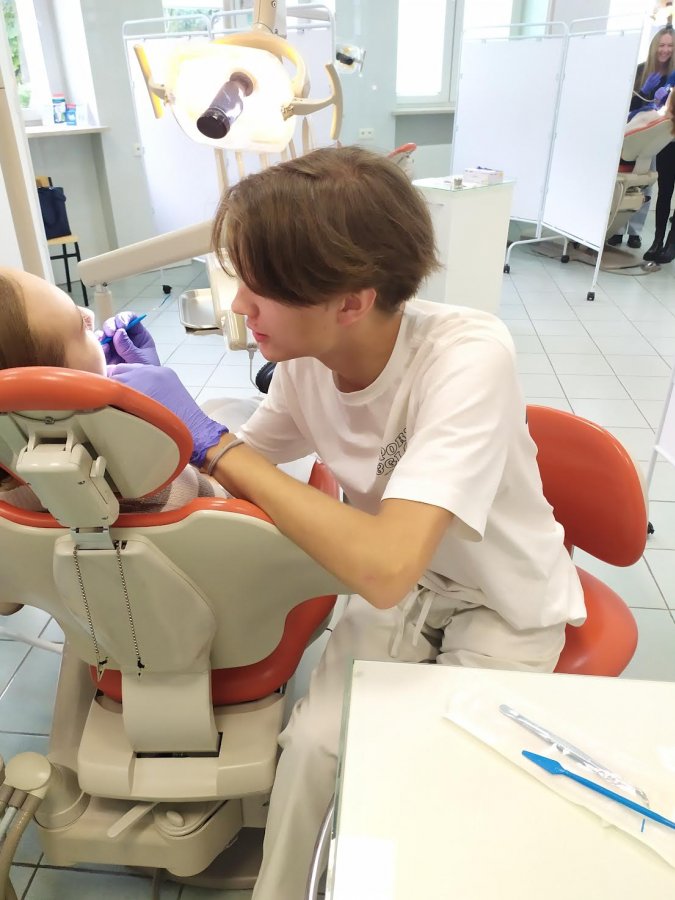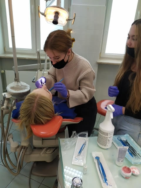 Licealiści zostali również oprowadzeni po salach klinicznych Zakładu Stomatologii Zachowawczej, gdzie mieli okazję pod okiem prowadzących wzajemnie przebadać stan swojego uzębienia, ocenić stan higieny jamy ustnej za pomocą detektorów wybarwiających płytkę nazębną oraz samodzielnie wypełnić ubytki próchnicowe wypreparowane w sztucznych zębach.