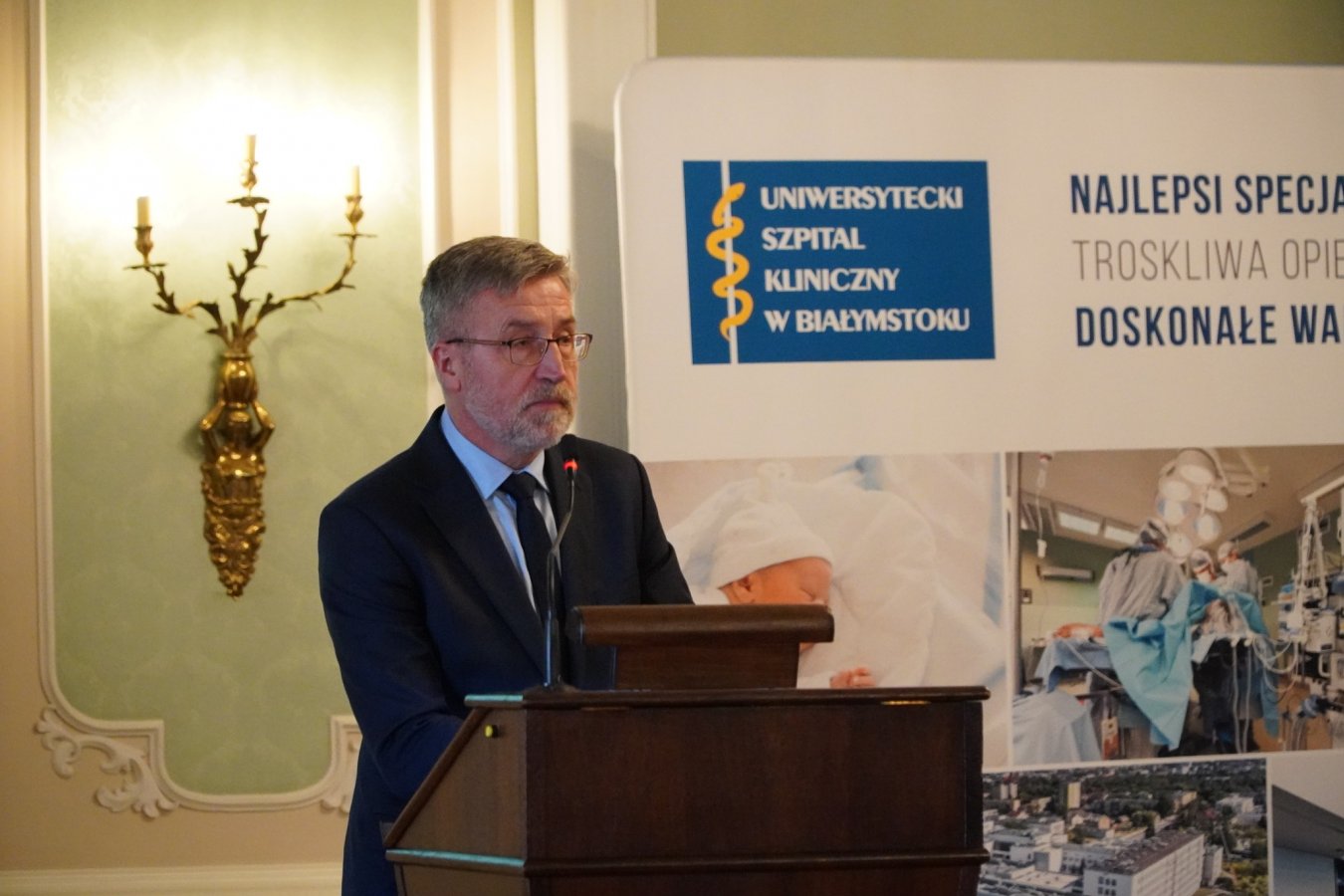 W imieniu władz rektorskich Uniwersytetu Medycznego w Białymstoku jubileuszowe gratulacje złożył Prorektor ds. Klinicznych i Szkolenia Zawodowego, prof. dr hab. Janusz Dzięcioł. „Minione lata to okres ogromnego rozwoju USK w Białymstoku, zarówno pod względem infrastruktury jak i liczby udzielanych świadczeń zdrowotnych, dzięki któremu Szpital stał się placówką o wysoko specjalistycznej działalności leczniczej, odgrywającą kluczowe znaczenie dla ochrony zdrowia mieszkańców regionu. Na kolejne lata proszę przyjąć życzenia wielu dalszych osiągnięć i stałego rozwoju Szpitala. Panu zaś i wszystkim Pracownikom USK życzę wielu sukcesów zawodowych i wszelkiej pomyślności w życiu osobistym” – przekazał w imieniu JM Rektora UMB, prof. dr hab. Adama Krętowskiego, Prorektor prof. dr hab. Janusz Dzięcioł.
