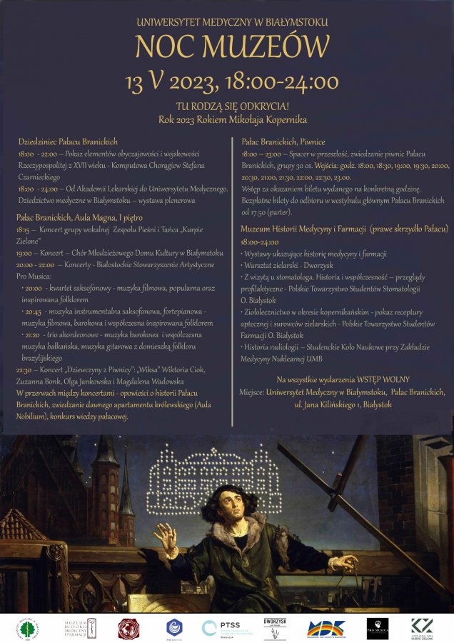 18.00 – 23.00 – Spacer w przeszłość, zwiedzanie piwnic Pałacu Branickich, grupy 30 os. Wejścia: godz. 18:00, 18:30, 19:00, 19:30, 20:00, 20:30, 21:00, 21:30, 22:00, 22:30, 23.00. Wstęp za okazaniem biletu wydanego na konkretną godzinę. Bezpłatne bilety do odbioru w westybulu głównym Pałacu Branickich od 17.50 (parter).