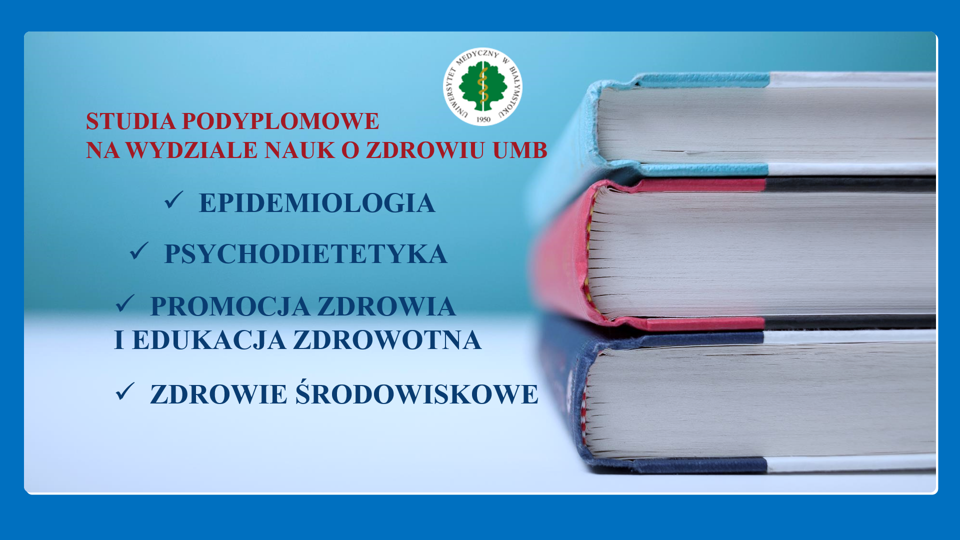 Polecamy studia podyplomowe na Wydziale Nauk o Zdrowiu EpidemiologiaPsychodietetykaPromocja Zdrowia i Edukacja ZdrowotnaZdrowie Środowiskowe - NowośćSzczegóły https://www.umb.edu.pl/s,25950/Studia_podyplomowe