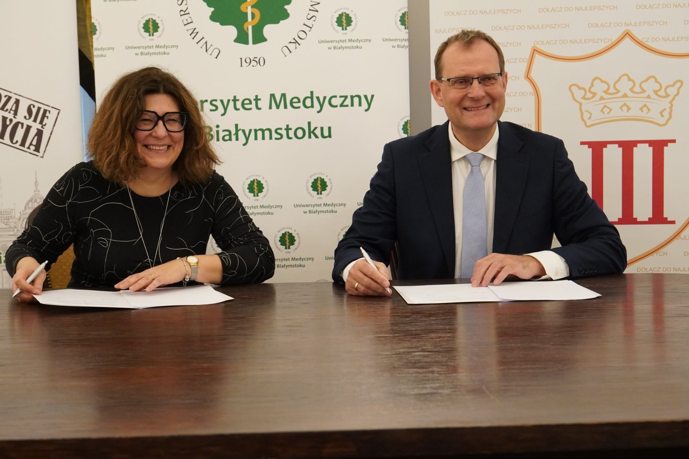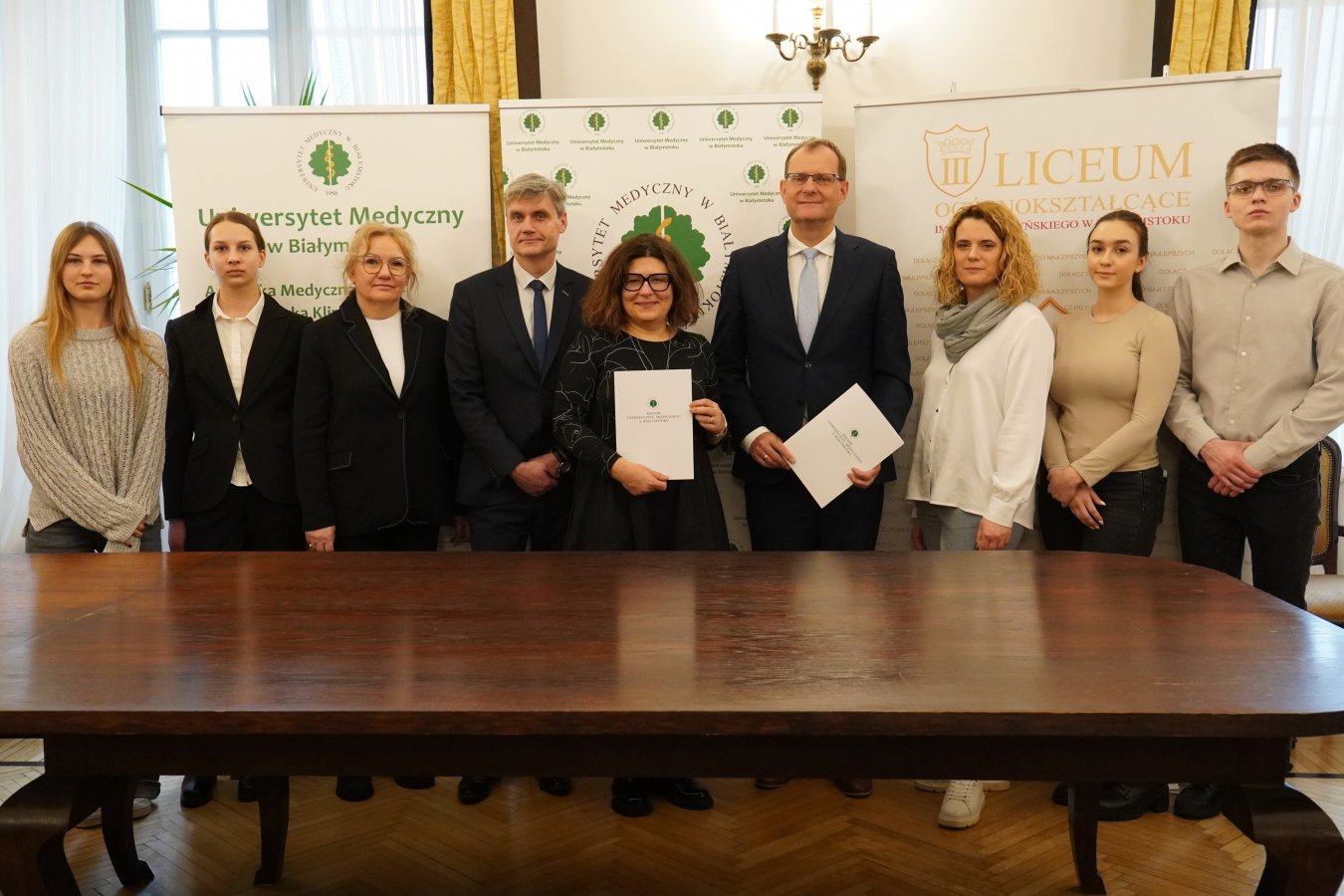 Podpisanie umowy patronackiej odbyło się 23 lutego 2024 r. o godz. 12:00 w Pałacu Branickich pomiędzy prof. dr hab. Adamem Krętowskim, Rektorem Uniwersytetu Medycznego w Białymstoku a Anną Kietlińską, dyrektorką III Liceum Ogólnokształcącego w Białymstoku. Na uroczystości obecni byli także nauczyciele, którzy będą koordynowali współpracę- p. Karolina Czarniecka (nauczyciel biologii) i p. Justyna Ostrowska (nauczyciel chemii) oraz uczniowie Gabriela Grycuk i Mateusz Dmitruk (klasa 3e) oraz Kamila Żukowska i Urszula Marcińczyk (klasa 2e). Ze strony UMB projekt będzie koordynować Prorektor ds. Kształcenia prof. dr hab. Adrian Chabowski oraz Biuro Promocji i Rekrutacji UMB.