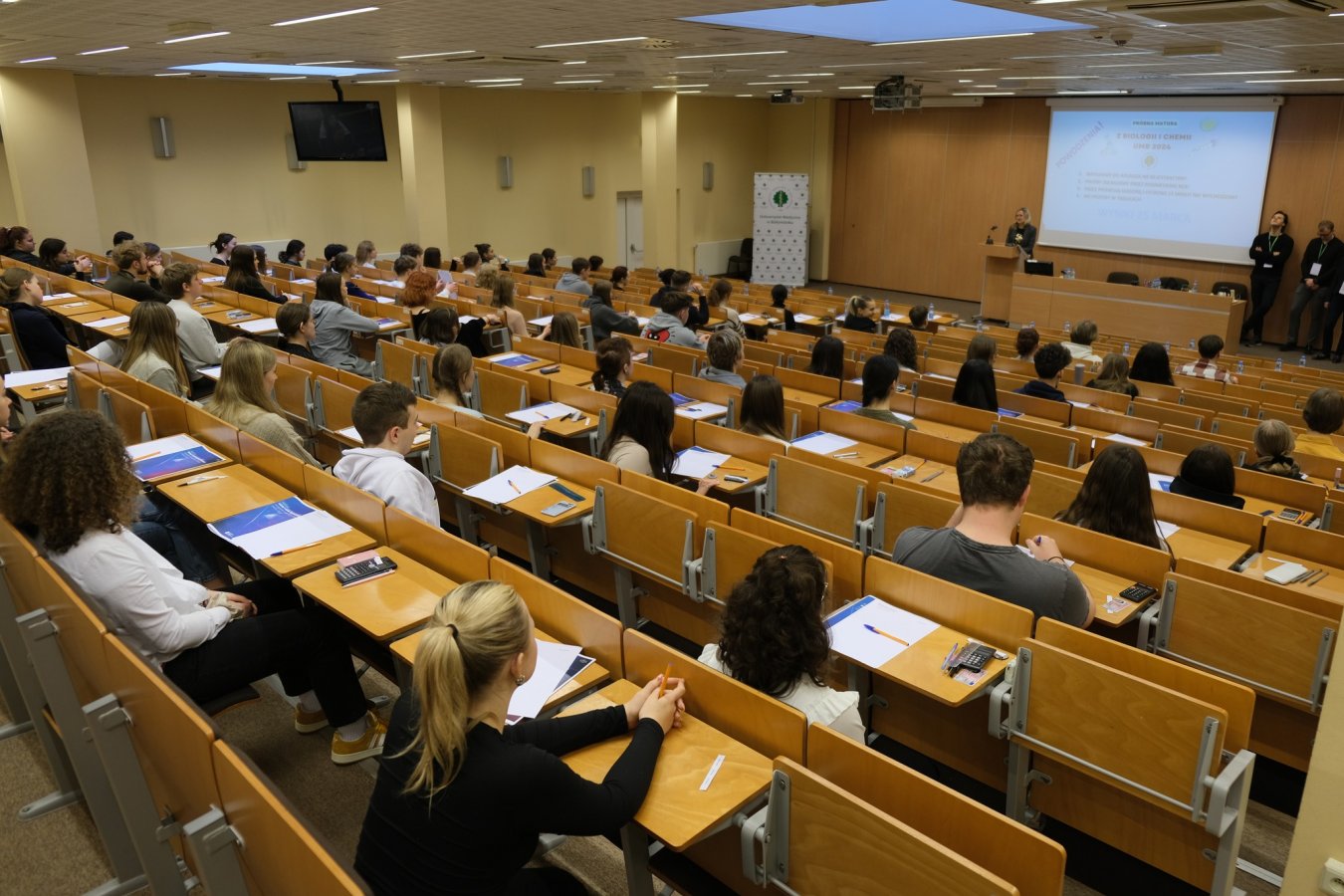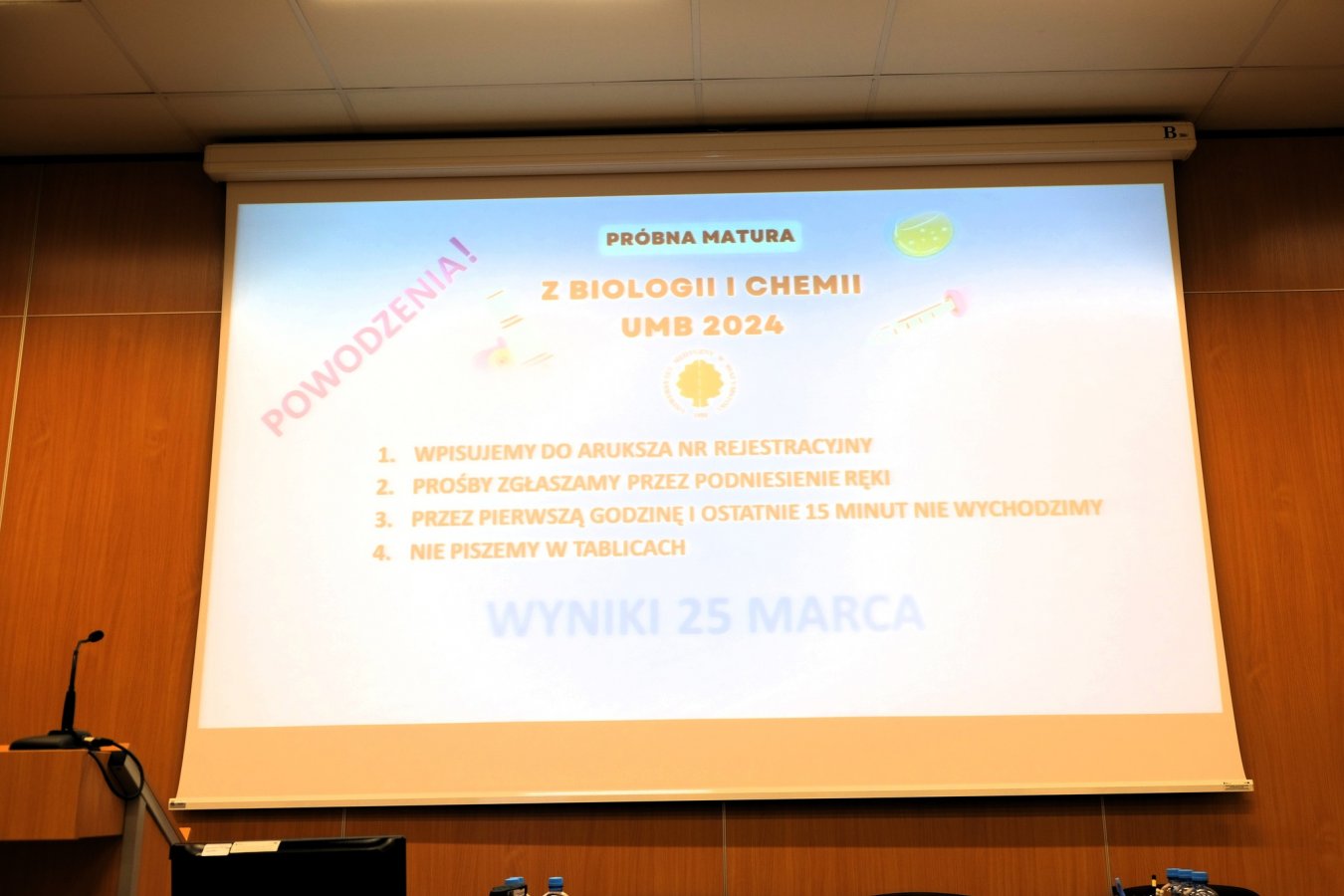 Po oficjalnym powitaniu przez prof. dr hab. Katarzynę Sochę, Prodziekan ds. Rozwoju Wydziału Farmaceutycznego z Oddziałem Medycyny Laboratoryjnej UMB, o godzinie 9:00 rozpoczął się trwający 3 godziny egzamin z biologii. Po godzinnej przerwie, o godzinie 13:00 uczestnicy przystąpili do egzaminu z chemii.