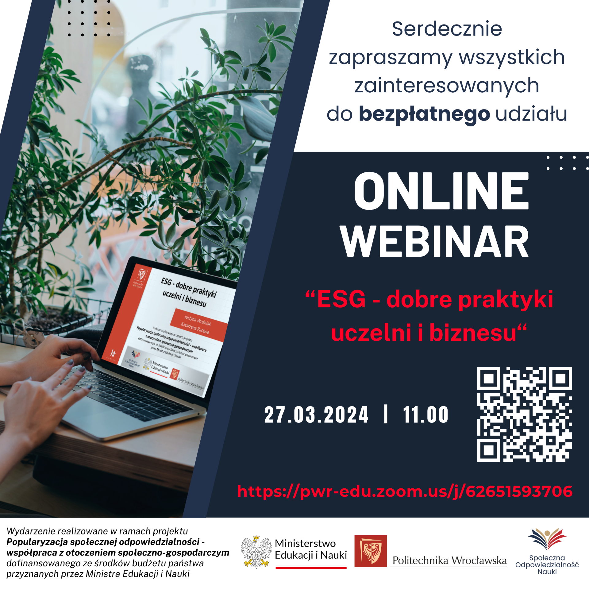 Zespół ds. społecznej odpowiedzialności uczelni Politechniki Wrocławskiej zaprasza na bezpłatny webinar: ESG - dobre praktyki uczelni i biznesu w dn. 27 marca o godzinie 11.00. Nie obowiązują zapisy.