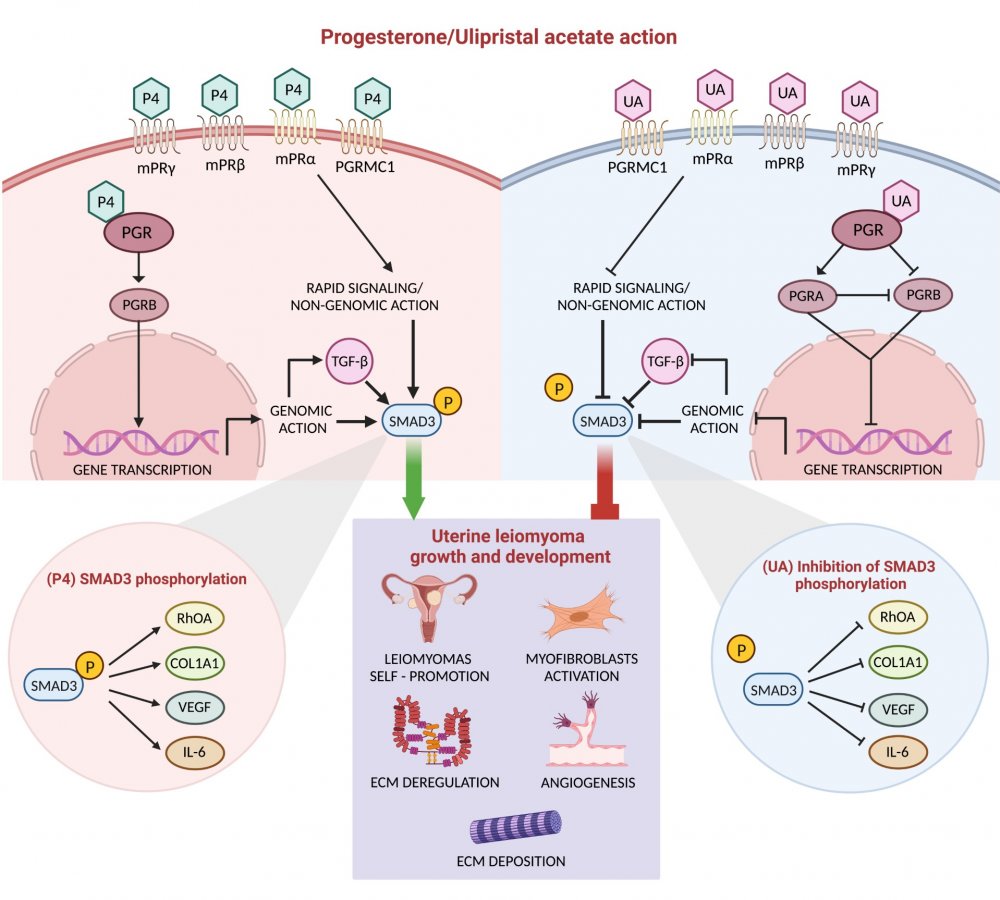 W publikacji autorzy przedstawili wyniki badań, które pozwoliły odkryć i opisać dwa różne mechanizmy działania progesteronu i selektywnego modulatora receptora progesteronu octanu ulipristalu w mięśniakach macicy. Progesteron aktywuje drogi sygnalizacyjne TGFb i SMAD3 co pobudza proliferację, wzrost i gromadzenie macierzy międzykomórkowej. Aktywacja jądrowego receptora progesteronowego zwiększa ekspresję genów tego szlaku, a aktywacja błonowych receptorów progesteronowych wywołuje szybką reakcję i fosforylację SMAD3. Selektywny modulator receptora progesteronowego SMRP (ulipristal) przeciwnie, hamuje szlaki sygnalizacyjne TGFb i SMAD3 obniżając ekspresję genów receptorów TGFbRI i RII, RhoA, VEGF oraz genów związanych z włóknieniem COL1A1 i proCOLIA1. Badania wykazały, że w biologii mięśniaków obok jądrowych receptorów progesteronowych ważną rolę odgrywają błonowe receptory progesteronowe. Autorzy pracy sugerują, że przy farmakologicznym leczeniu mięśniaków obok SMRP można stosować leki modulujące szlaki TGFb/SMAD3.