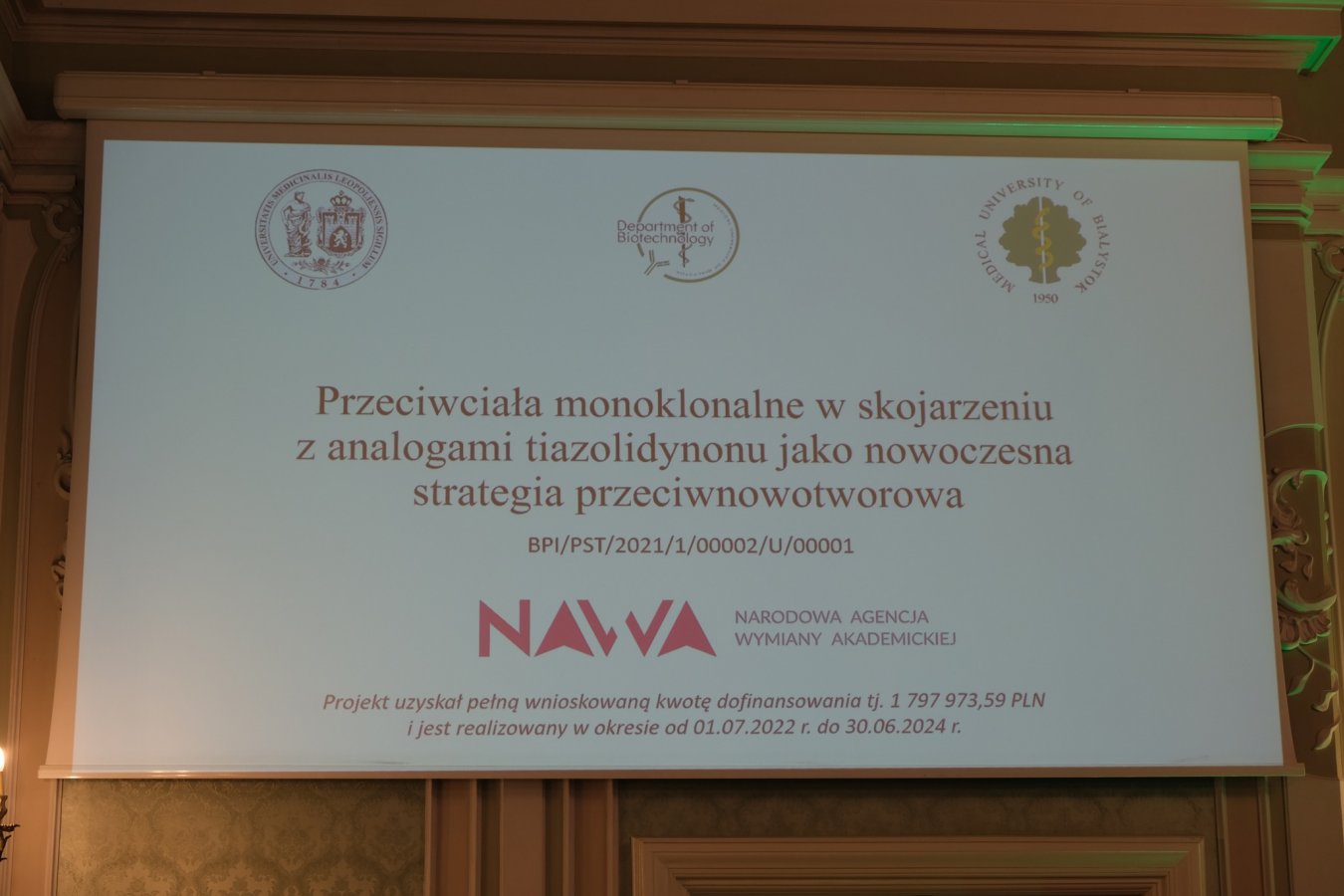 17 maja 2024 w Aula Magna Pałacu Branickich odbyło się uroczyste spotkanie podsumowujące dwa lata realizacji projektu badawczego finansowanego przez Narodową Agencję Wymiany Akademickiej w ramach programu Partnerstwa Strategiczne pn. „Przeciwciała monoklonalne w skojarzeniu z analogami tiazolidynonu jako nowoczesna strategia przeciwnowotworowa”. Uroczystość poprowadził prof. dr hab. Krzysztof Bielawski z Zakładu Syntezy i Technologii Środków Leczniczych UMB.