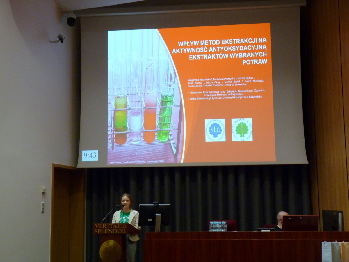 Nagrodę za najlepsze wystąpienie wśród Studentów podczas sesji Dietetyka otrzymali członkowie Studenckiego Koła Naukowego przy Zakładzie Biotechnologii Żywności UMB. Wyróżnienie to trafiło do: Małgorzaty Kuczyńskiej, Martyny Zambrzyckiej, Moniki Sejbuk, Anny Zinkow, Nikoli Ozóg, Moniki Szyłak oraz opiekunów koła: dr Iwony Mirończuk-Chodakowskiej i prof. dr. hab. Anny Witkowskiej.