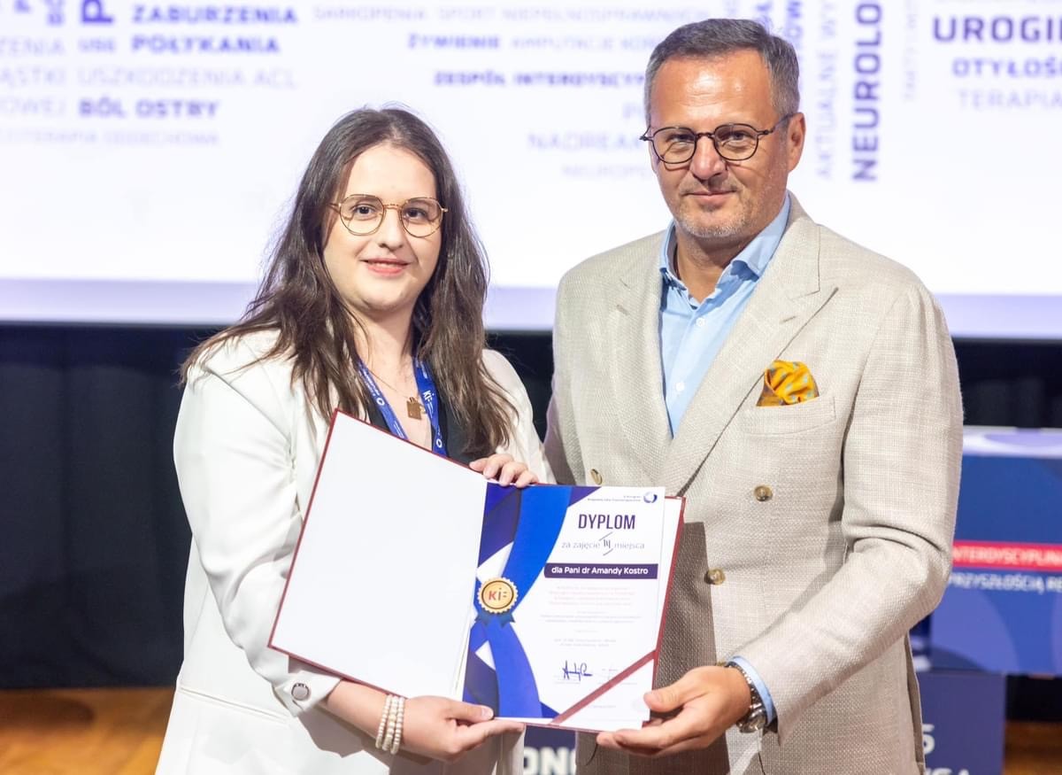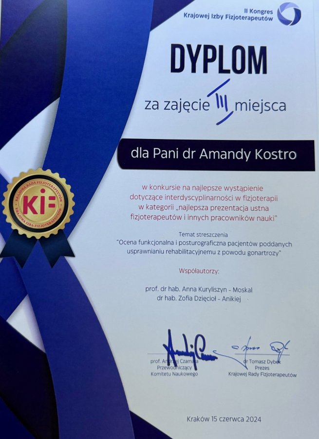 Nasza uczelnia uzyskała sukces w kategorii młodych pracowników nauki – dr Amanda Kostro zajęła 3 miejsce wygłaszając prezentację pt. „Ocena funkcjonalna i posturogaficzna pacjentów poddanych uprawnieniniu rehabilitacyjnemu z powodu gonartrozy” przygotowaną wspólnie z zespołem badawczym: dr. hab. Zofią Dzięcioł – Anikiej oraz prof. dr hab. Anną Kuryliszyn – Moskal.