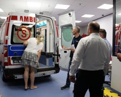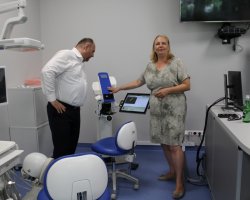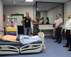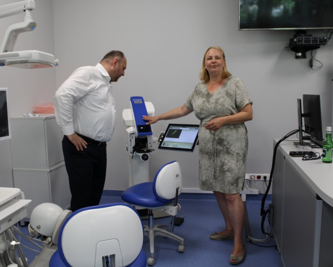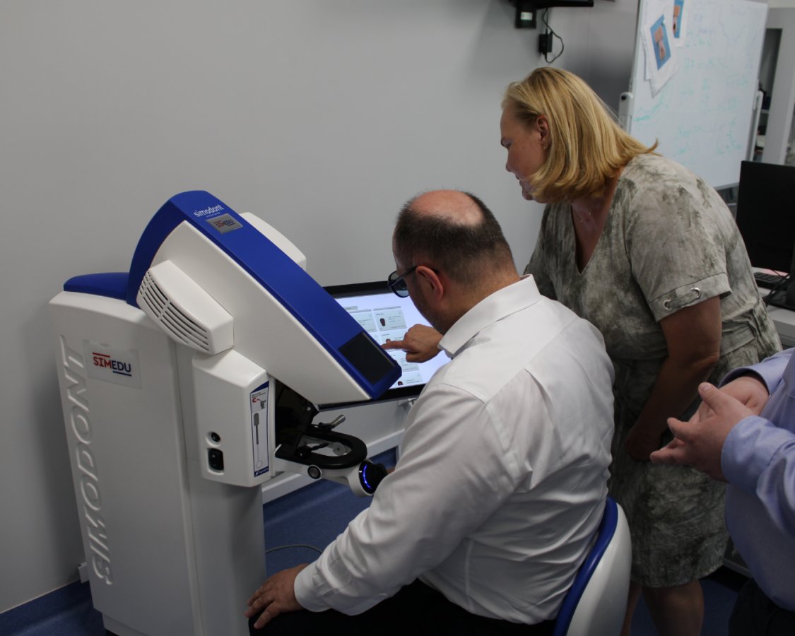 Goście zawitali także do Centrum Symulacji Medycznej, gdzie mieli możliwość zapoznania się z technikami praktycznego kształcenia studentów, a także skorzystania z nowoczesnych sprzętów VR wykorzystywanych w CSM przez studentów kierunku lekarsko-dentystycznego.