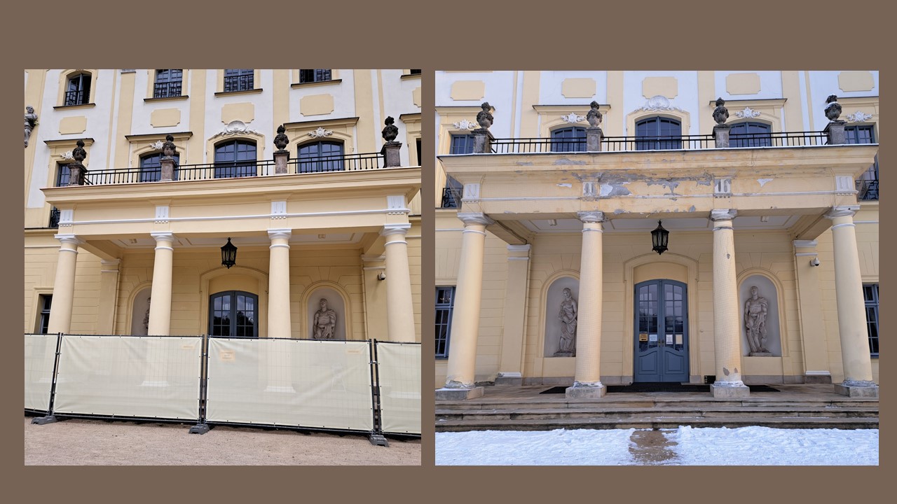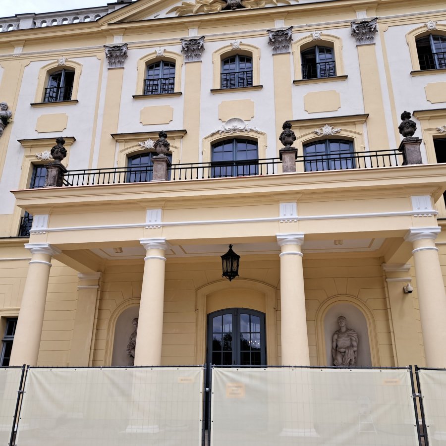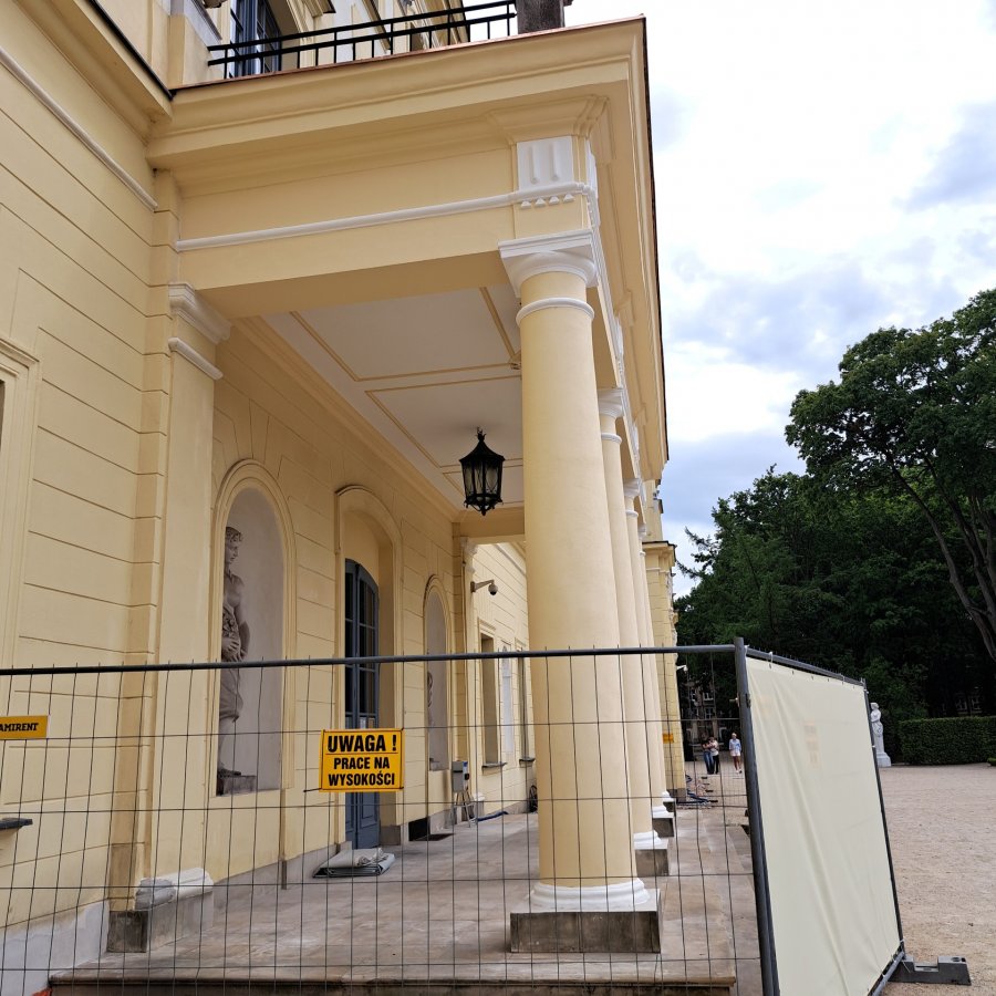 W ramach zadania zostaną wymienione warstwy posadzkowe wraz z kładzinami balkonu oraz zostaną wyremontowane kolumny i gzyms przy wejściu od strony ogrodów.