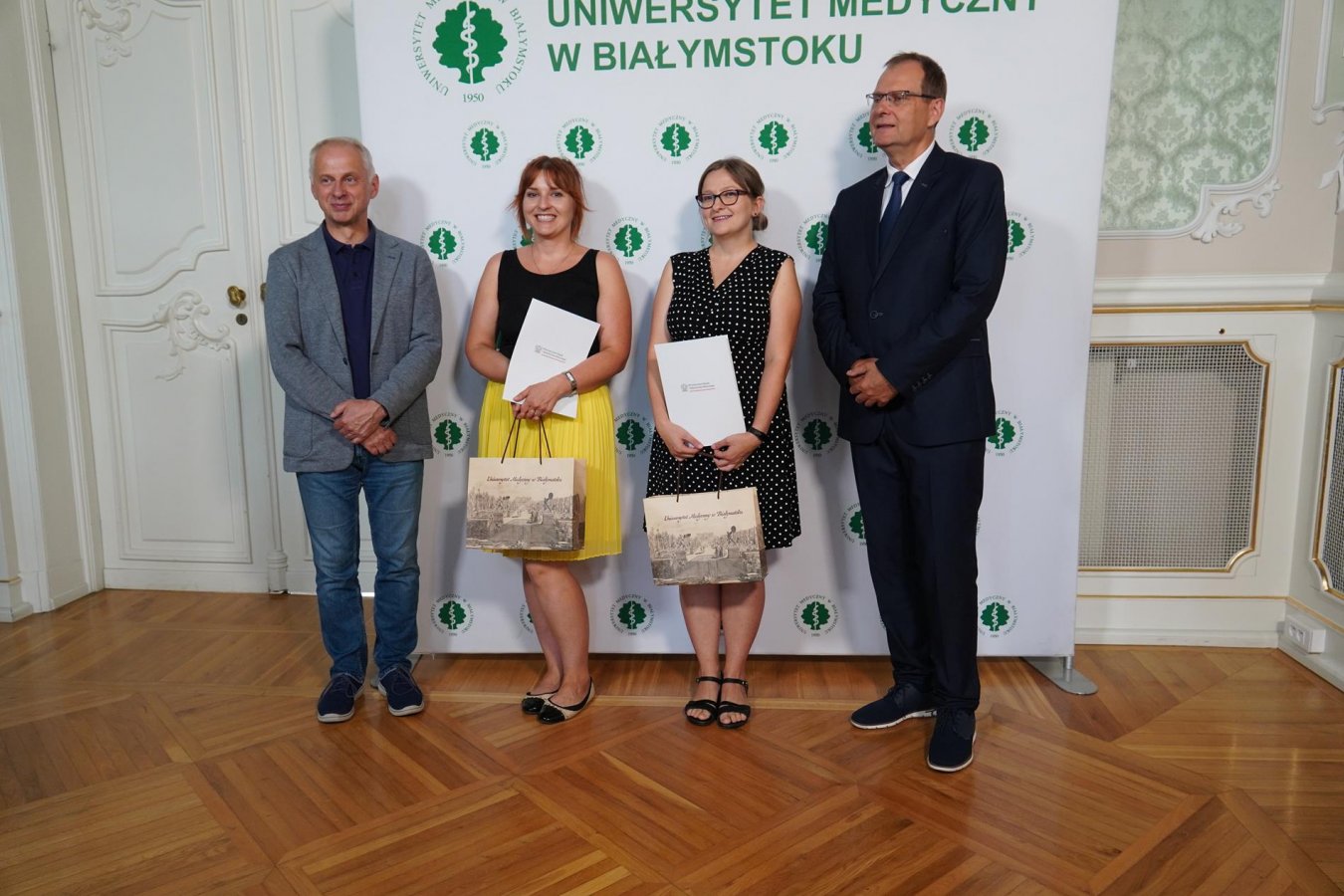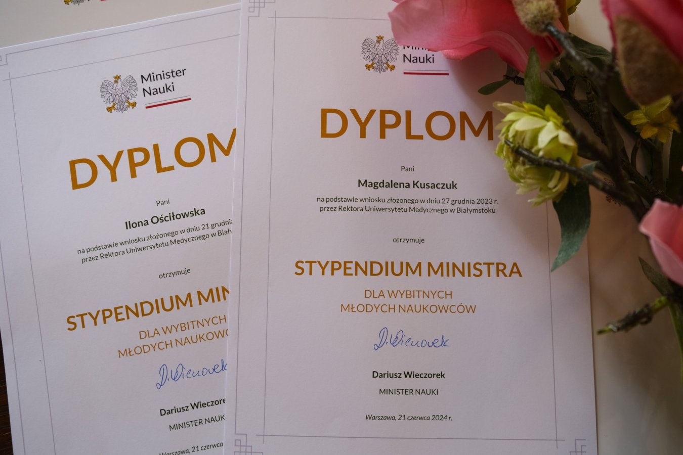 Do grona 4 wybitnych młodych naukowców wyróżnionych specjalnym ministerialnym stypendiów w Uniwersytecie Medycznym w Białymstoku dołączyły kolejne 2 osoby. 8 sierpnia 2024 roku Rektor prof. Adam Krętowski wręczył specjalne dyplomy dr hab. llonie Ościłowskiej z Zakładu Analizy i Bioanalizy Leków oraz dr Magdalenie Kusaczuk z Zakładu Biochemii Farmaceutycznej. Obie naukowczynie pracują na Wydziale Farmaceutycznym z Oddziałem Medycyny Laboratoryjnej UMB. Ministerstwo doceniło tym samym jakość prowadzonych przez nie badań oraz ich dotychczasowy dorobek naukowy.