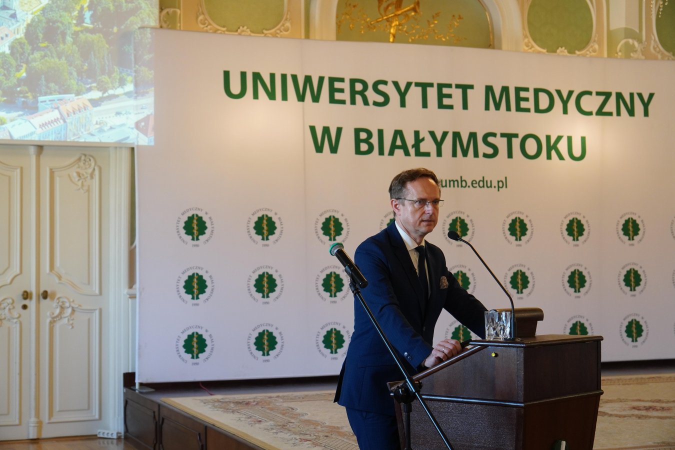 Nowy Rektor prof. Marcin Moniuszko dziękując za zaufanie powiedział: My ciągle idziemy do przodu, ciągle razem i wciąż wytyczamy nowe ścieżki rozwoju. Przed nami bardzo wiele nowych, ale też cała rzesza dotychczasowych wyzwań. Bardzo leży mi na sercu żebyśmy właśnie razem, wykorzystując własne potencjały i talenty, tak wielu różnych indywidualności, pracowali na rzecz Uniwersytetu Medycznego w Białymstoku, naszego miasta i regionu.