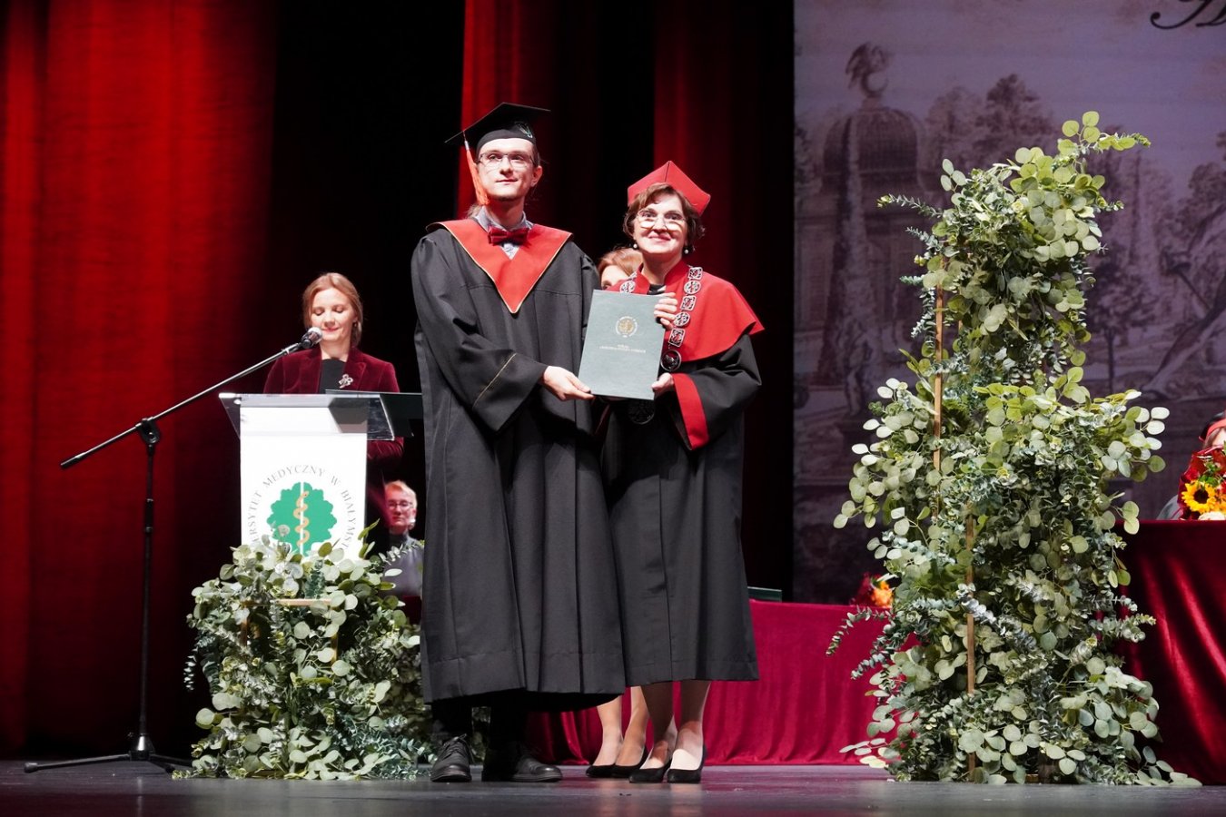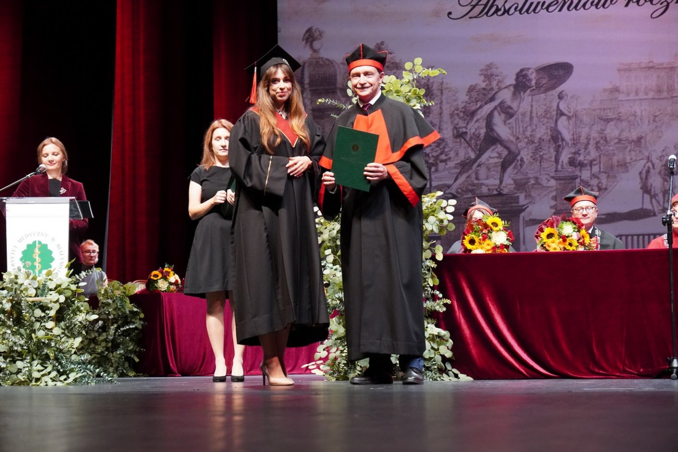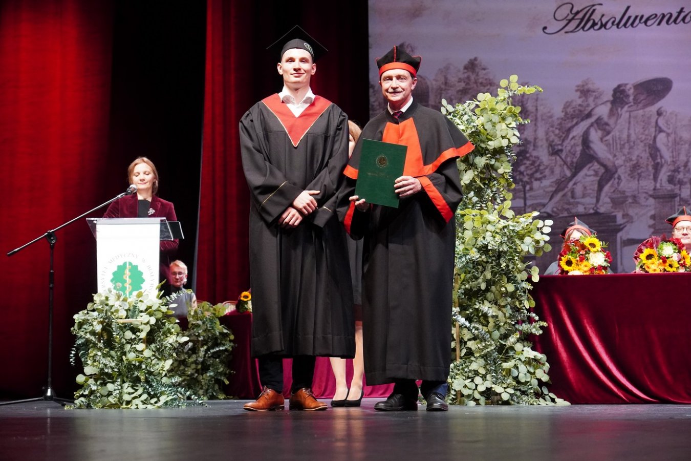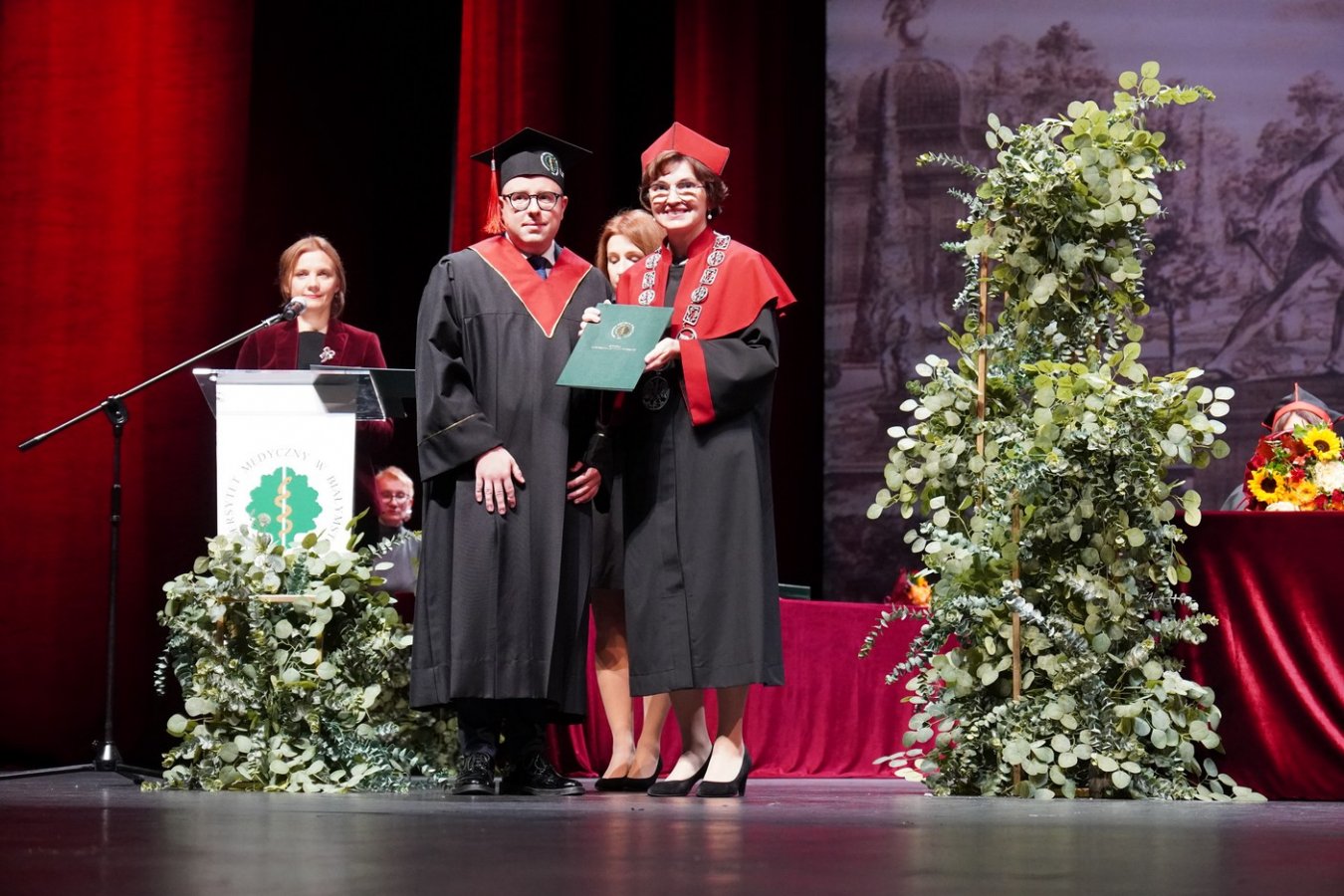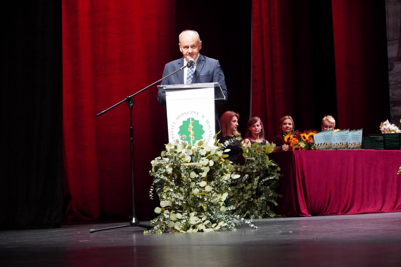 Prorektor ds. Kształcenia prof. Adrian Chabowski podkreślał emocje jakie towarzyszyły podczas studiowania: to był stres, frustracja, elementy związane z zaliczeniami i egzaminami, ale była też ambicja, żeby być lepszym, żeby poznać. I do tego potężny zasób satysfakcji: to ja to zrobiłem, to ja to osiągnąłem. I to zostanie z Wami, bo w Waszej przyszłej pracy będą te same emocje: stres, ambicja do dążenia w kierunku najlepszej diagnostyki, w kierunku najlepszego leczenia. I później to morze satysfakcji: to mój pacjent czuje się lepiej.