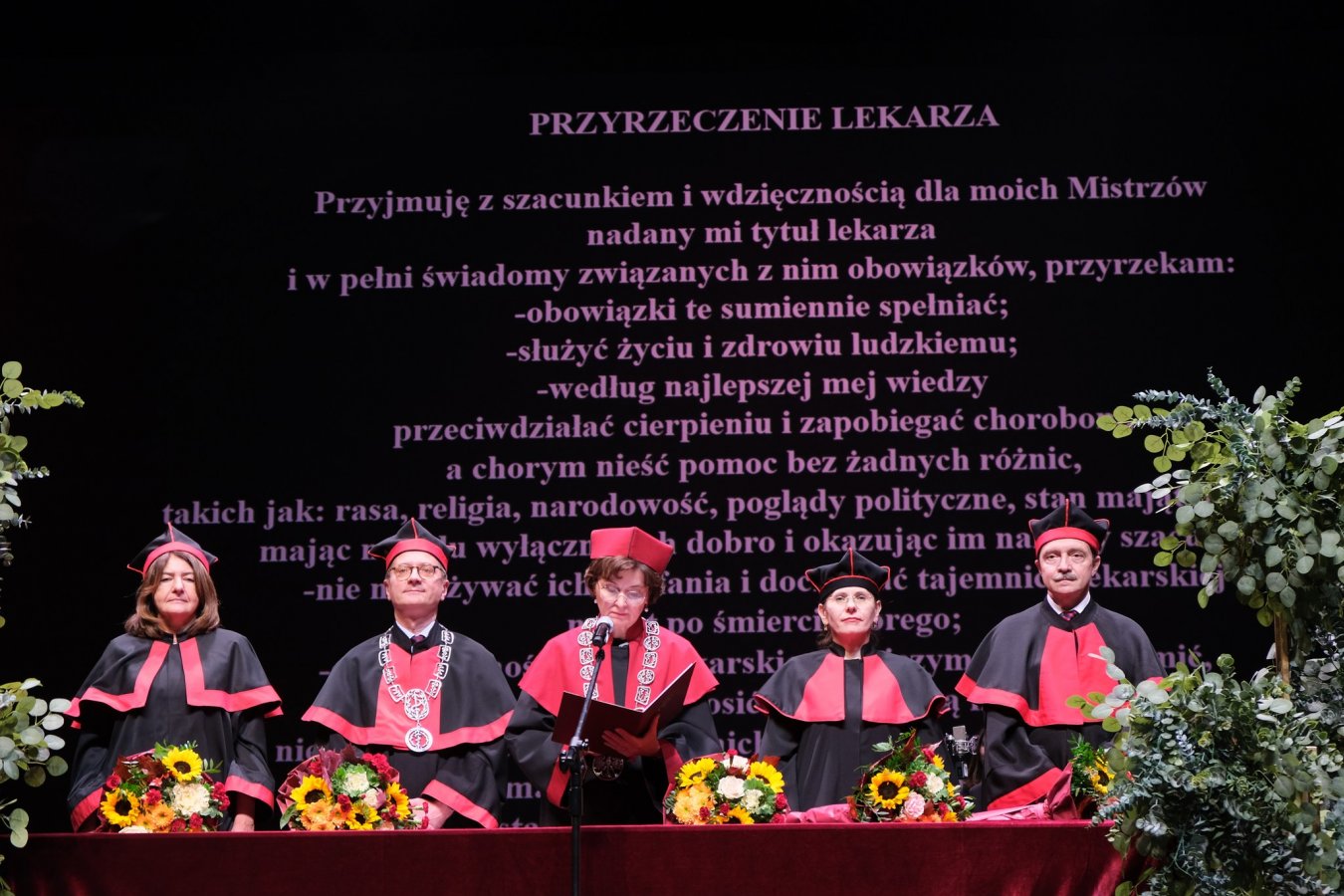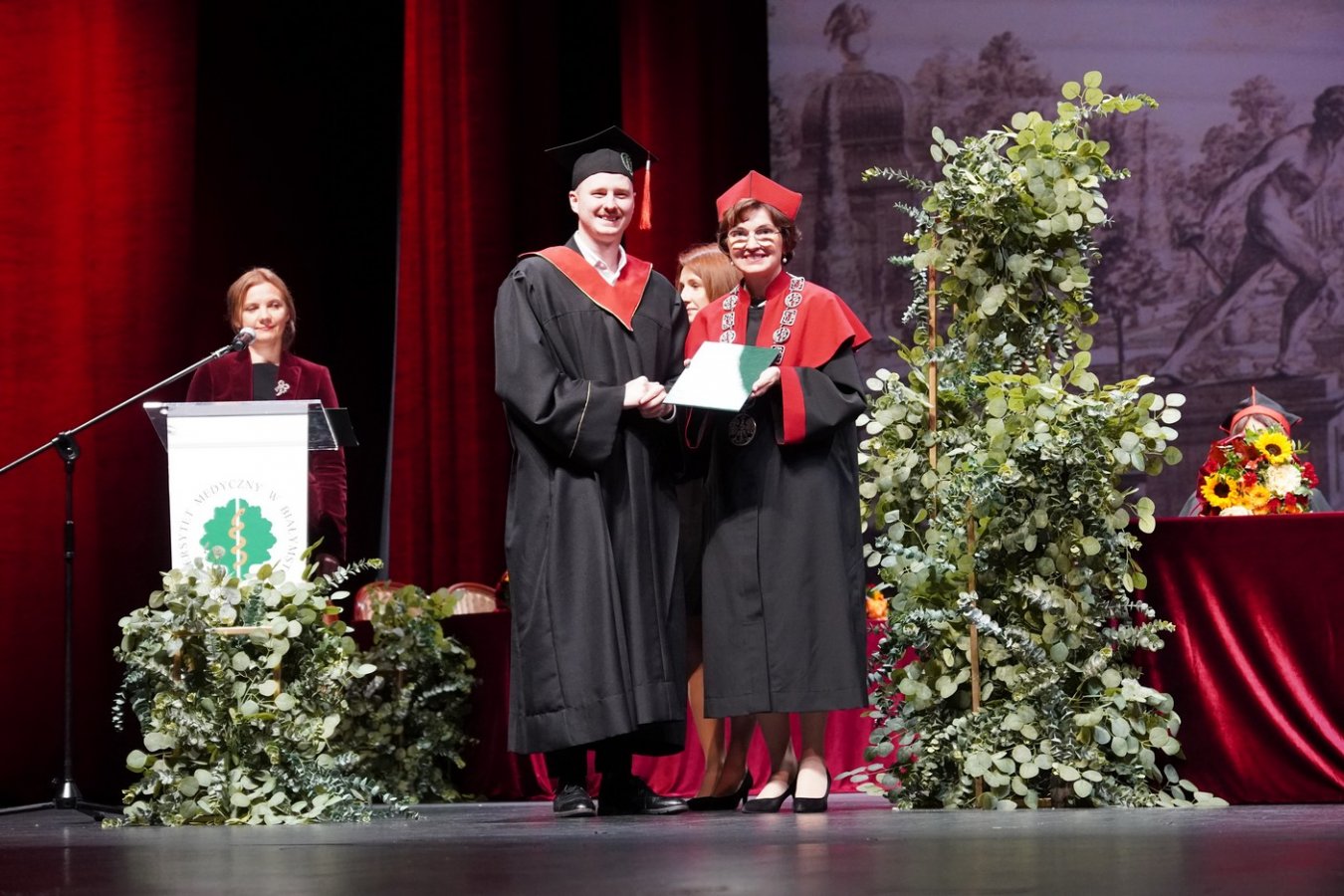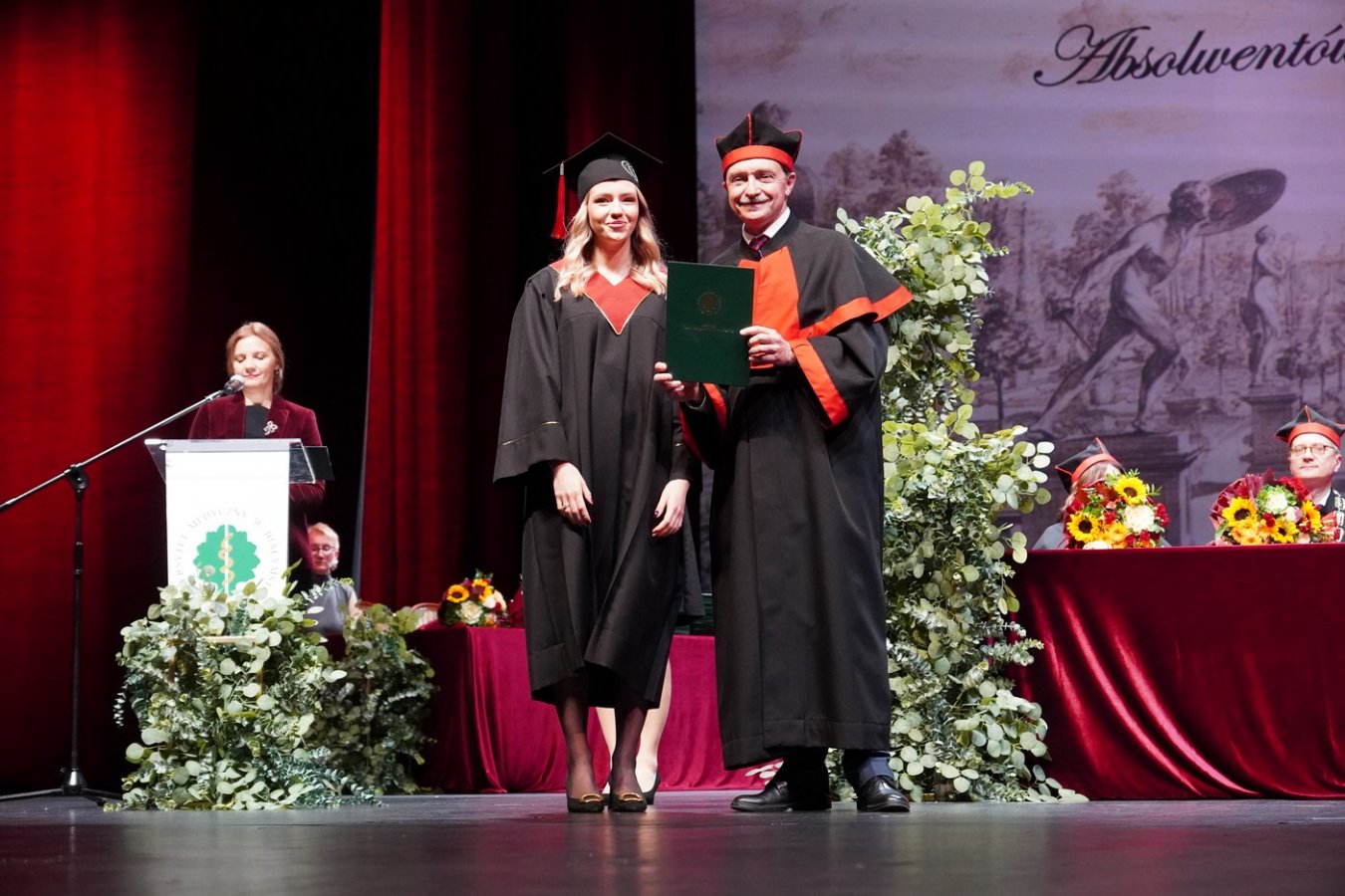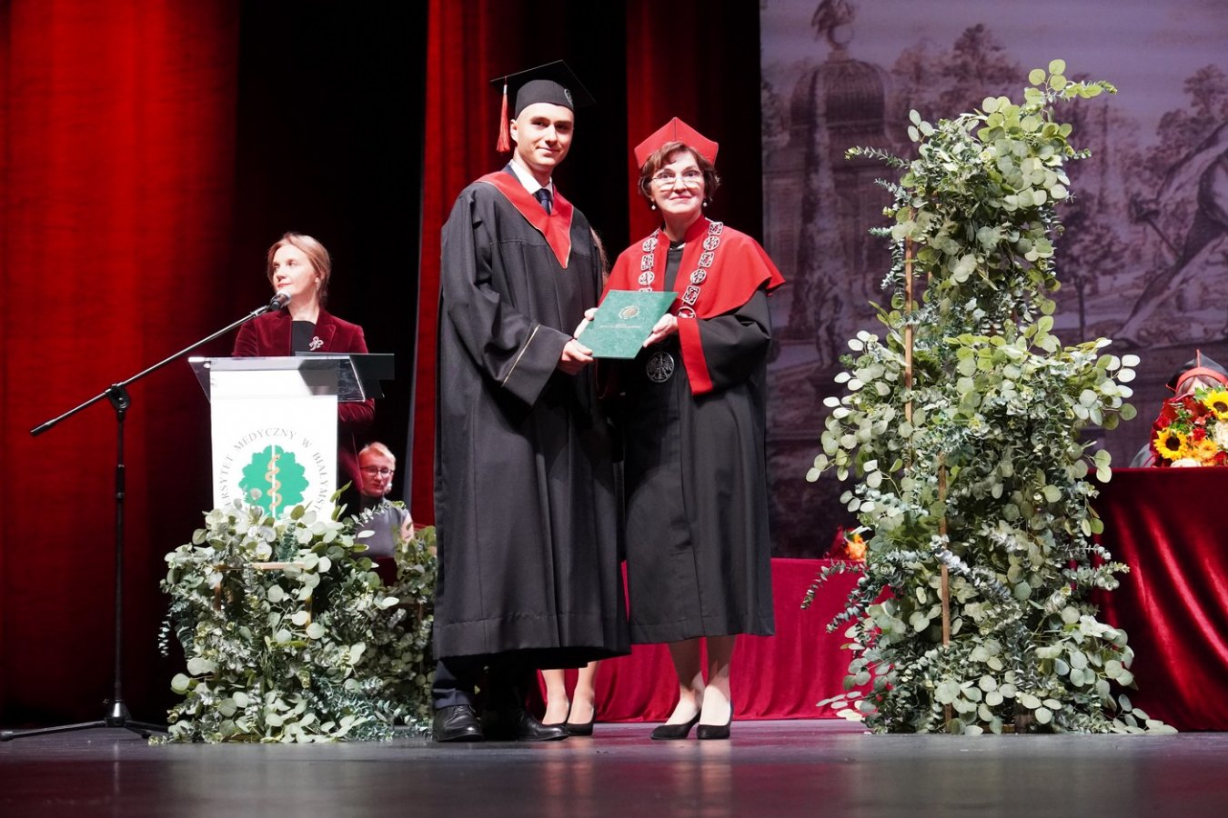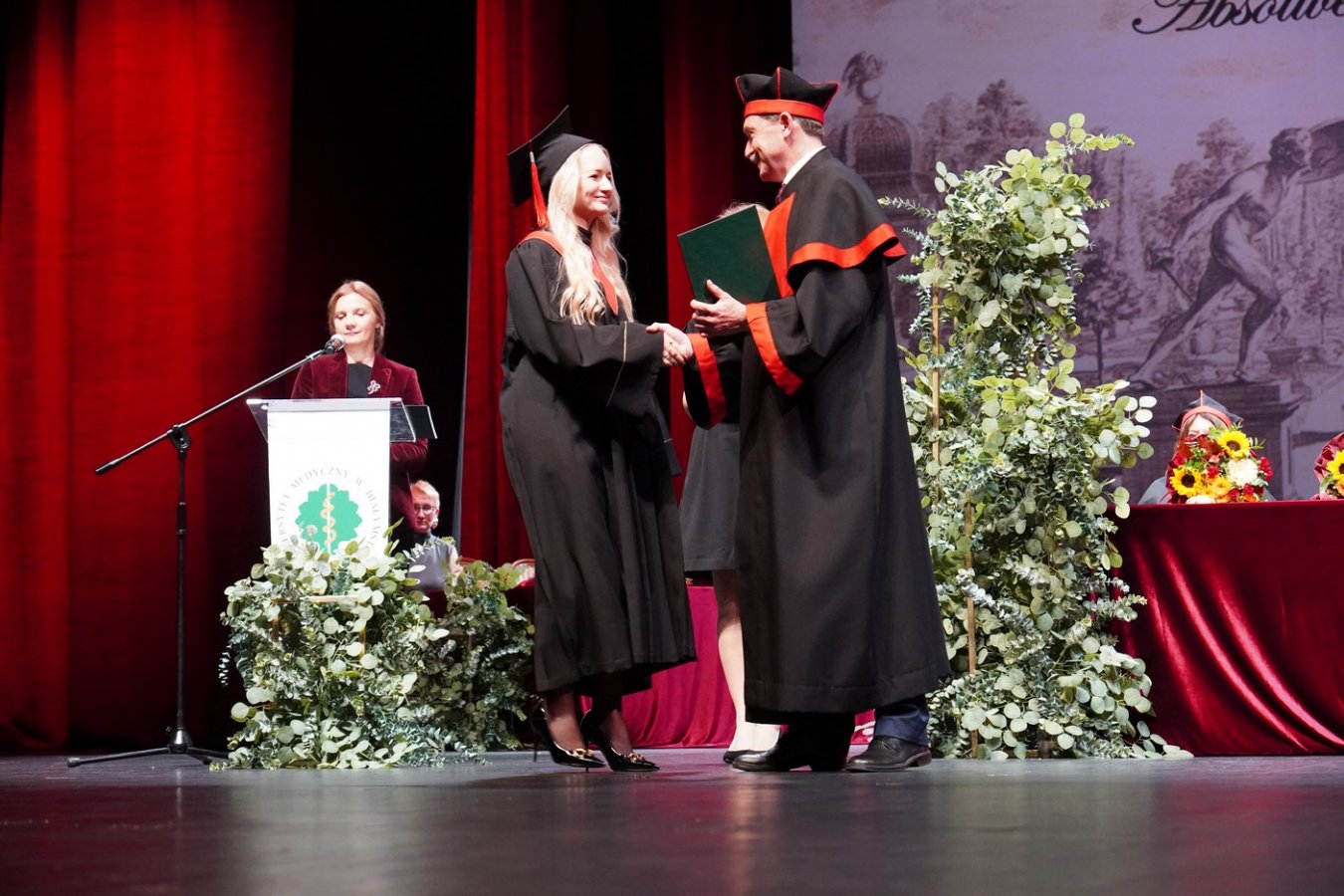 Prorektor ds. Kształcenia prof. Adrian Chabowski podkreślał emocje jakie towarzyszyły podczas studiowania: to był stres, frustracja, elementy związane z zaliczeniami i egzaminami, ale była też ambicja, żeby być lepszym, żeby poznać. I do tego potężny zasób satysfakcji: to ja to zrobiłem, to ja to osiągnąłem. I to zostanie z Wami, bo w Waszej przyszłej pracy będą te same emocje: stres, ambicja do dążenia w kierunku najlepszej diagnostyki, w kierunku najlepszego leczenia. I później to morze satysfakcji: to mój pacjent czuje się lepiej.
