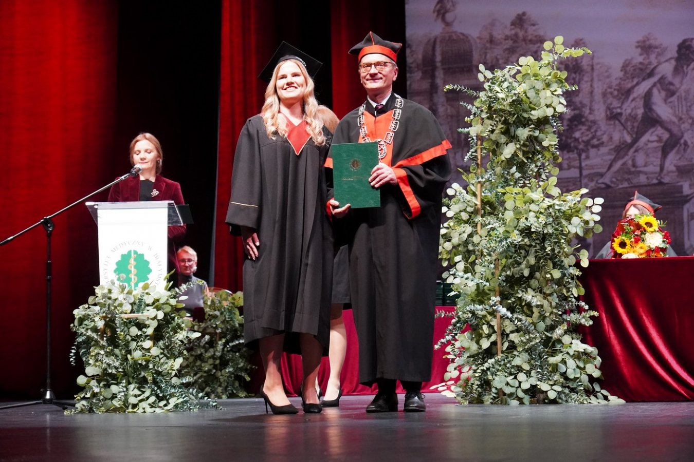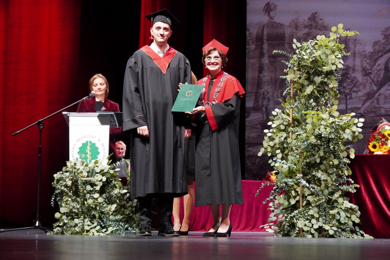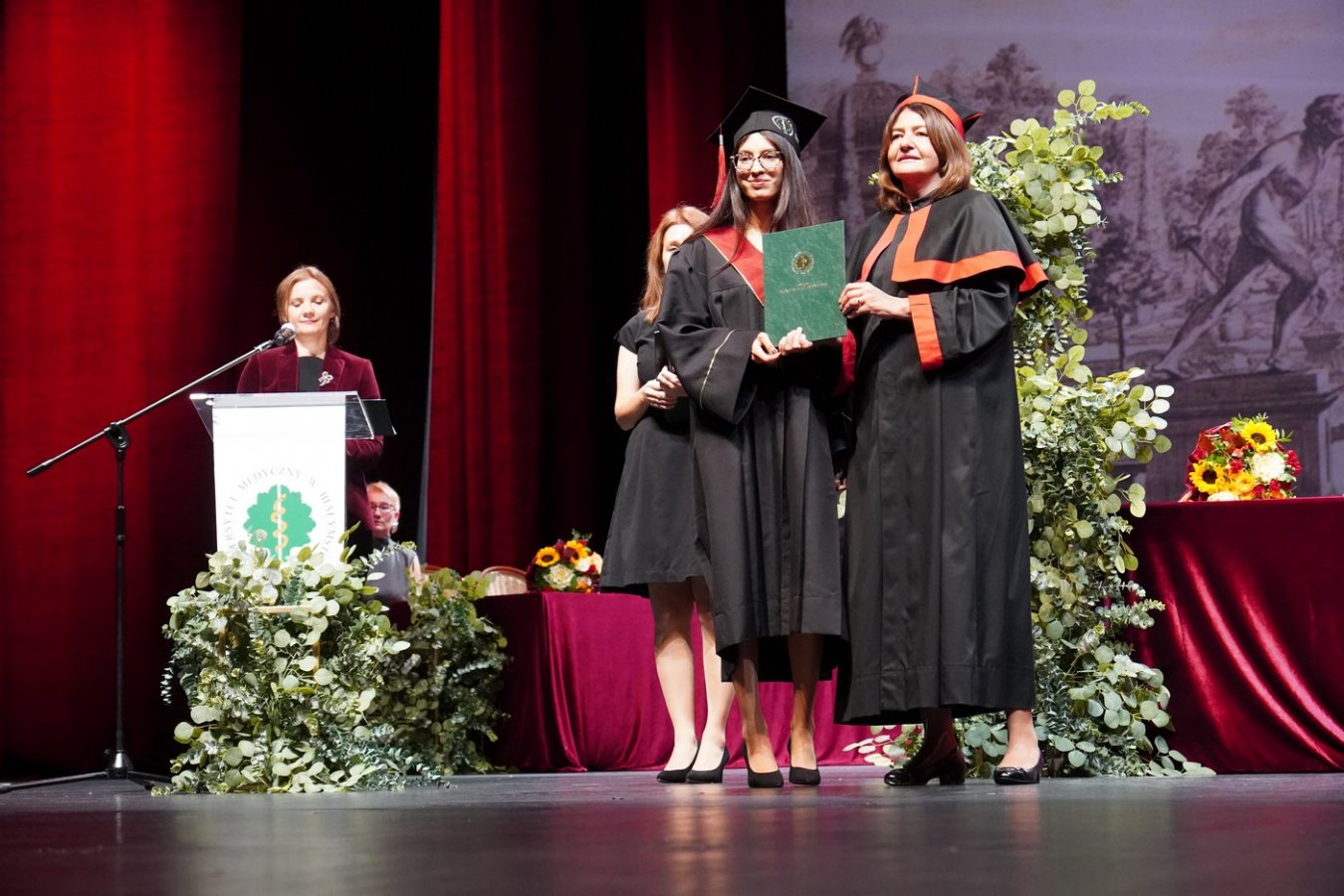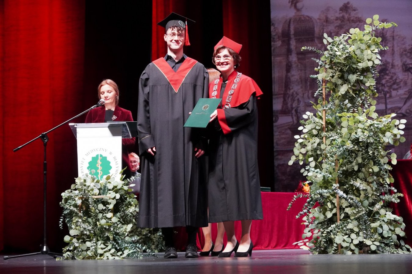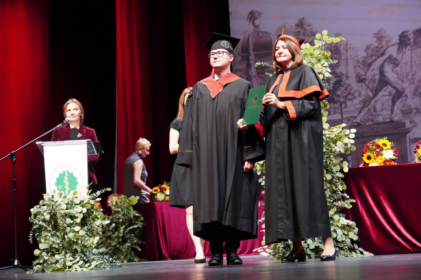 Prorektor ds. Kształcenia prof. Adrian Chabowski podkreślał emocje jakie towarzyszyły podczas studiowania: to był stres, frustracja, elementy związane z zaliczeniami i egzaminami, ale była też ambicja, żeby być lepszym, żeby poznać. I do tego potężny zasób satysfakcji: to ja to zrobiłem, to ja to osiągnąłem. I to zostanie z Wami, bo w Waszej przyszłej pracy będą te same emocje: stres, ambicja do dążenia w kierunku najlepszej diagnostyki, w kierunku najlepszego leczenia. I później to morze satysfakcji: to mój pacjent czuje się lepiej.