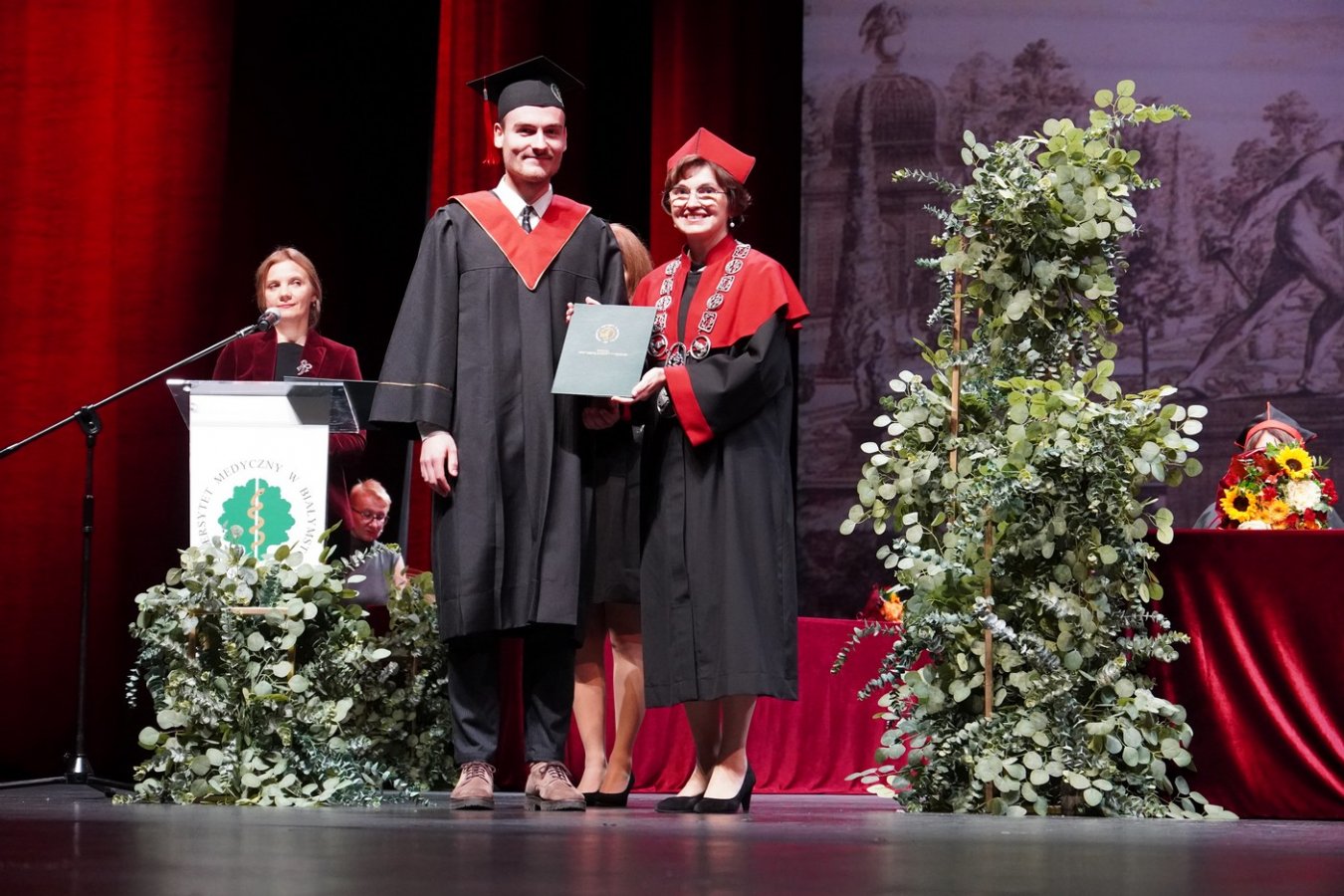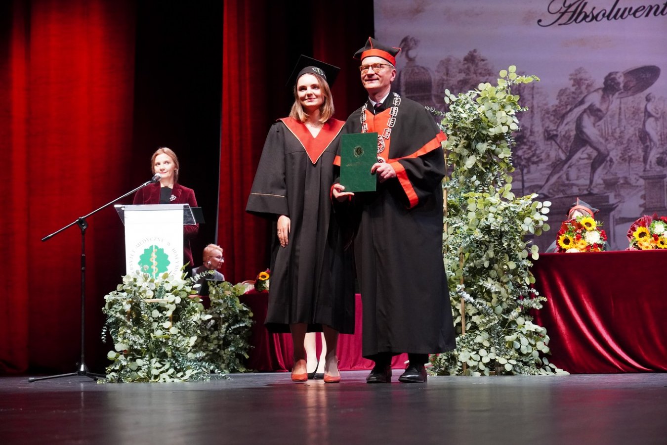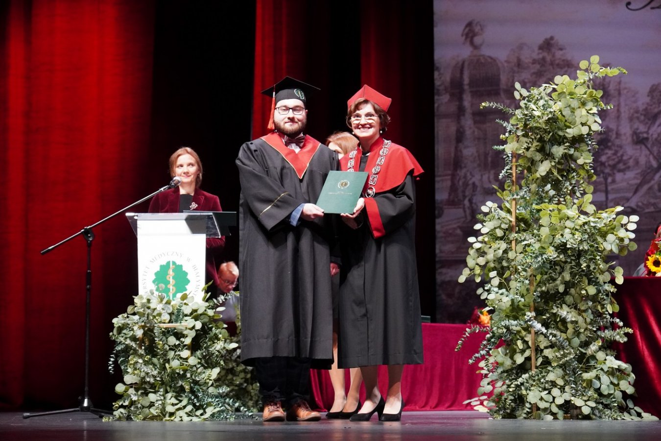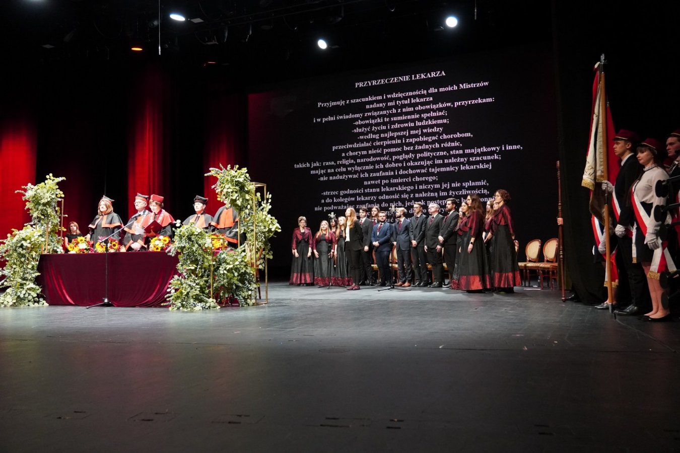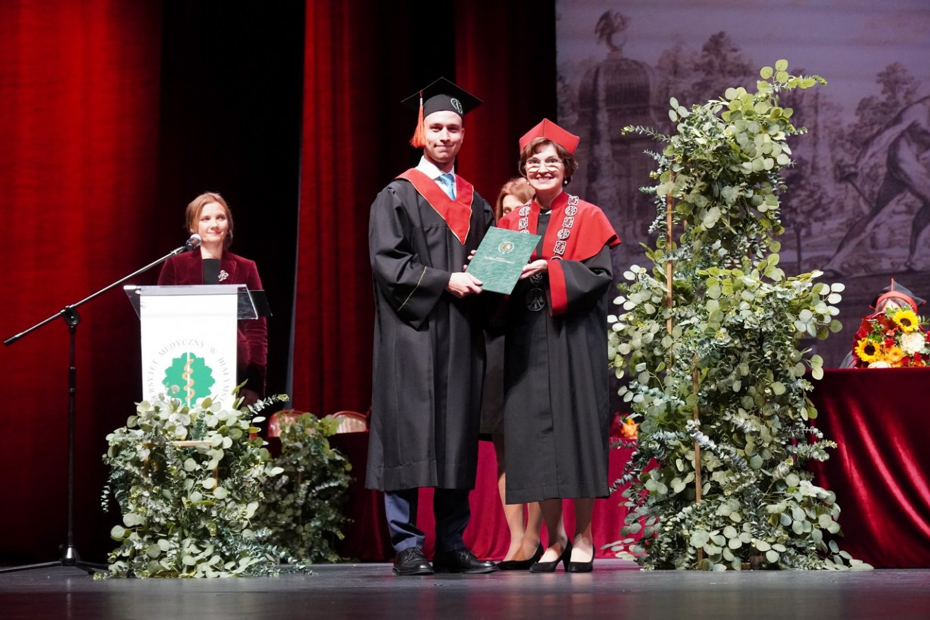 Prorektor ds. Kształcenia prof. Adrian Chabowski podkreślał emocje jakie towarzyszyły podczas studiowania: to był stres, frustracja, elementy związane z zaliczeniami i egzaminami, ale była też ambicja, żeby być lepszym, żeby poznać. I do tego potężny zasób satysfakcji: to ja to zrobiłem, to ja to osiągnąłem. I to zostanie z Wami, bo w Waszej przyszłej pracy będą te same emocje: stres, ambicja do dążenia w kierunku najlepszej diagnostyki, w kierunku najlepszego leczenia. I później to morze satysfakcji: to mój pacjent czuje się lepiej.