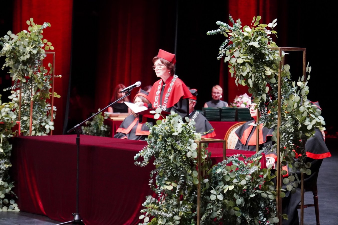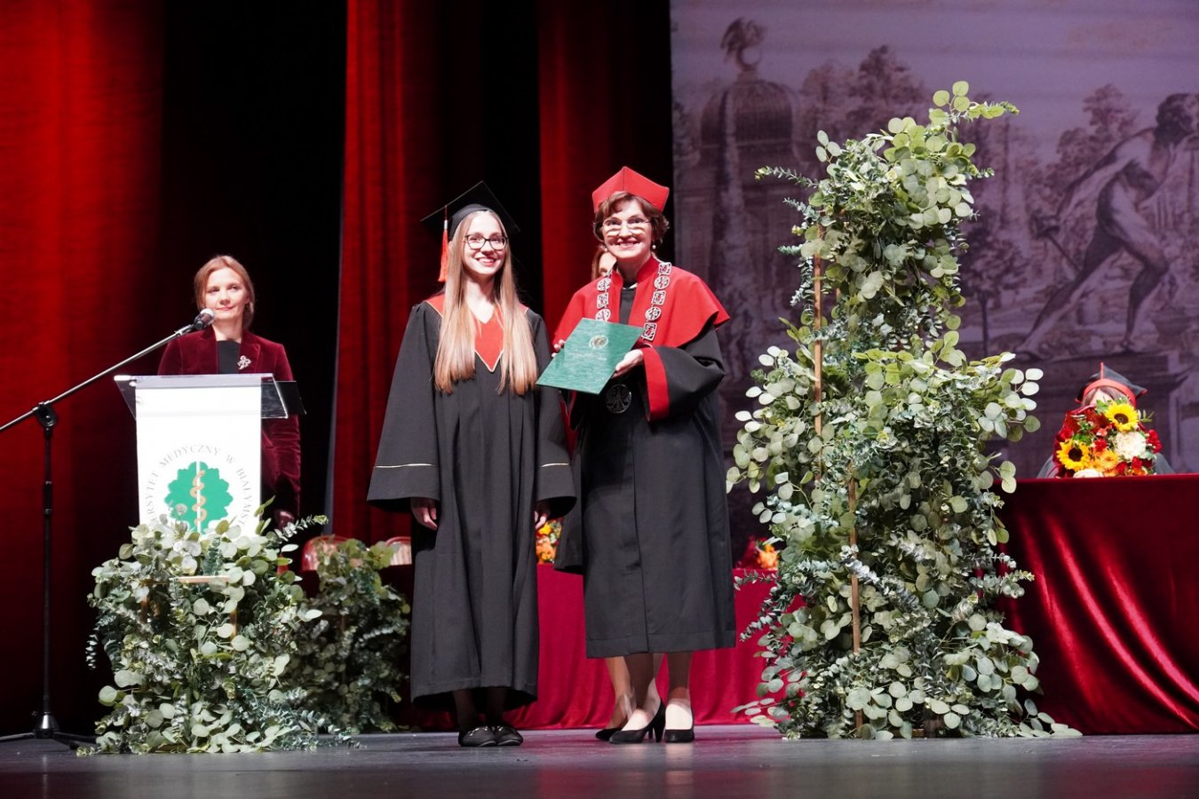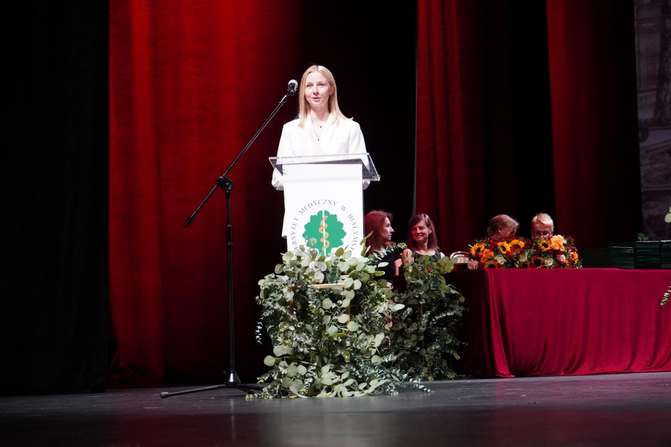 Prowadząca uroczystość, Prorektor ds. Nauki i Ewaluacji UMB prof. Irina Kowalska, przez 6 ostatnich lat Dziekan Wydziału Lekarskiego, gratulowała bardzo dobrze zdanego Lekarskiego Egzaminu Końcowego i mówiła: Jesteście już lekarzami, witamy Was wśród społeczności lekarskiej. Przed Wami fascynujący i inspirujący czas – czas decyzji i wyborów. Prof. Kowalska przyznała, że lata 2018-2024 to nie był łatwy czas do studiowania i kształcenia studentów. To był czas pandemii COVID 19, w tym okresie niepokój i niepewność przyniosła także wojna w Ukrainie. Słowa przyrzeczenia lekarskiego zawierają to wszystko, co w waszej przyszłej pracy będzie ważne: pomoc cierpiącym, zachowanie tajemnicy lekarskiej, konieczność ciągłego samokształcenia, dzielenie się wiedzą, mając jako najwyższy cel dobro chorego. Wykonywanie tego pięknego zawodu wiąże się z odpowiedzialnością, ale to także dar. Wasza praca zawsze będzie interesująca – posumowała Prorektor ds. Nauki i Ewaluacji.