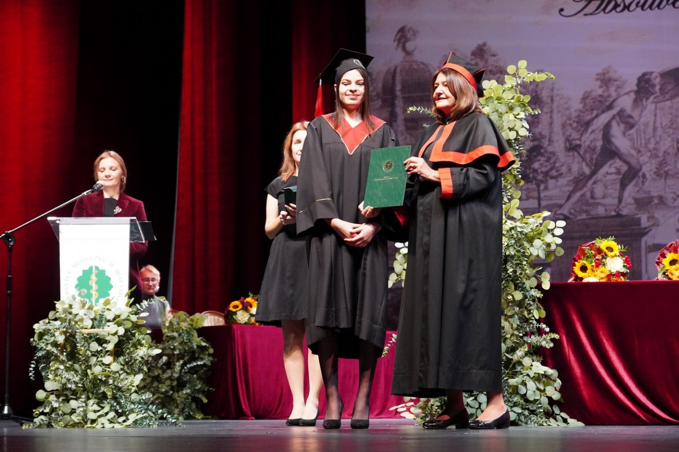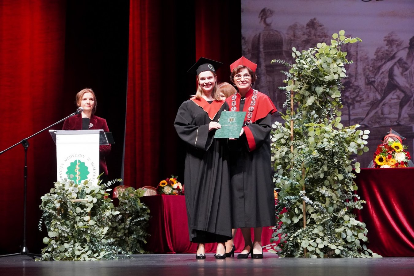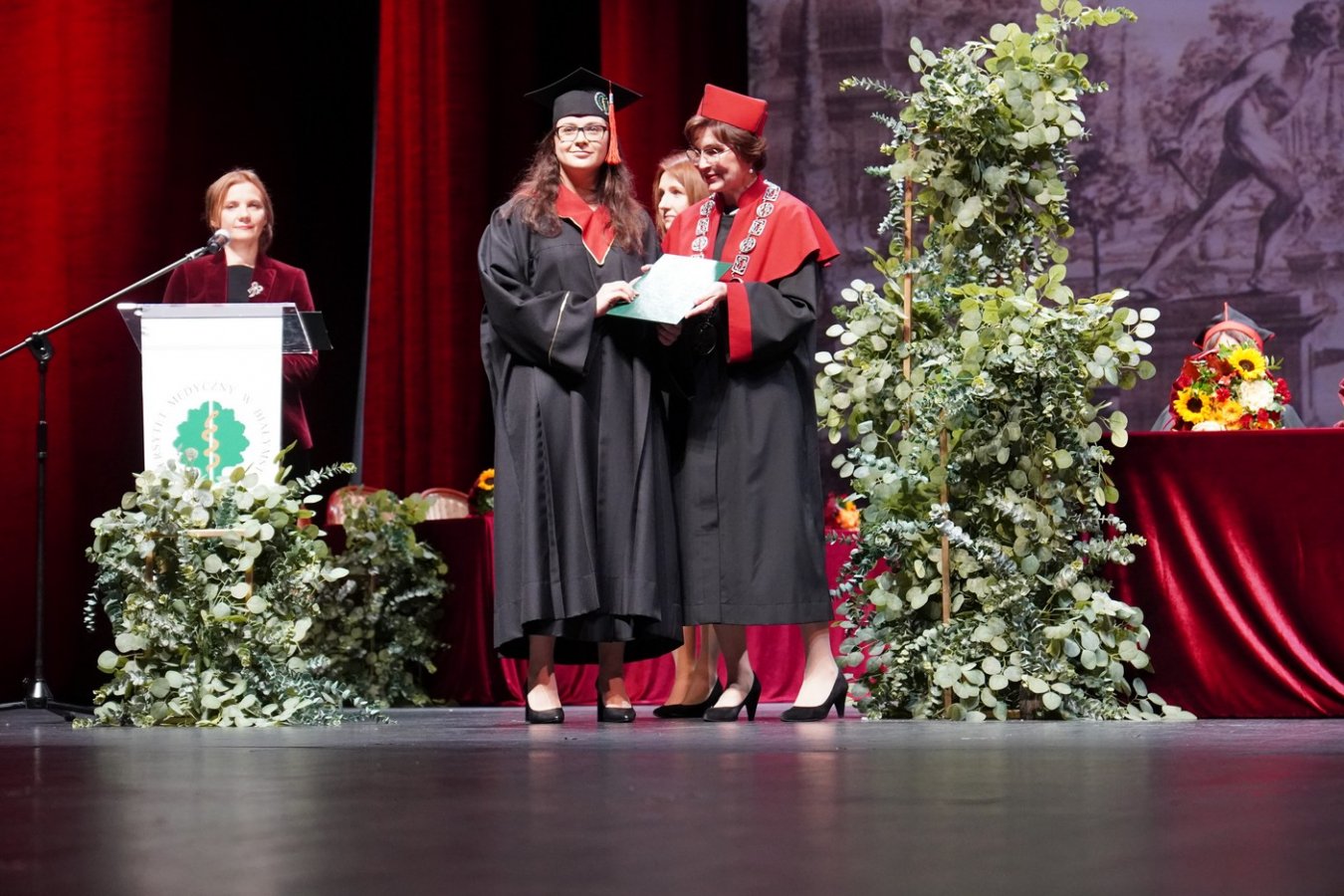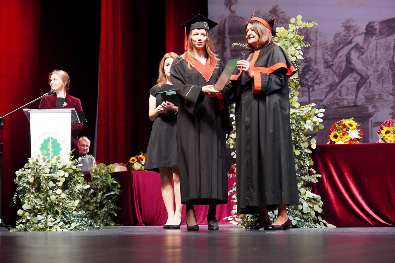 Starościna Weronika Piszcz przed wręczeniem dyplomów powiedziała: Kiedy spotkaliśmy się 6 lata temu nikt nie pomyślał, że ten czas tak szybko minie. Mam nadzieję, że nie ostatni raz widzimy się w takim gronie i będziemy pielęgnować kontakty i zawarte na studiach przyjaźnie. Cieszę się, że możemy wspólnie zakończyć jeden i rozpocząć kolejny bardzo ważny etap naszego życia. Na pewno długo będziemy wspominać tę długą podróż i ten wyjątkowy dzień. Były podziękowania bliskim i pracownikom dziekanatu oraz przede wszystkim nauczycielom akademickim, tym wszystkim, którzy przekazywali cenną wiedzą: dzięki nim jesteśmy lekarzami. Jesteśmy dumni z naszej Uczelni i mam nadzieję, że część z nas dalej będzie wspierała jej rozwój . Pozostaje nam zdawać egzaminy ze zdobytej wiedzy codziennie – przy pacjentach.