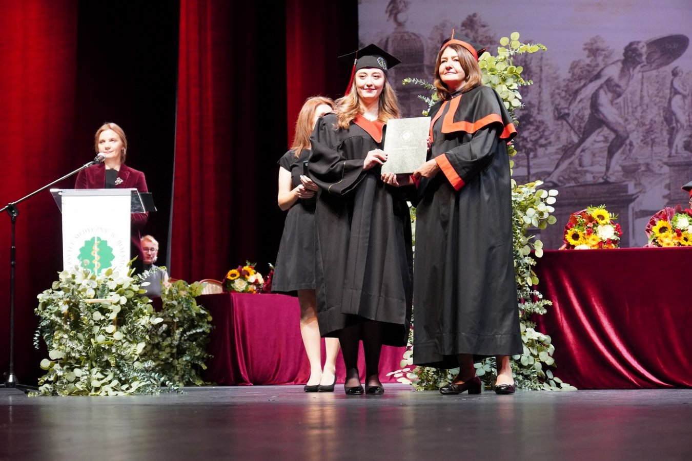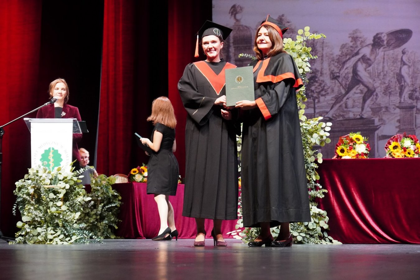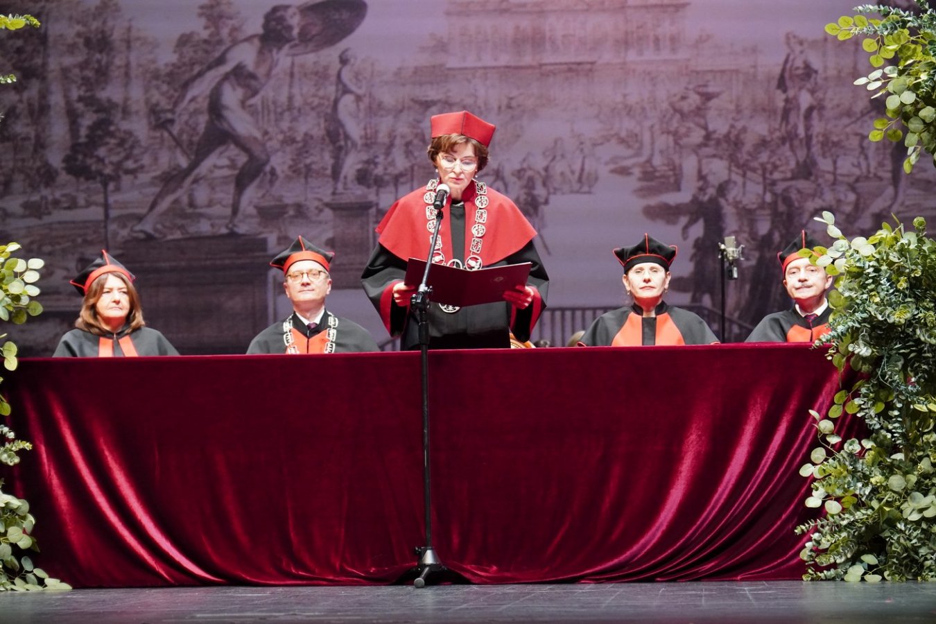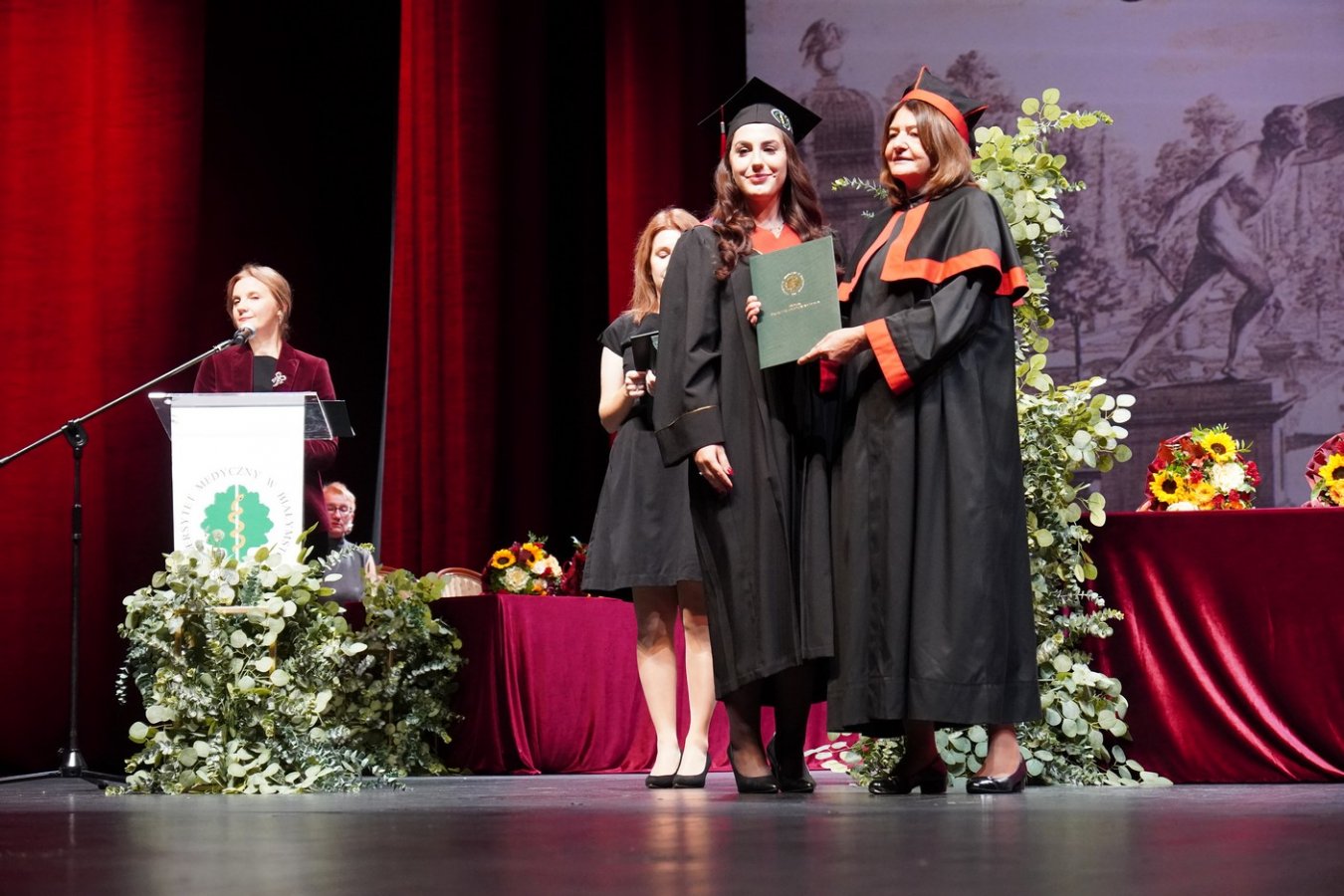 Starościna Weronika Piszcz przed wręczeniem dyplomów powiedziała: Kiedy spotkaliśmy się 6 lata temu nikt nie pomyślał, że ten czas tak szybko minie. Mam nadzieję, że nie ostatni raz widzimy się w takim gronie i będziemy pielęgnować kontakty i zawarte na studiach przyjaźnie. Cieszę się, że możemy wspólnie zakończyć jeden i rozpocząć kolejny bardzo ważny etap naszego życia. Na pewno długo będziemy wspominać tę długą podróż i ten wyjątkowy dzień. Były podziękowania bliskim i pracownikom dziekanatu oraz przede wszystkim nauczycielom akademickim, tym wszystkim, którzy przekazywali cenną wiedzą: dzięki nim jesteśmy lekarzami. Jesteśmy dumni z naszej Uczelni i mam nadzieję, że część z nas dalej będzie wspierała jej rozwój . Pozostaje nam zdawać egzaminy ze zdobytej wiedzy codziennie – przy pacjentach.